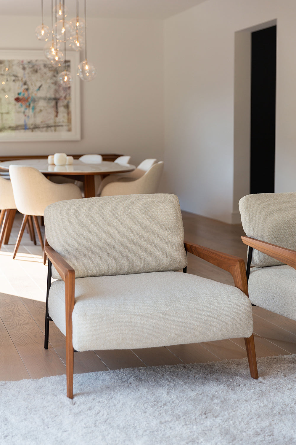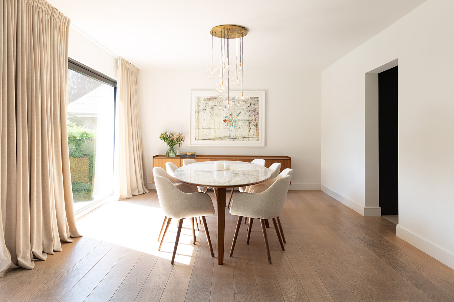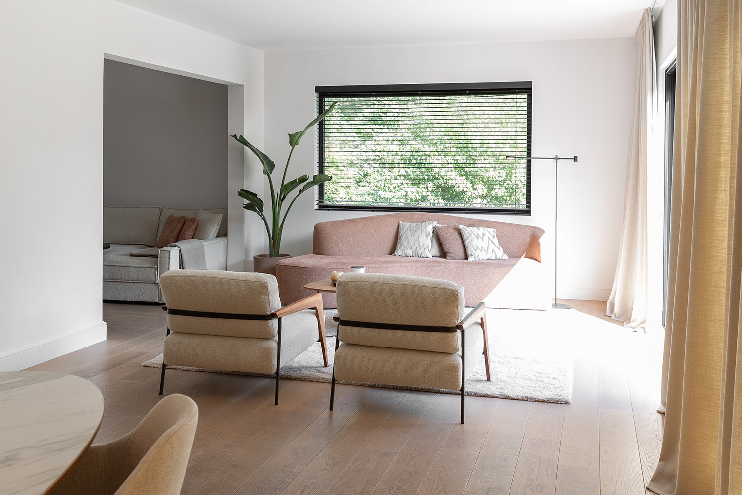 Een harmonieus interieur project waarbij de meubels naadloos op elkaar aansluiten, creëert een gevoel van eenheid en continuïteit doorheen de verschillende ruimtes. Het gebruik van notelaar brengt een gevoel van natuurlijke elegantie en tijdloze klasse, terwijl het ook staat voor duurzaamheid en sterkte. De subtiele oud roze accenten vormen een verfijnde aanvulling op het rijke notelaar, en dragen bij aan een warme en uitnodigende sfeer. Dit alles komt samen in een interieur dat niet alleen esthetisch aangenaam is, maar ook een gevoel van thuis zijn en comfort biedt. Elk element is zorgvuldig gekozen om bij te dragen aan een coherente en gastvrije leefomgeving, waar men zich onmiddellijk thuis voelt.