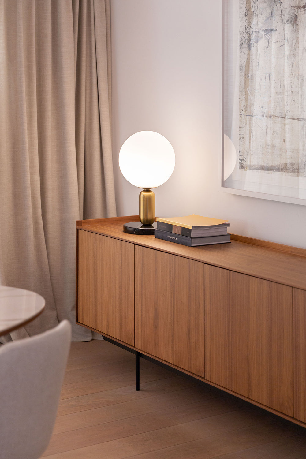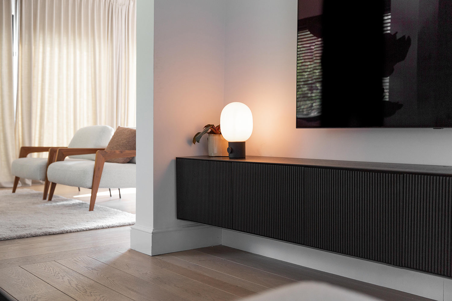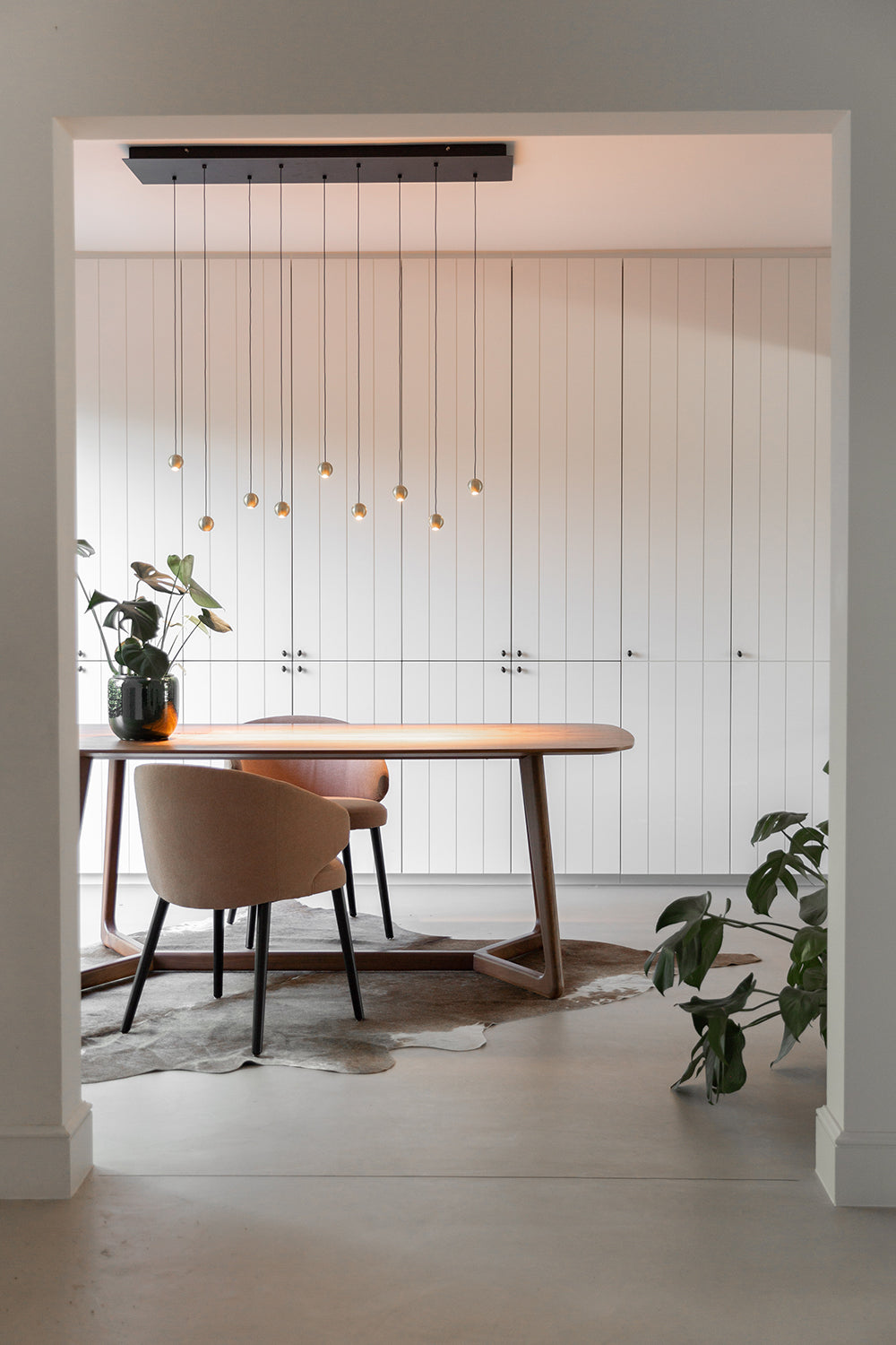 Een harmonieus interieur project waarbij de meubels naadloos op elkaar aansluiten, creëert een gevoel van eenheid en continuïteit doorheen de verschillende ruimtes. Het gebruik van notelaar brengt een gevoel van natuurlijke elegantie en tijdloze klasse, terwijl het ook staat voor duurzaamheid en sterkte. De subtiele oud roze accenten vormen een verfijnde aanvulling op het rijke notelaar, en dragen bij aan een warme en uitnodigende sfeer. Dit alles komt samen in een interieur dat niet alleen esthetisch aangenaam is, maar ook een gevoel van thuis zijn en comfort biedt. Elk element is zorgvuldig gekozen om bij te dragen aan een coherente en gastvrije leefomgeving, waar men zich onmiddellijk thuis voelt.
