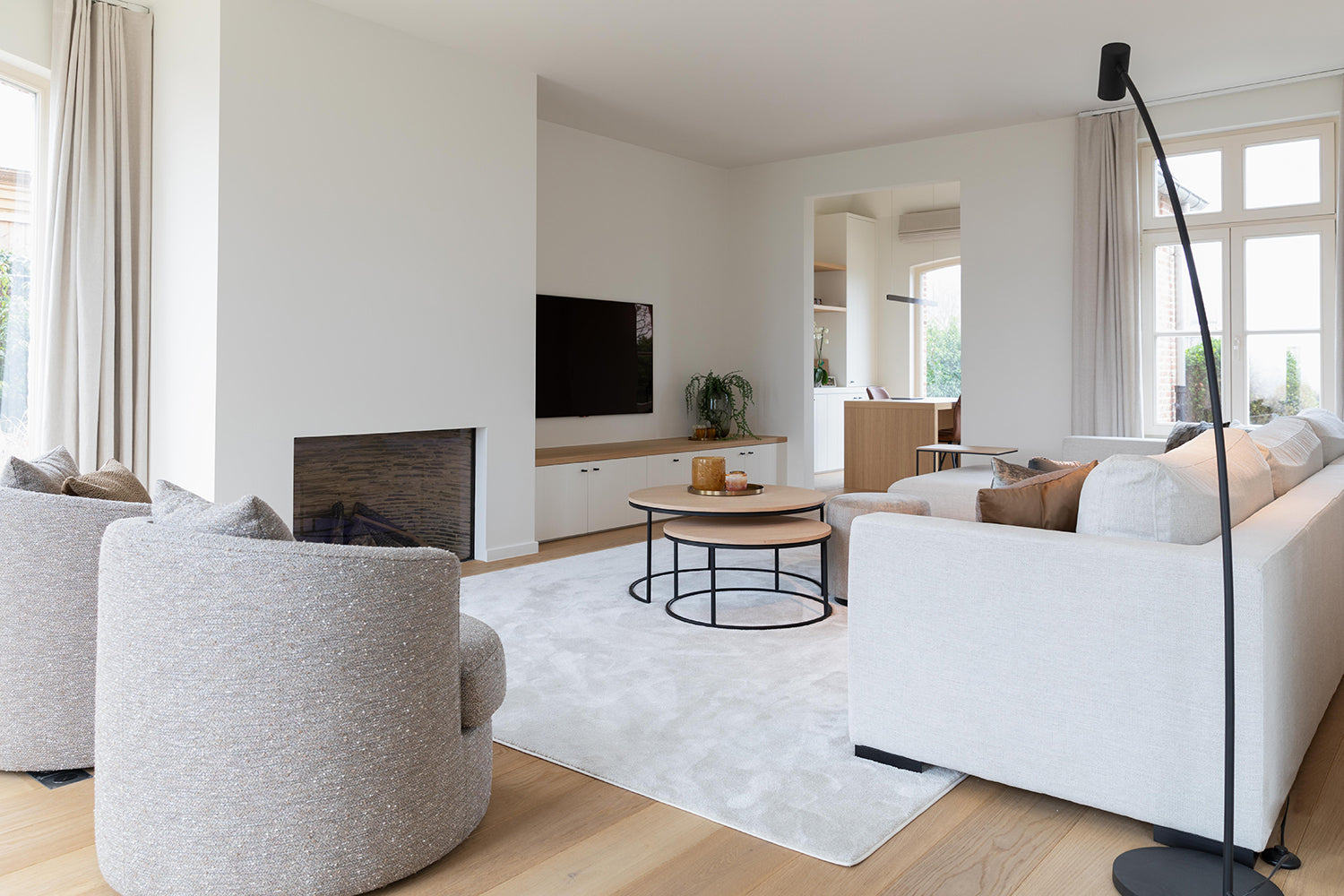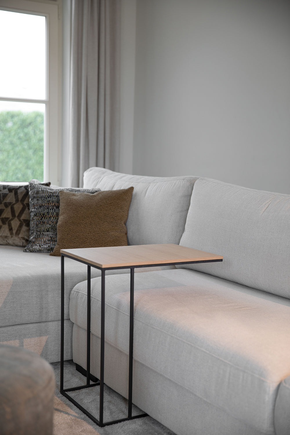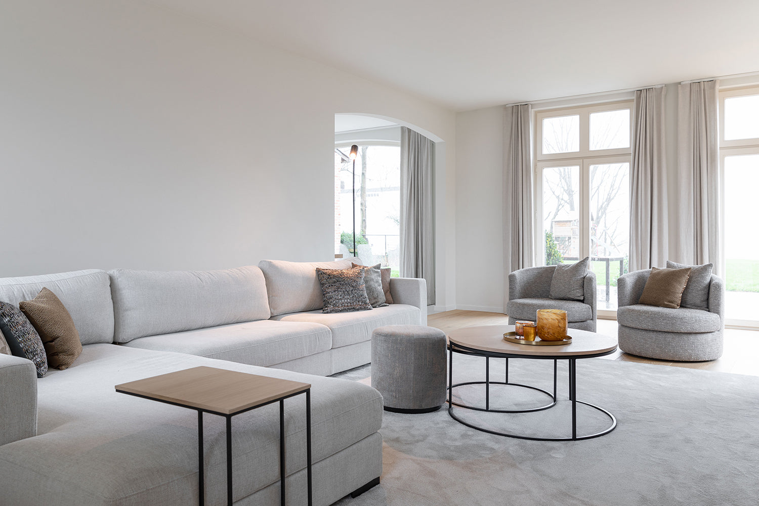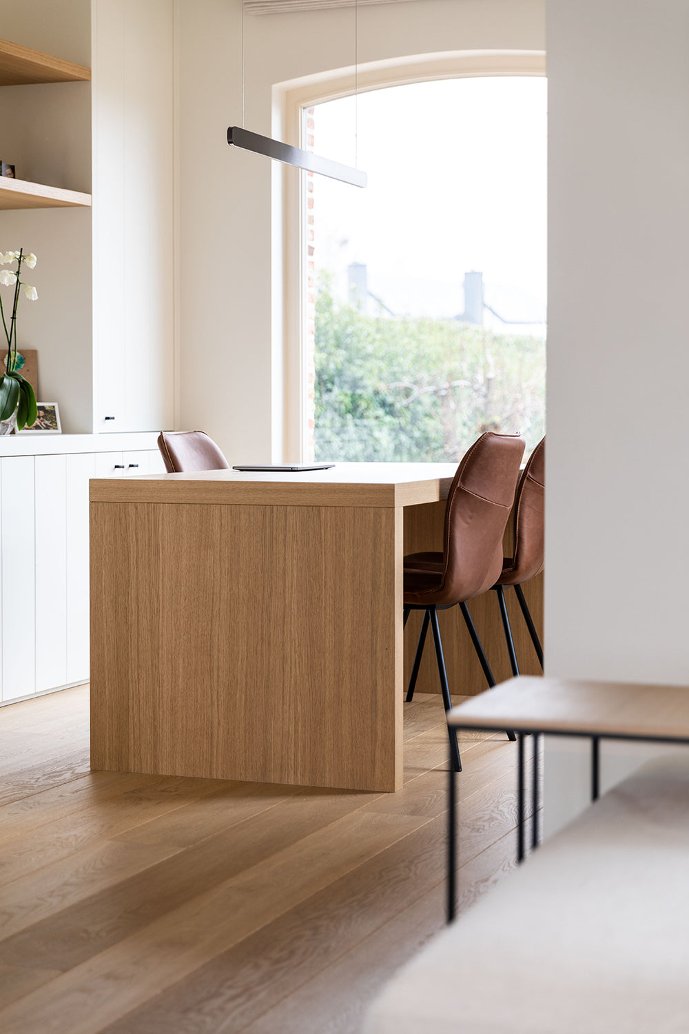 Het concept van een centrale gezinssofa Citizen als kloppend hart van een woonruimte is een prachtige keuze die gezelligheid en samenzijn bevordert. De consistentie van natuurlijk eikenhout door het hele huis draagt bij aan een gevoel van eenheid en harmonie, terwijl het ook een warme en zachte uitstraling geeft. Het gebruik van ronde vormen in meubelstukken zoals de salontafel Todd en seats Ios voegt een speels en uitnodigend element toe aan het ontwerp. Deze elementen samen creëren een ruimte die niet alleen esthetisch aangenaam is, maar ook functioneel en uitnodigend voor alle gezinsleden. Het is duidelijk dat er zorgvuldig nagedacht is over elk detail om een omgeving te scheppen waarin men zich onmiddellijk thuis voelt.