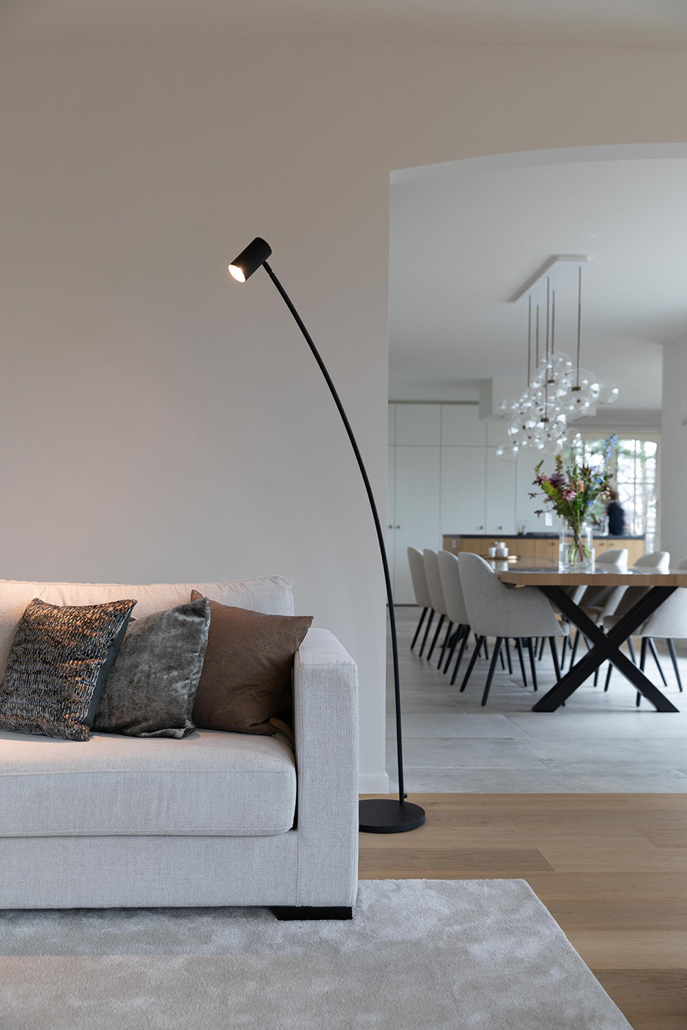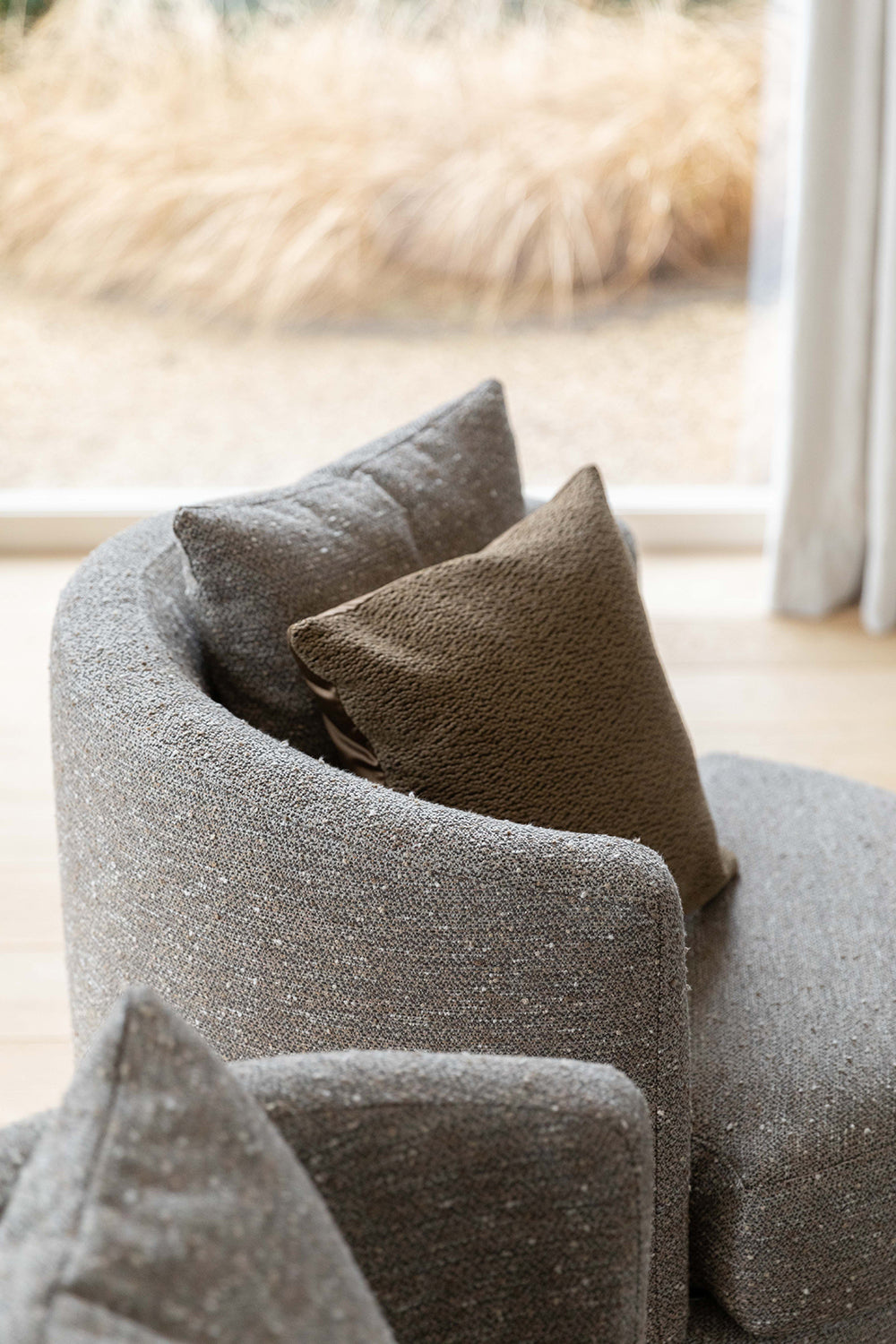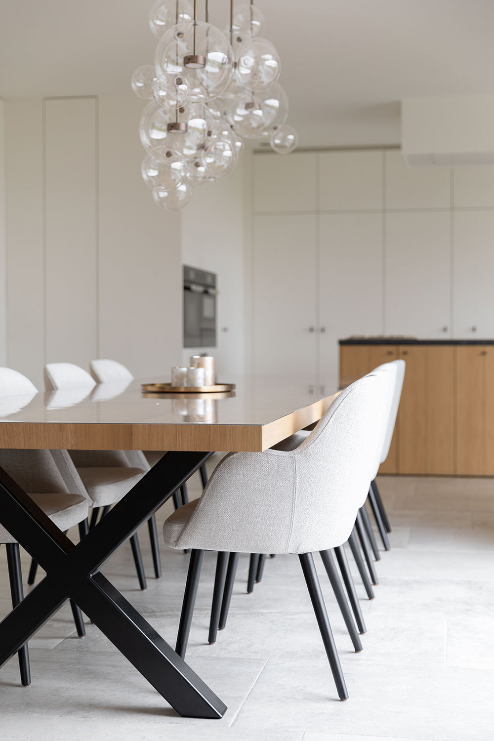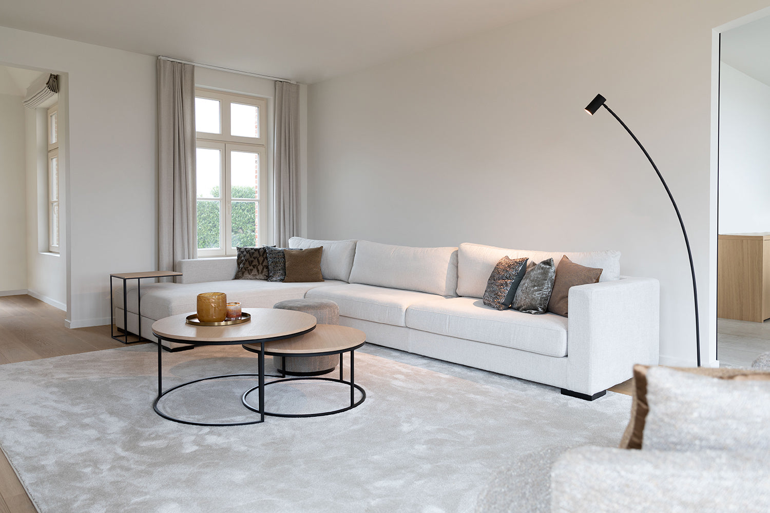 Het concept van een centrale gezinssofa Citizen als kloppend hart van een woonruimte is een prachtige keuze die gezelligheid en samenzijn bevordert. De consistentie van natuurlijk eikenhout door het hele huis draagt bij aan een gevoel van eenheid en harmonie, terwijl het ook een warme en zachte uitstraling geeft. Het gebruik van ronde vormen in meubelstukken zoals de salontafel Todd en seats Ios voegt een speels en uitnodigend element toe aan het ontwerp. Deze elementen samen creëren een ruimte die niet alleen esthetisch aangenaam is, maar ook functioneel en uitnodigend voor alle gezinsleden. Het is duidelijk dat er zorgvuldig nagedacht is over elk detail om een omgeving te scheppen waarin men zich onmiddellijk thuis voelt.