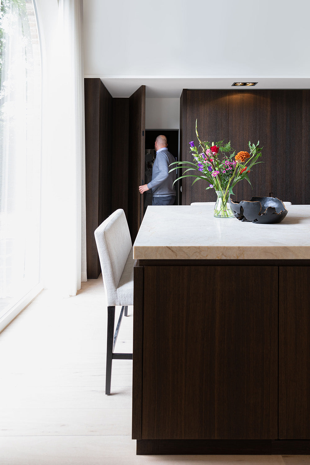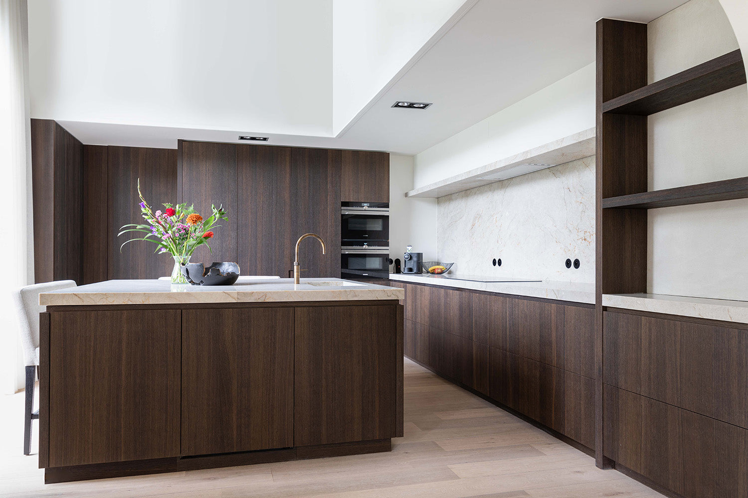 Een prachtig renovatieproject waarbij elke ruimte in de woning harmonieus op elkaar is afgestemd, kan een ware metamorfose teweegbrengen. Het gebruik van warm, donker hout in combinatie met marmer voegt een sterk karakter toe aan het interieur, terwijl het contrast met lichte meubels voor een evenwichtige en uitnodigende sfeer zorgt. Okergele accenten staan voor warmte en energie, en geven de ruimte een levendige uitstraling. Dit soort doordachte ontwerpkeuzes creëren een interieurparel die tijdloze klasse uitstraalt en een unieke, persoonlijke touch aan de woning geeft. Het resultaat is een ruimte waarin esthetiek en comfort samenkomen, waardoor een huis echt als een thuis aanvoelt.