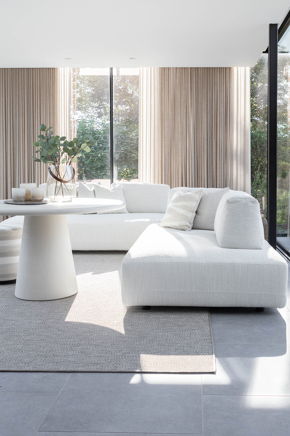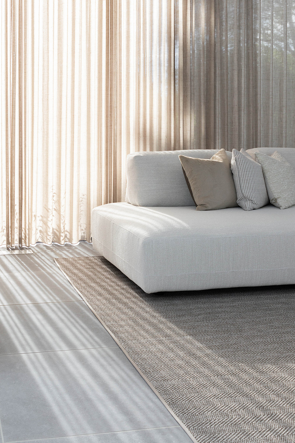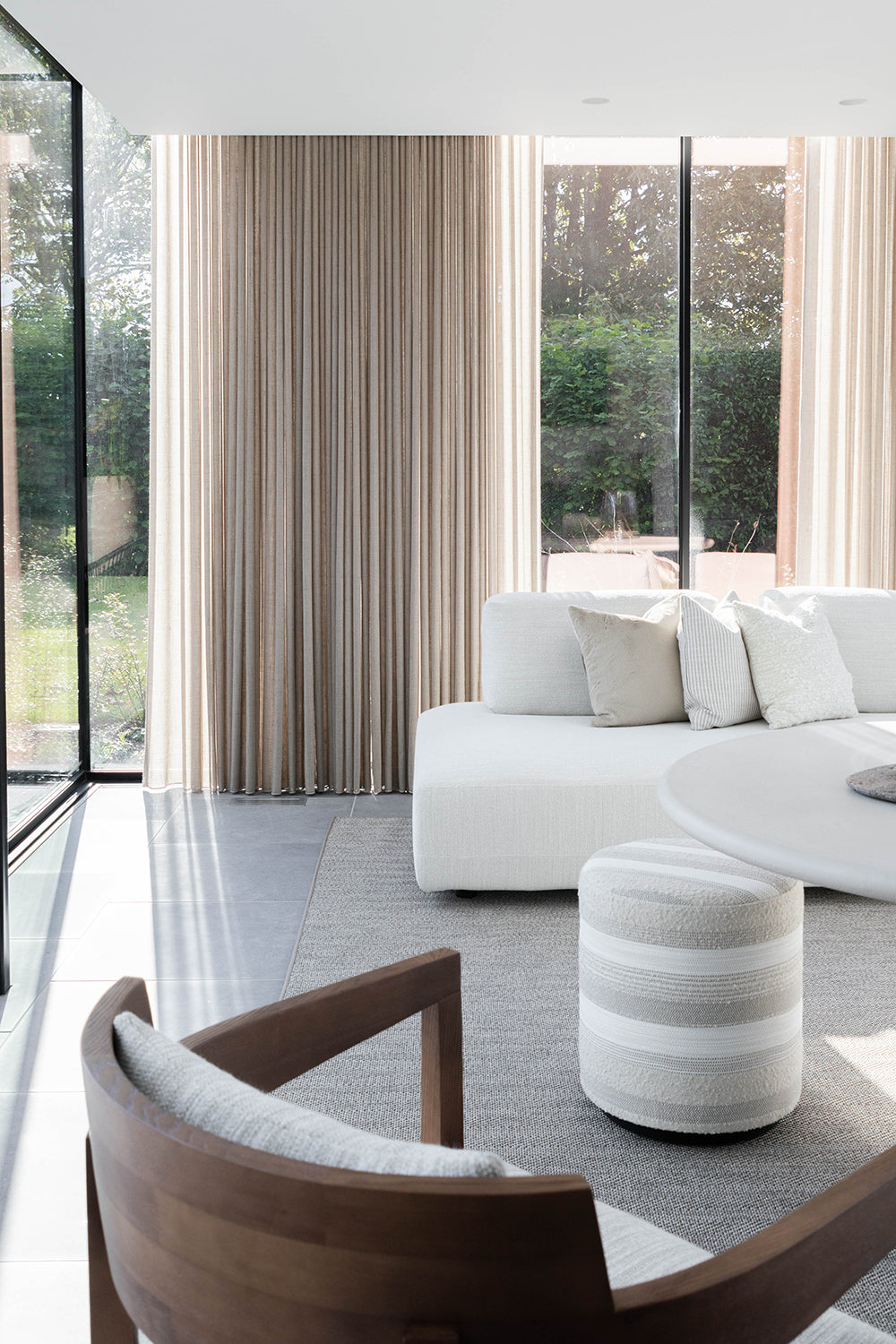 Dit prachtige interieurproject van een op maat ontworpen poolhouse is een perfecte balans tussen stijl, functionaliteit en comfort. Voor de klant is een ruimte gecreëerd die niet alleen esthetisch aantrekkelijk is, maar ook bestand tegen de uitdagingen van een buitenomgeving. De gekozen high performance stoffen voor de meubels zijn niet alleen waterbestendig, maar ook slijtvast, zodat ze jarenlang mee gaan, zelfs bij intensief gebruik. Het buitentapijt voegt extra gezelligheid toe aan de ruimte, terwijl het materiaal bestand is tegen slijtage en de elementen, waardoor het perfect is voor buitengebruik. De tafel, vervaardigd uit Mortex, is een echt statement. Dit innovatieve materiaal heeft de voordelen van hoge slijtvastheid, waterbestendigheid en een prachtig mat, betonachtig uiterlijk. Het is ideaal voor buitengebruik omdat het onderhoudsvriendelijk is en er toch luxe uitziet. De stoelen, gemaakt van donker hout, creëren een mooi visueel contrast met de lichte materialen en zorgen voor een warme, uitnodigende sfeer. Het geheel biedt een verfijnde, maar praktische omgeving voor ontspanning en sociale momenten in het poolhouse.