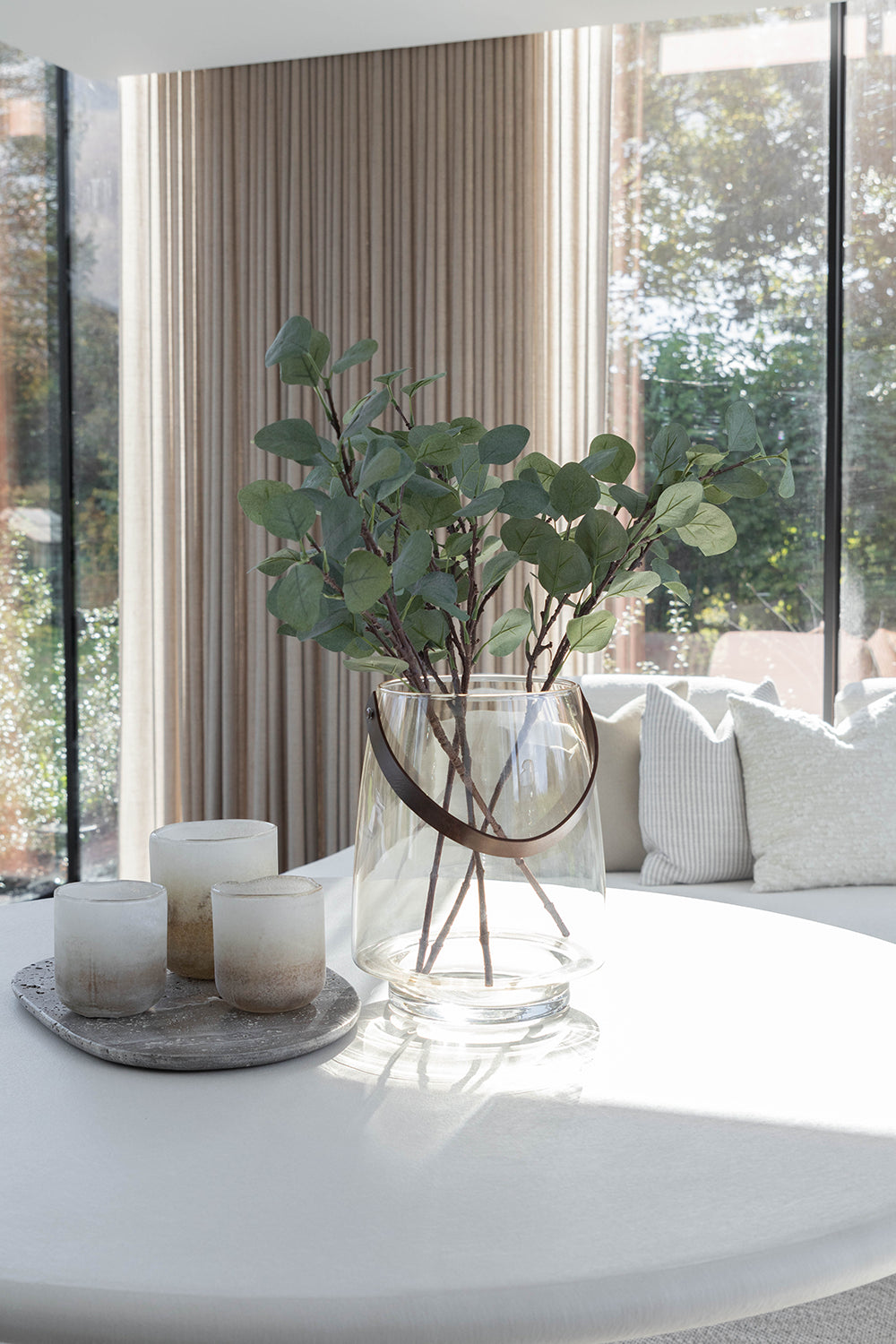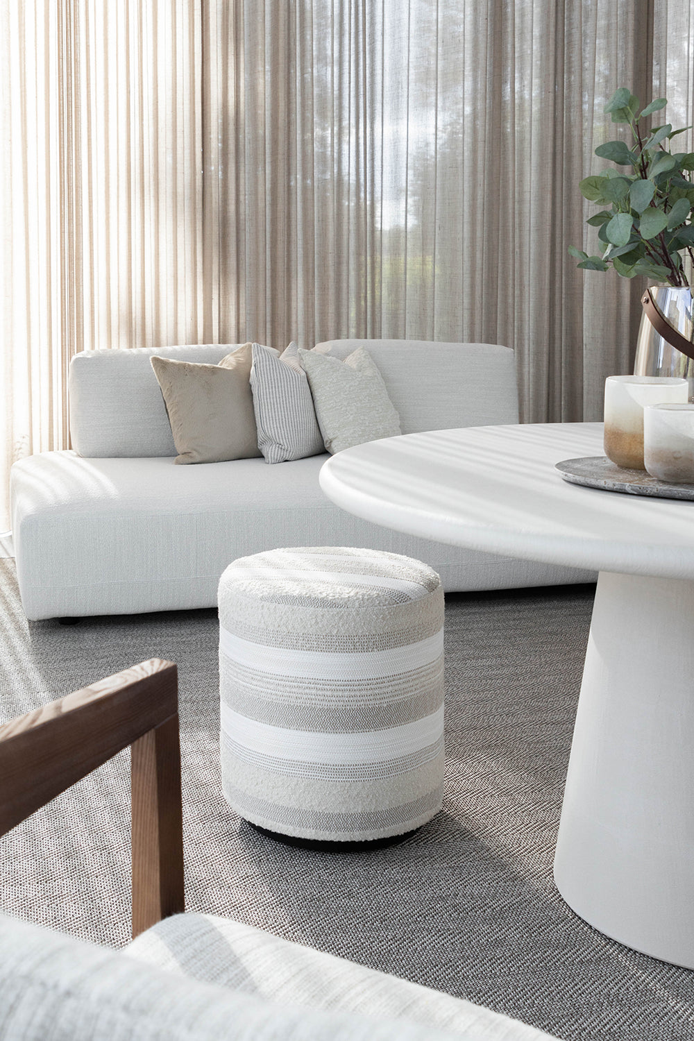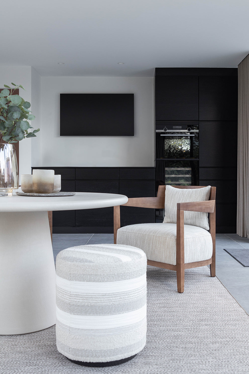 Dit prachtige interieurproject van een op maat ontworpen poolhouse is een perfecte balans tussen stijl, functionaliteit en comfort. Voor de klant is een ruimte gecreëerd die niet alleen esthetisch aantrekkelijk is, maar ook bestand tegen de uitdagingen van een buitenomgeving. De gekozen high performance stoffen voor de meubels zijn niet alleen waterbestendig, maar ook slijtvast, zodat ze jarenlang mee gaan, zelfs bij intensief gebruik. Het buitentapijt voegt extra gezelligheid toe aan de ruimte, terwijl het materiaal bestand is tegen slijtage en de elementen, waardoor het perfect is voor buitengebruik. De tafel, vervaardigd uit Mortex, is een echt statement. Dit innovatieve materiaal heeft de voordelen van hoge slijtvastheid, waterbestendigheid en een prachtig mat, betonachtig uiterlijk. Het is ideaal voor buitengebruik omdat het onderhoudsvriendelijk is en er toch luxe uitziet. De stoelen, gemaakt van donker hout, creëren een mooi visueel contrast met de lichte materialen en zorgen voor een warme, uitnodigende sfeer. Het geheel biedt een verfijnde, maar praktische omgeving voor ontspanning en sociale momenten in het poolhouse.