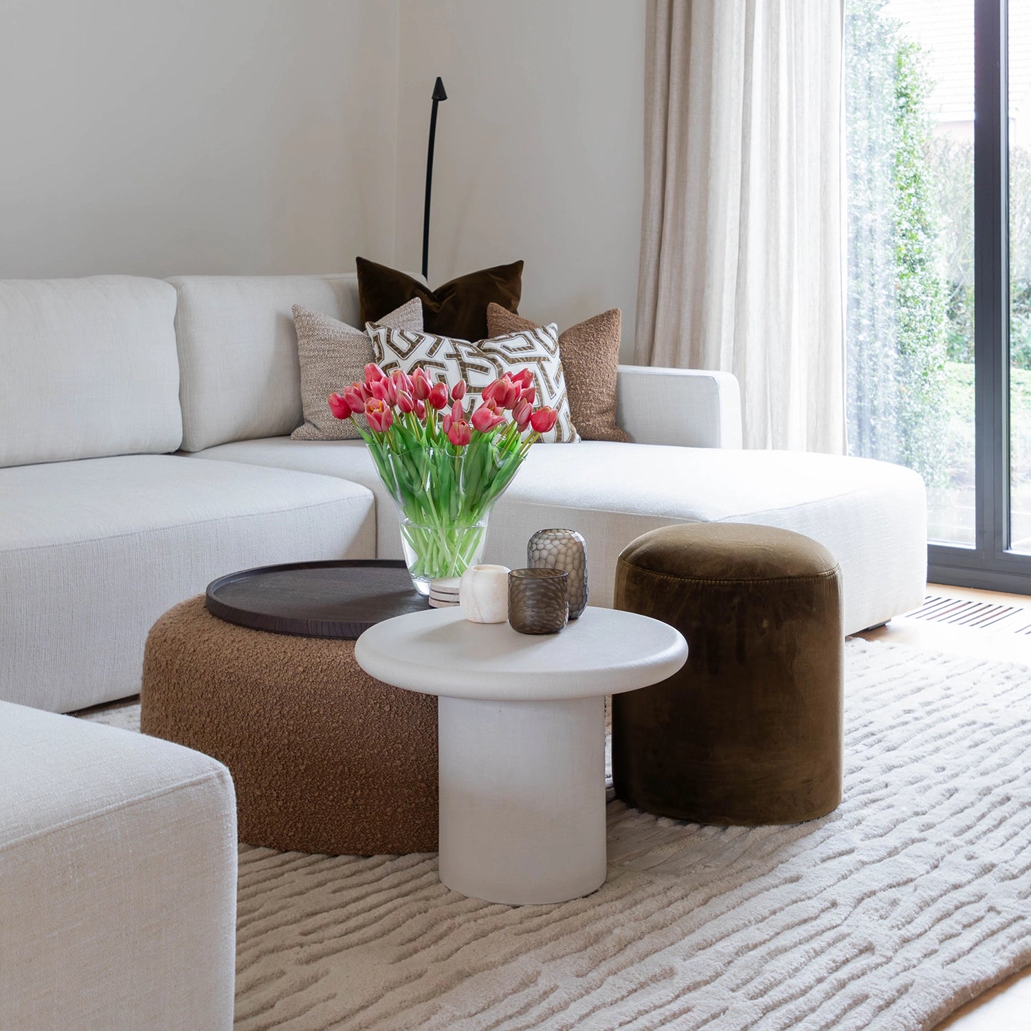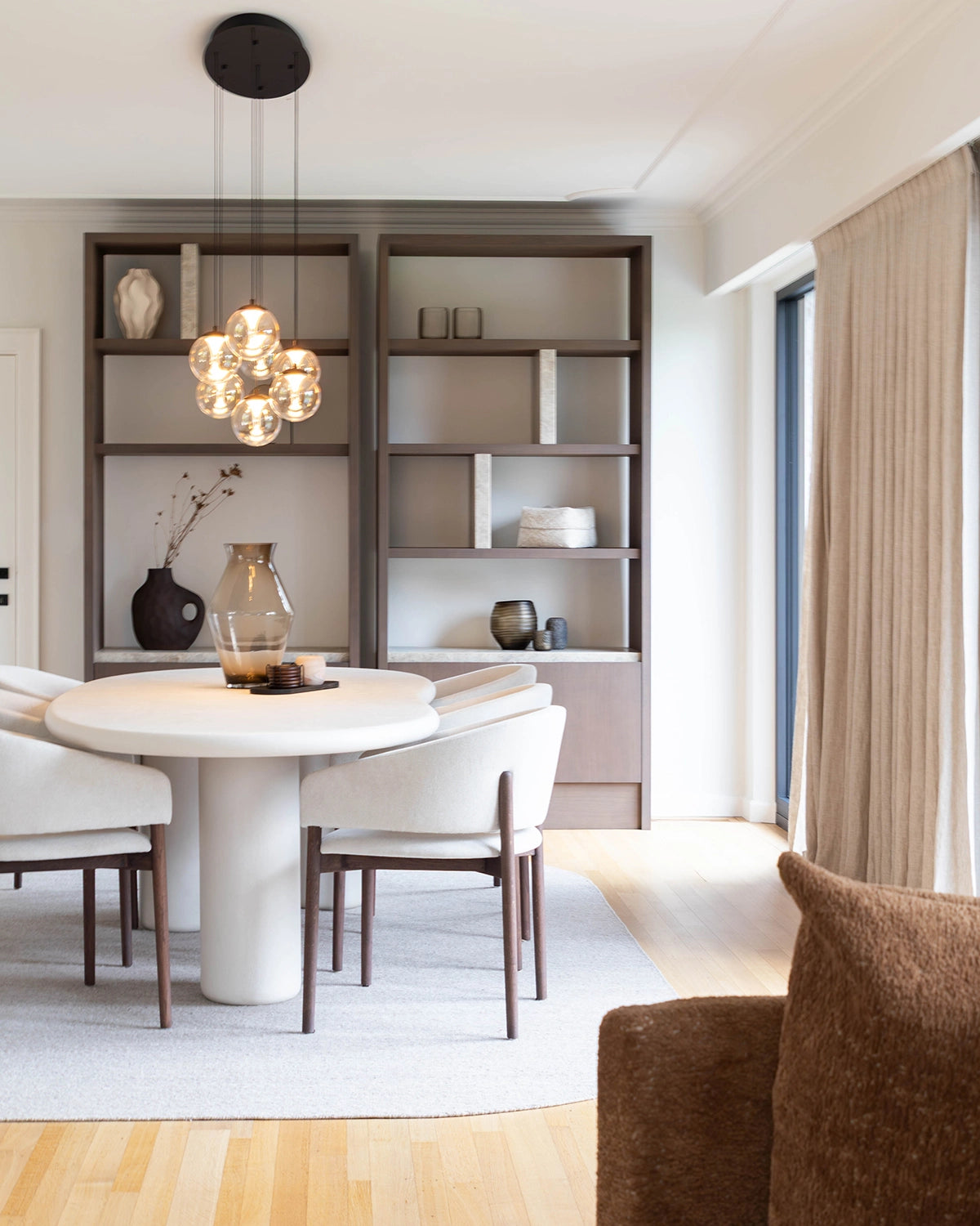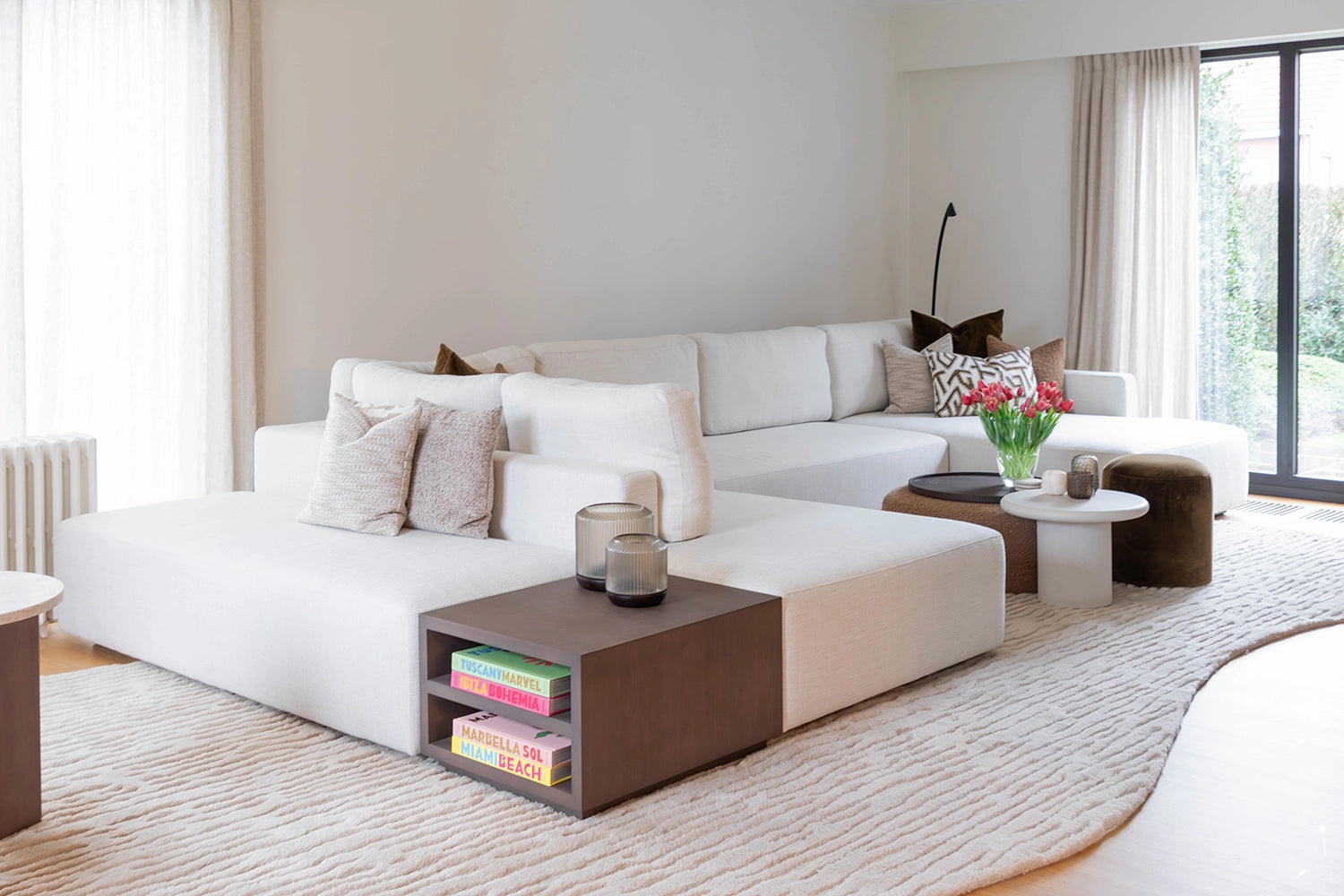 Voor Joris, beter bekend als Metejoor, mochten we een leefruimte ontwerpen die volledig klopt met wie hij is. Warm, stijlvol en tot in de details doordacht. De ruimte werd volledig vernieuwd rond één centraal element: een royale zetel met dubbele zitting die naadloos overgaat in een uitnodigend loungehoekje. Een plek om te ontspannen, tot rust te komen en tegelijk mensen te ontvangen. Daarnaast ontwierpen we twee volledig op maat gemaakte wandkasten. De combinatie van Taj Mahal-marmer en donker hout zorgt voor een tijdloze elegantie en geeft de ruimte karakter zonder te overheersen. Functionaliteit en esthetiek vloeien hier moeiteloos in elkaar over. Een interieur dat niet alleen mooi is om naar te kijken, maar vooral gemaakt is om in te leven.