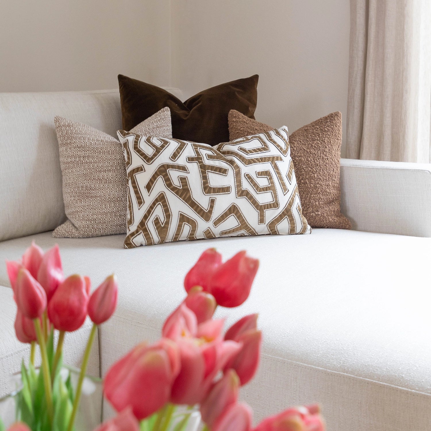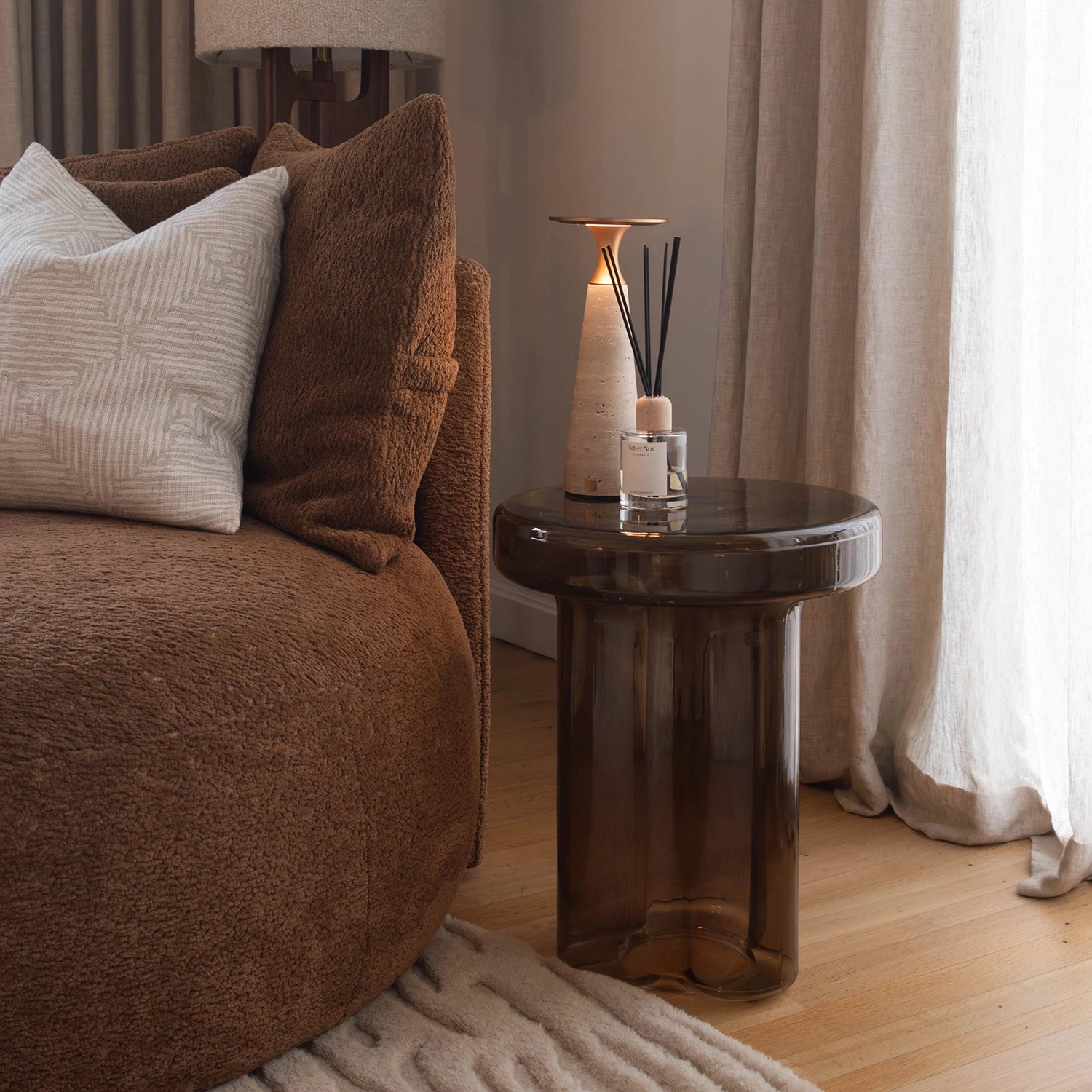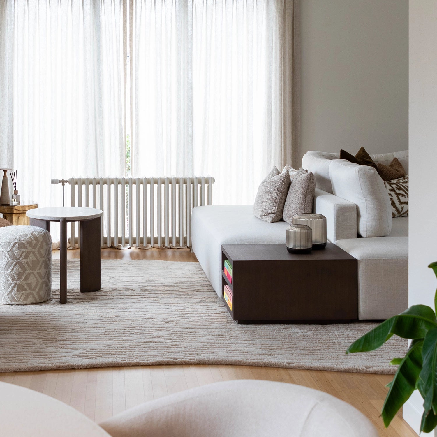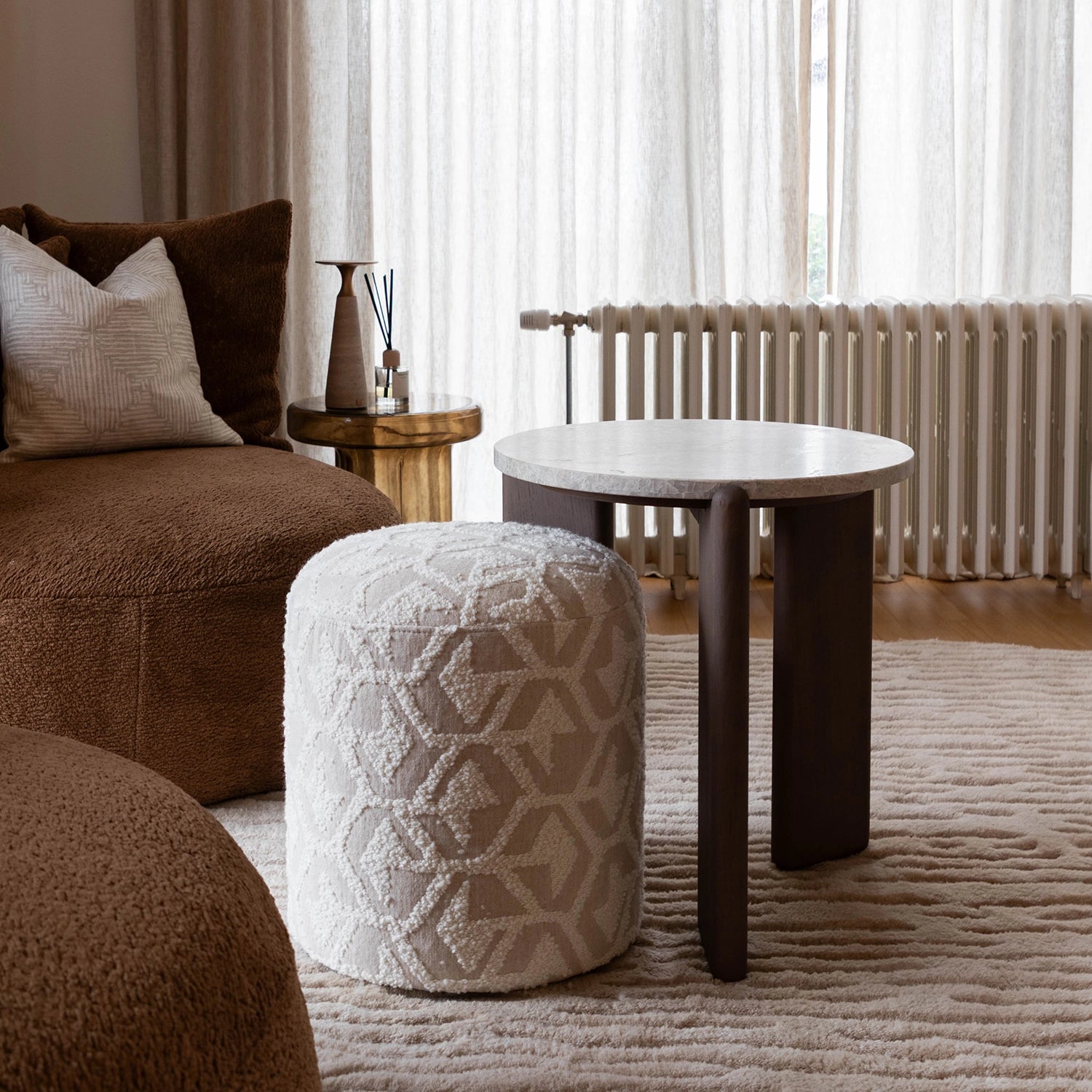 Voor Joris, beter bekend als Metejoor, mochten we een leefruimte ontwerpen die volledig klopt met wie hij is. Warm, stijlvol en tot in de details doordacht. De ruimte werd volledig vernieuwd rond één centraal element: een royale zetel met dubbele zitting die naadloos overgaat in een uitnodigend loungehoekje. Een plek om te ontspannen, tot rust te komen en tegelijk mensen te ontvangen. Daarnaast ontwierpen we twee volledig op maat gemaakte wandkasten. De combinatie van Taj Mahal-marmer en donker hout zorgt voor een tijdloze elegantie en geeft de ruimte karakter zonder te overheersen. Functionaliteit en esthetiek vloeien hier moeiteloos in elkaar over. Een interieur dat niet alleen mooi is om naar te kijken, maar vooral gemaakt is om in te leven.