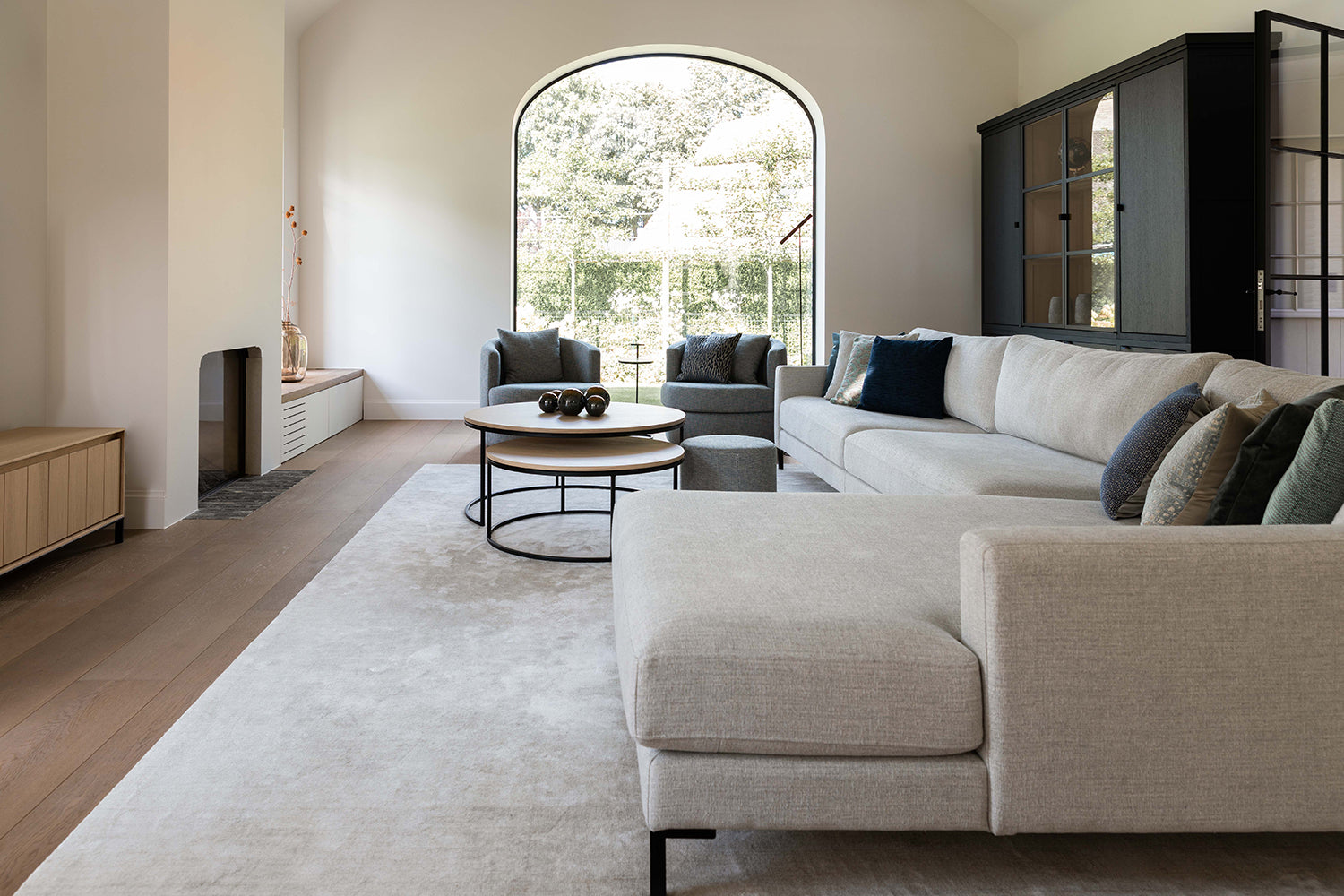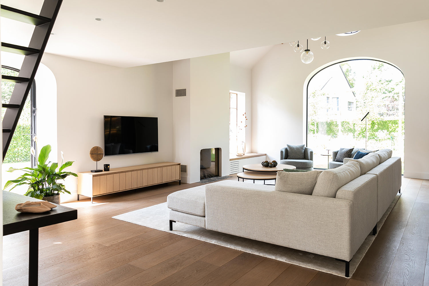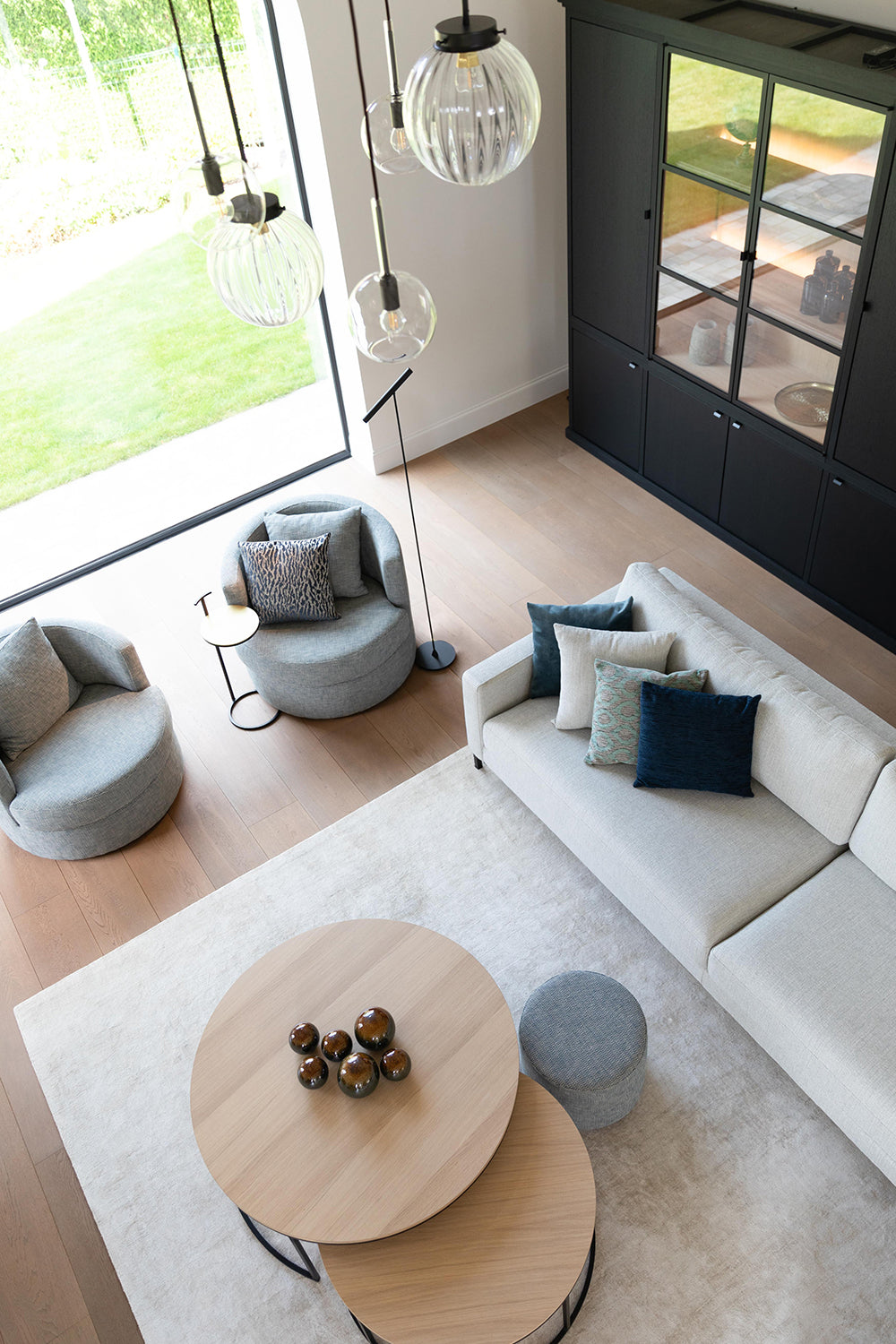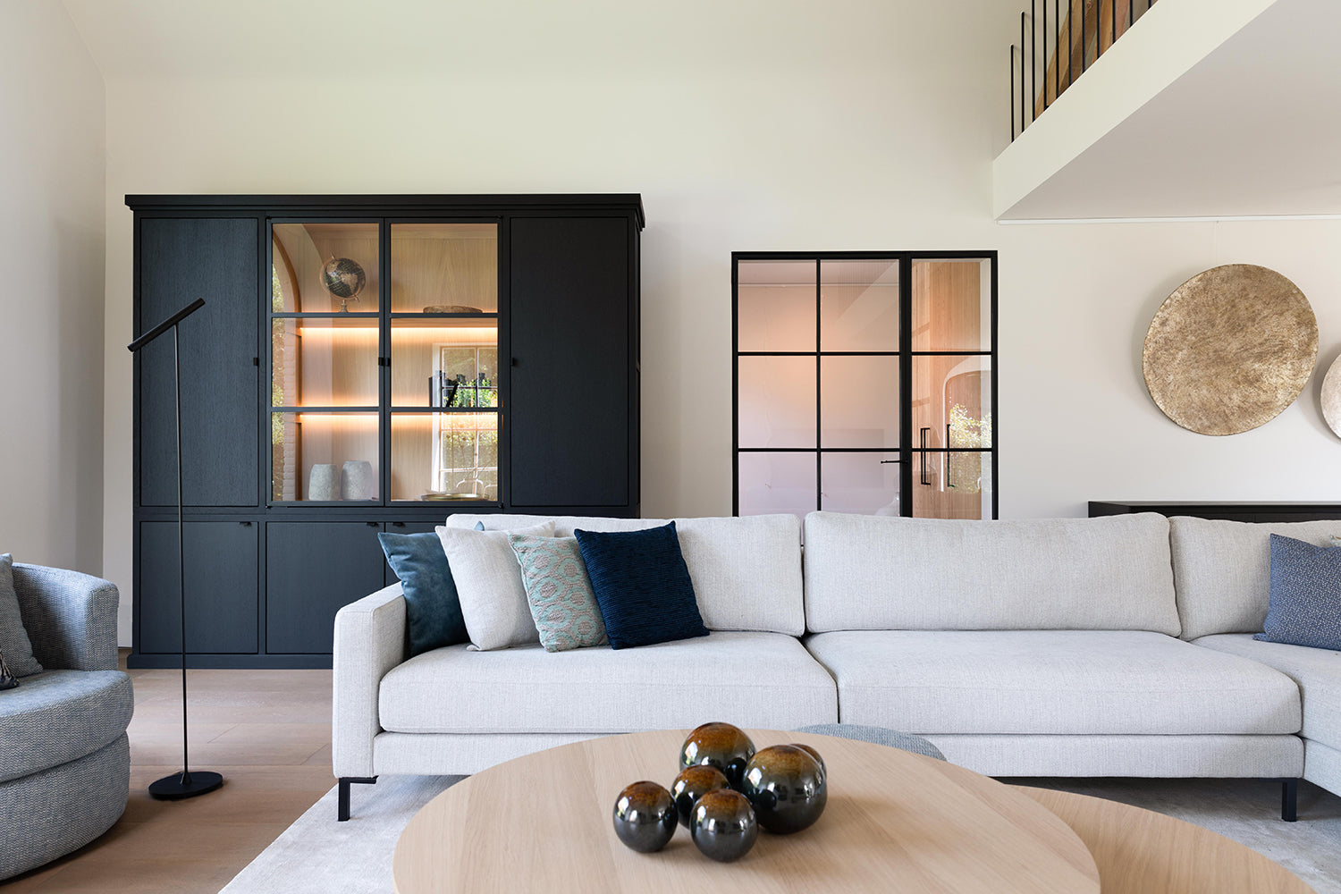 Deze transformatie van een oude garage naar een stijlvolle woonkamer is een prachtig voorbeeld van modern landelijk design. De keuze voor subtiele blauwe accenten geeft de ruimte een frisse en uitnodigende sfeer, terwijl de sofa Discovery op pootjes bijdraagt aan een gevoel van ruimtelijkheid en luchtigheid. Het gebruik van twee verschillende houttinten - naturel en zwart - creëert een harmonieuze balans tussen traditionele charme en hedendaagse elegantie. De zwarte houtkleur versterkt de moderne uitstraling en vormt een naadloze overgang naar de industriële stalen deuren, wat het geheel een uniek en samenhangend karakter geeft. Dit renovatieproject illustreert hoe met zorgvuldig gekozen designelementen een functionele ruimte kan worden omgetoverd in een warm en uitnodigend thuis.