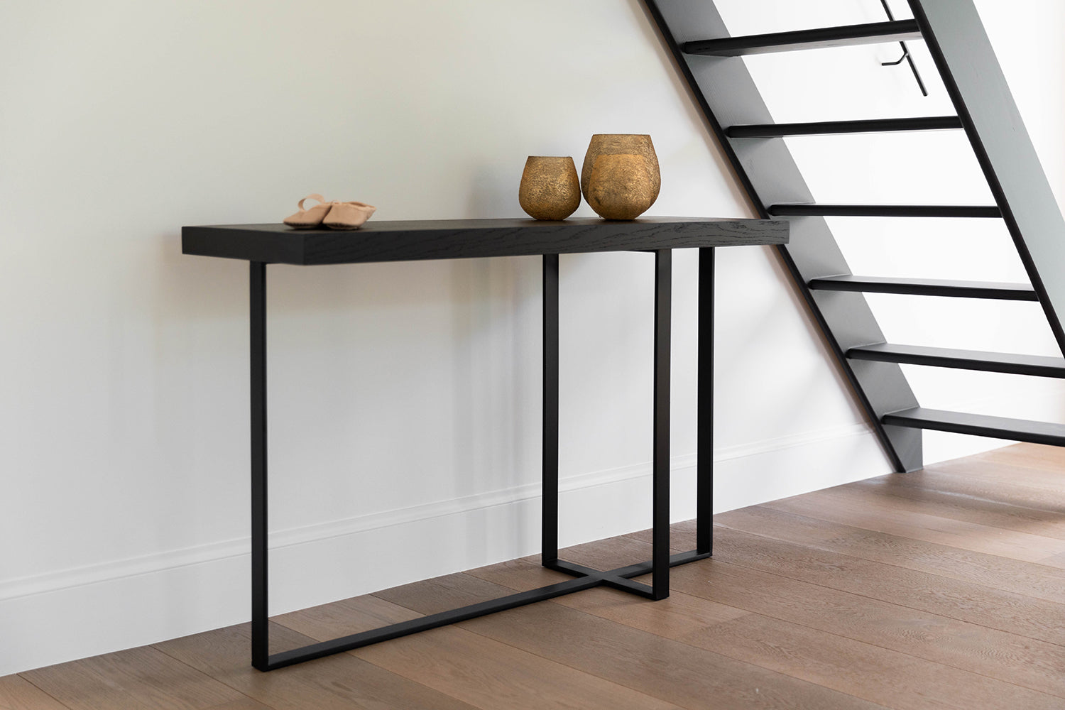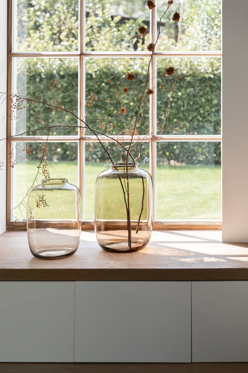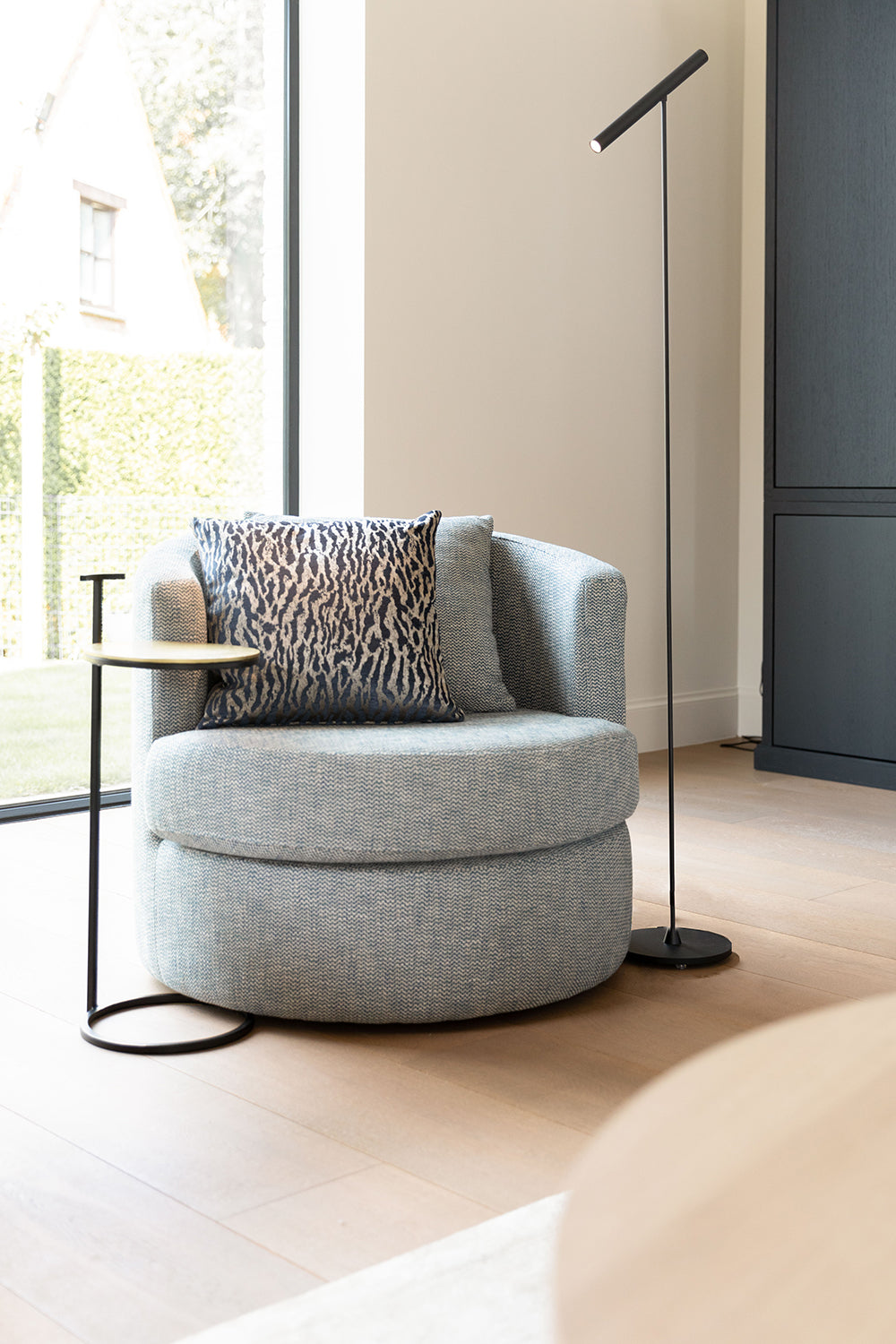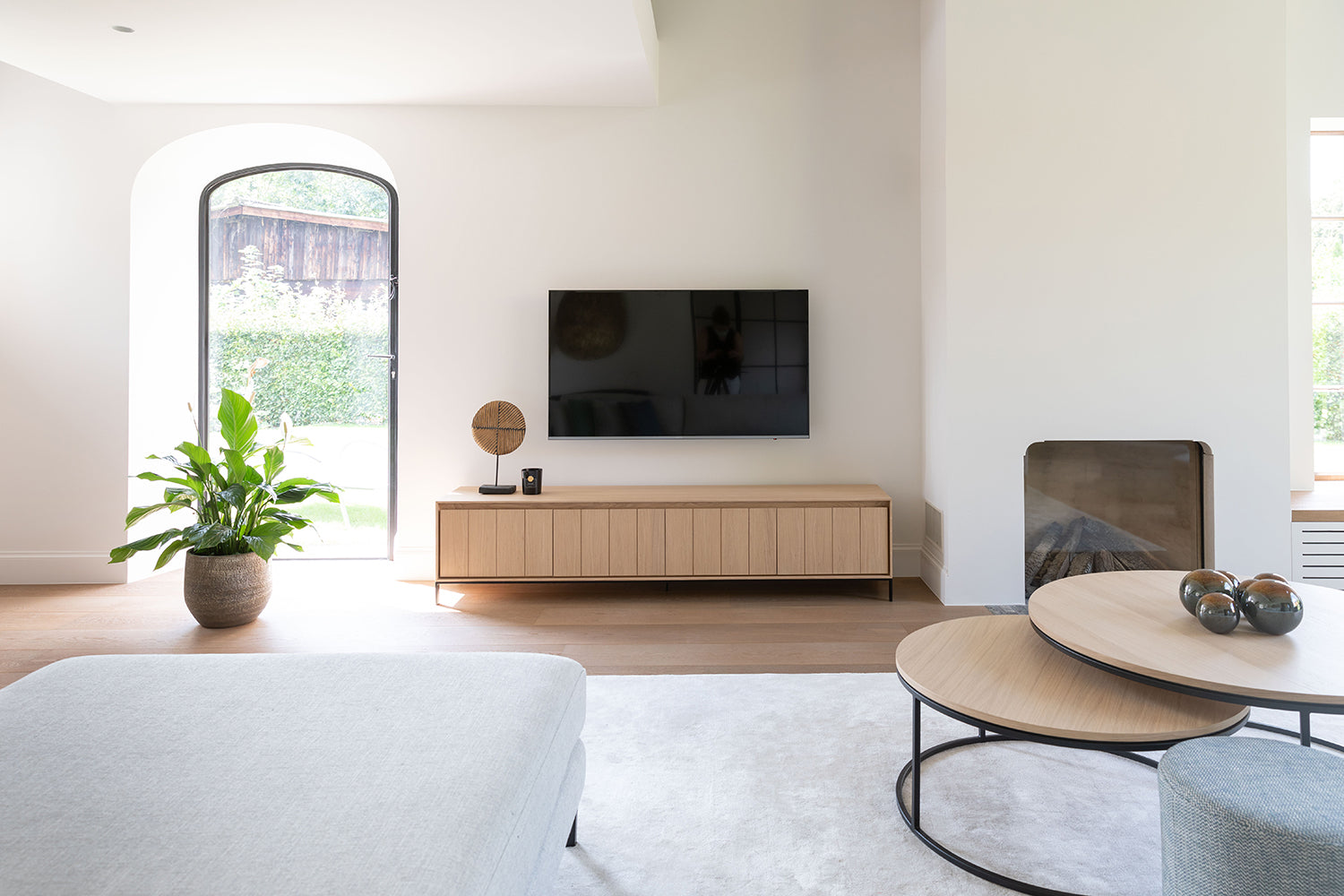 Deze transformatie van een oude garage naar een stijlvolle woonkamer is een prachtig voorbeeld van modern landelijk design. De keuze voor subtiele blauwe accenten geeft de ruimte een frisse en uitnodigende sfeer, terwijl de sofa Discovery op pootjes bijdraagt aan een gevoel van ruimtelijkheid en luchtigheid. Het gebruik van twee verschillende houttinten - naturel en zwart - creëert een harmonieuze balans tussen traditionele charme en hedendaagse elegantie. De zwarte houtkleur versterkt de moderne uitstraling en vormt een naadloze overgang naar de industriële stalen deuren, wat het geheel een uniek en samenhangend karakter geeft. Dit renovatieproject illustreert hoe met zorgvuldig gekozen designelementen een functionele ruimte kan worden omgetoverd in een warm en uitnodigend thuis.