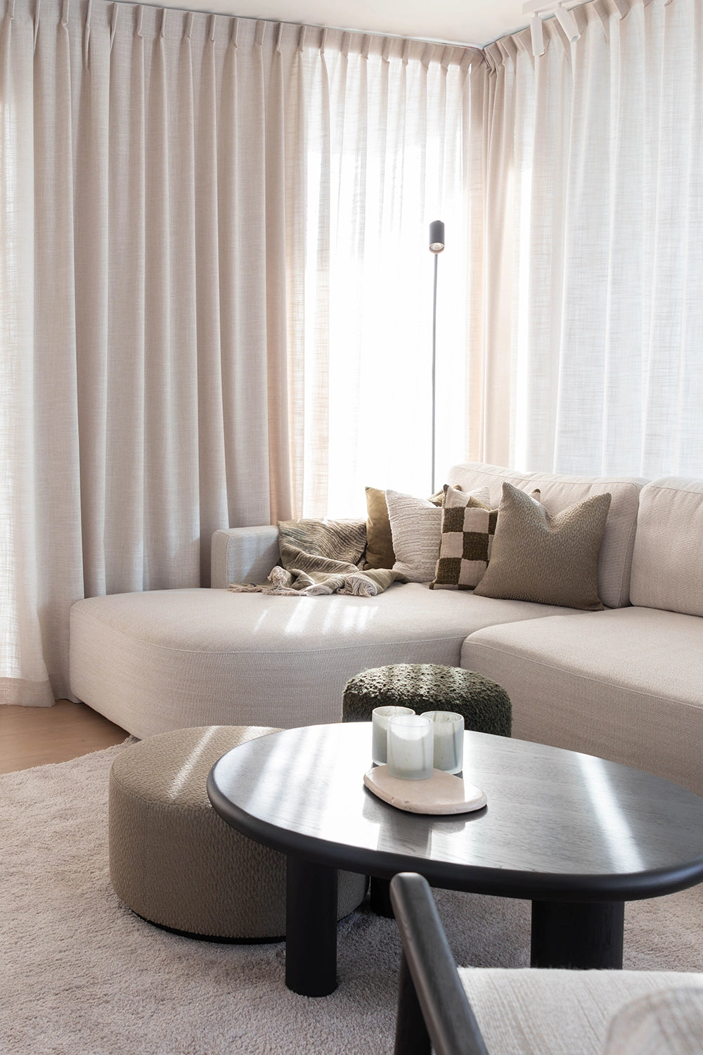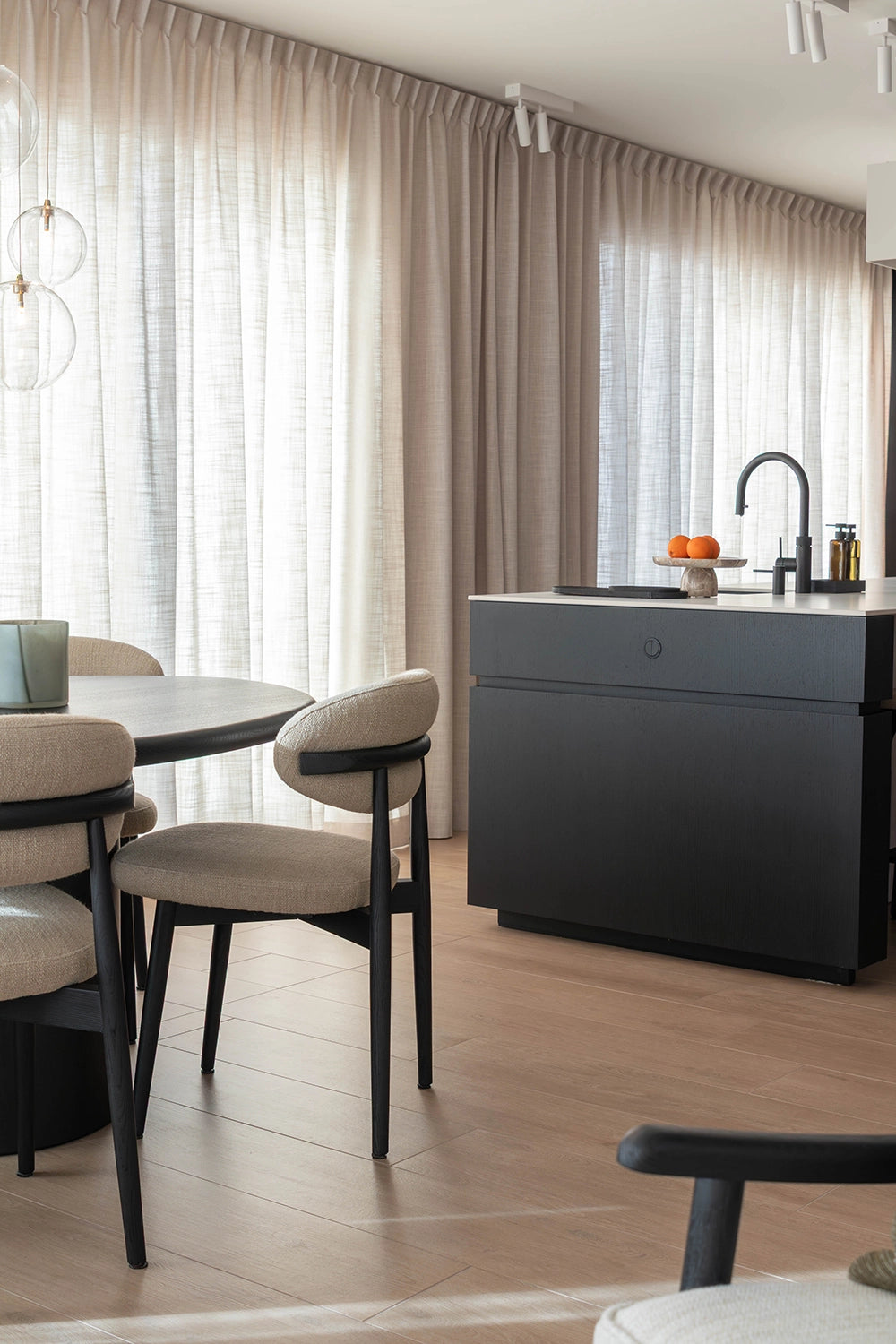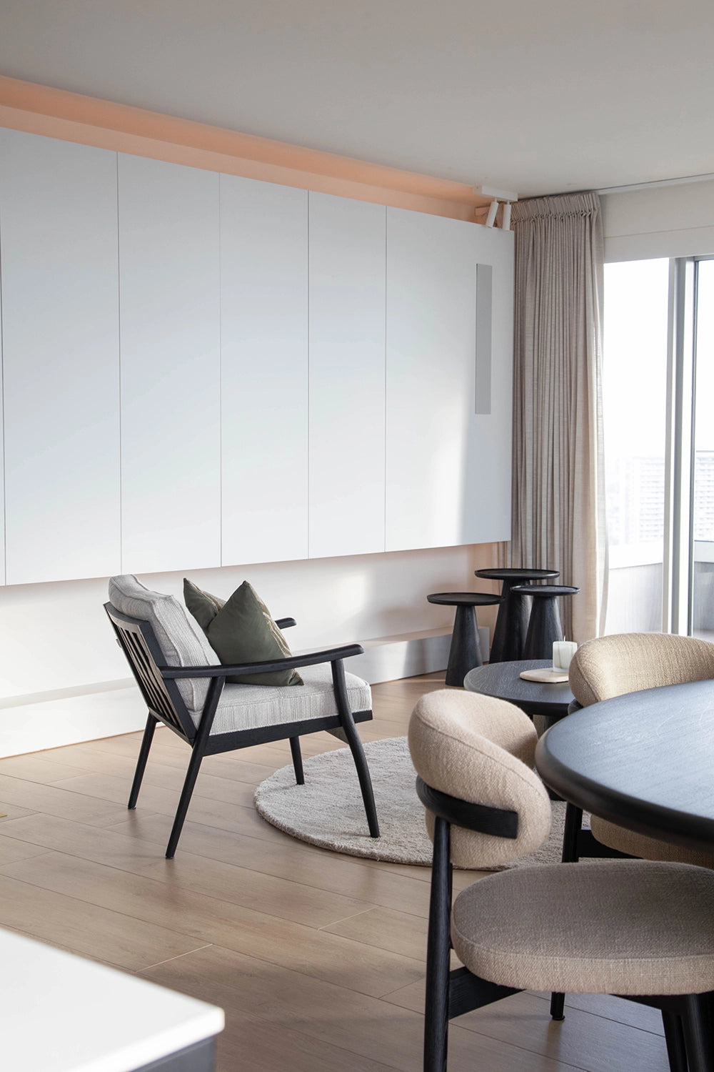 Voor dit nieuwbouwappartement in hartje Antwerpen mochten we vertrekken van een blanco canvas en het volledige interieur van nul uitdenken. Elk meubelstuk werd perfect op maat ontworpen, volledig afgestemd op de wensen en levensstijl van de klant. Een appartement vraagt vaak om slimme keuzes door de beperkte ruimte, maar net daarin schuilt de kracht van dit project. Door de zithoek volledig in een hoek te positioneren en te werken met een sofa Pouma, werd elke vierkante meter optimaal benut zonder in te boeten aan comfort of uitstraling. Het kleurenpalet versterkt die doordachte aanpak: warm zwart eikenhout vormt de solide basis, terwijl groene accentkleuren in de decoratie zorgen voor frisheid, diepte en een subtiele connectie met de natuur. Het resultaat is een interieur dat ruimtelijk aanvoelt, karakter uitstraalt en tot in elk detail klopt.