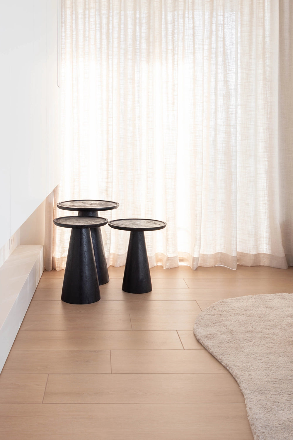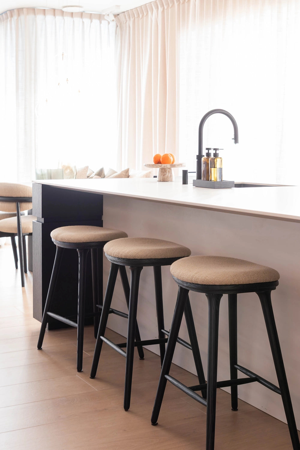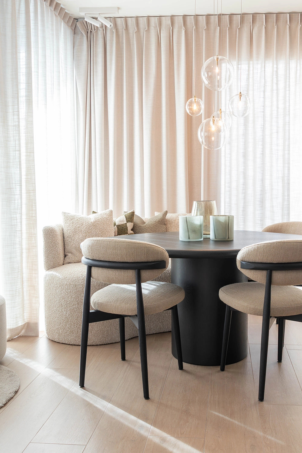 Voor dit nieuwbouwappartement in hartje Antwerpen mochten we vertrekken van een blanco canvas en het volledige interieur van nul uitdenken. Elk meubelstuk werd perfect op maat ontworpen, volledig afgestemd op de wensen en levensstijl van de klant. Een appartement vraagt vaak om slimme keuzes door de beperkte ruimte, maar net daarin schuilt de kracht van dit project. Door de zithoek volledig in een hoek te positioneren en te werken met een sofa Pouma, werd elke vierkante meter optimaal benut zonder in te boeten aan comfort of uitstraling. Het kleurenpalet versterkt die doordachte aanpak: warm zwart eikenhout vormt de solide basis, terwijl groene accentkleuren in de decoratie zorgen voor frisheid, diepte en een subtiele connectie met de natuur. Het resultaat is een interieur dat ruimtelijk aanvoelt, karakter uitstraalt en tot in elk detail klopt.