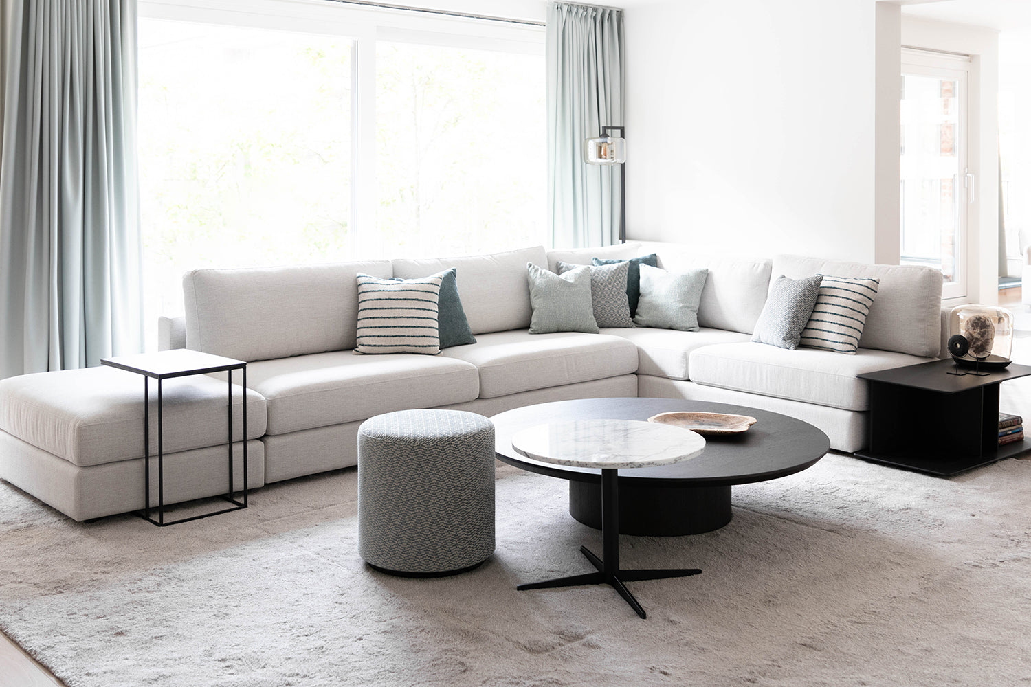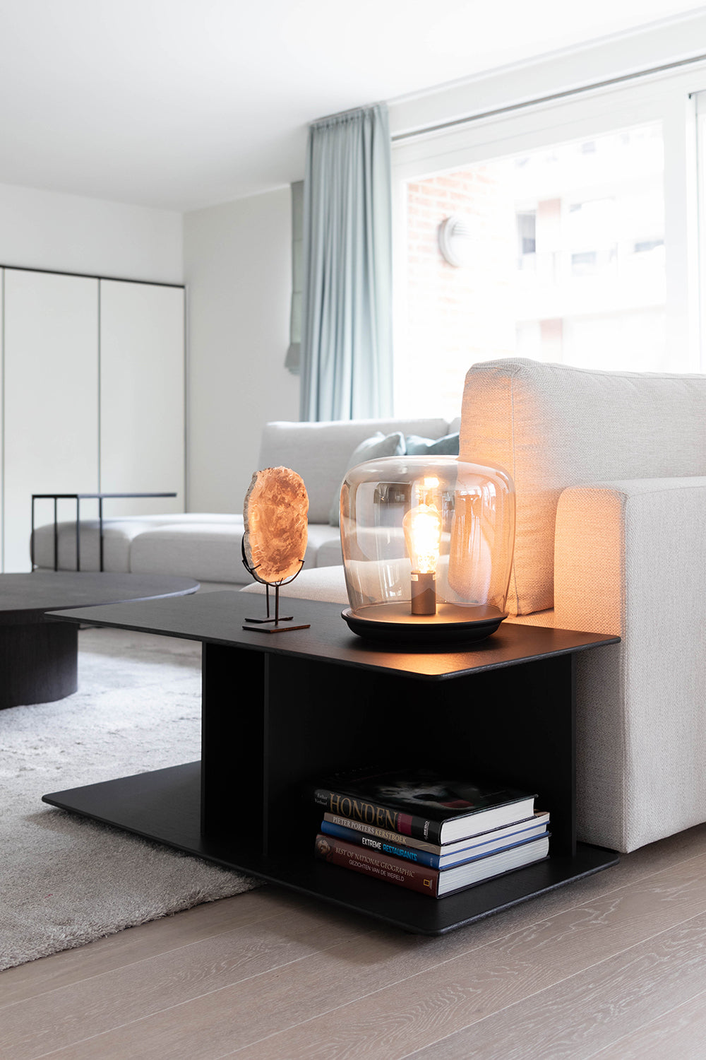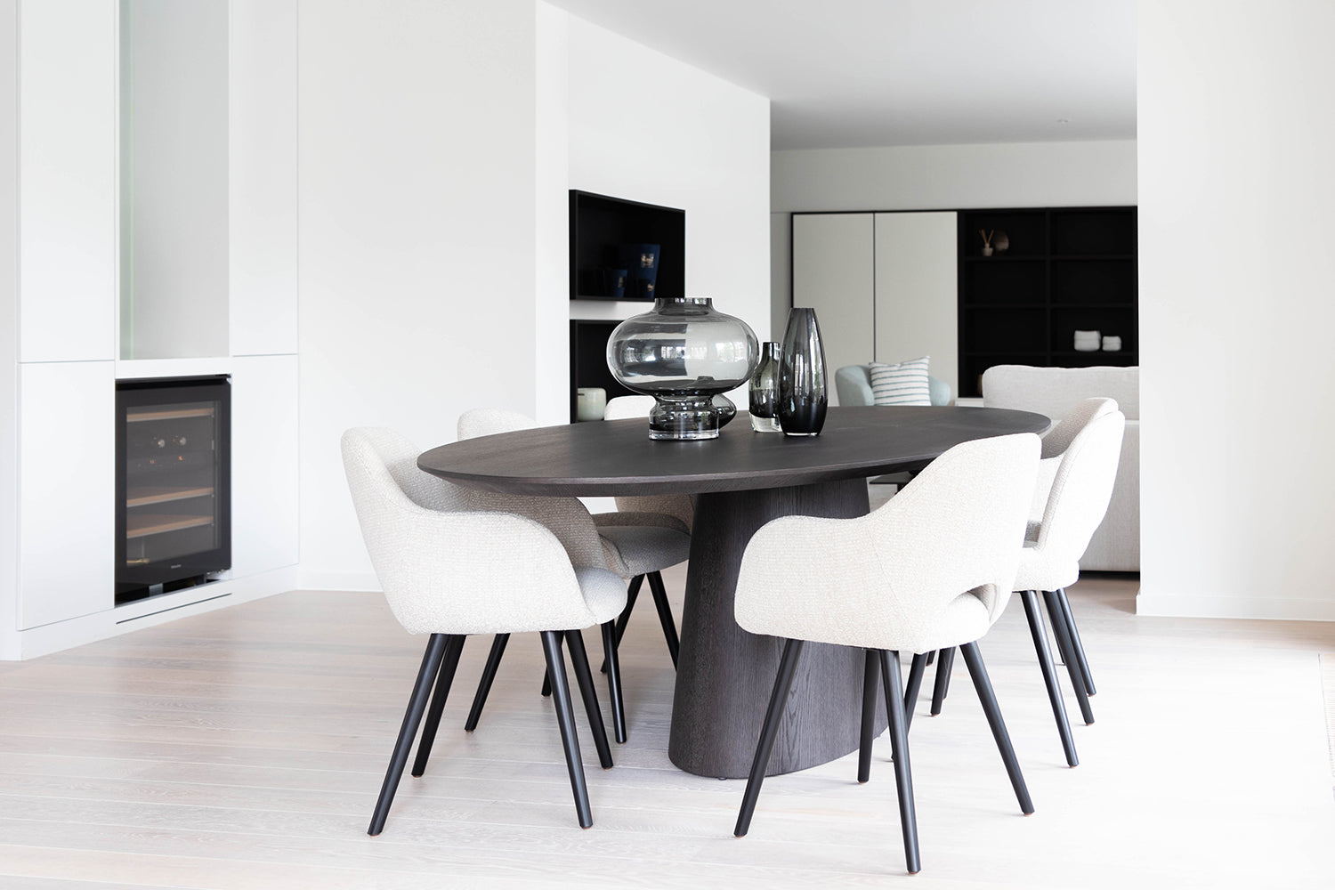 Het concept van een appartement in Knokke met blauwe accenten die de nabijheid van de zee weerspiegelen, is een prachtige manier om een rustige en serene sfeer te creëren. De keuze voor een ovale eettafel als centraal punt in de ruimte is een slimme zet die niet alleen de aandacht trekt, maar ook een gevoel van gemeenschap en samenzijn bevordert. De aparte zithoek biedt een perfecte ontsnapping voor die momenten waarop men zich wil terugtrekken met een goed boek, De afgeronde vorm van de zetel Bury vormt een speels contrast met de strakke lijnen van het interieur. Deze ronding die terugkomt in zowel de zetel als de eettafel kelby, draagt bij aan een coherente en doordachte designesthetiek. De grote zetel Citizen, ontworpen om gasten te verwelkomen, versterkt het idee van een gastvrije en warme omgeving waar familie en vrienden samen kunnen komen en genieten van elkaars gezelschap. Het is duidelijk dat elk element in dit ontwerp zorgvuldig is overwogen om zowel functionaliteit als esthetische aantrekkingskracht te bieden, waardoor het appartement niet alleen een tweede verblijf is, maar een thuis weg van huis.
