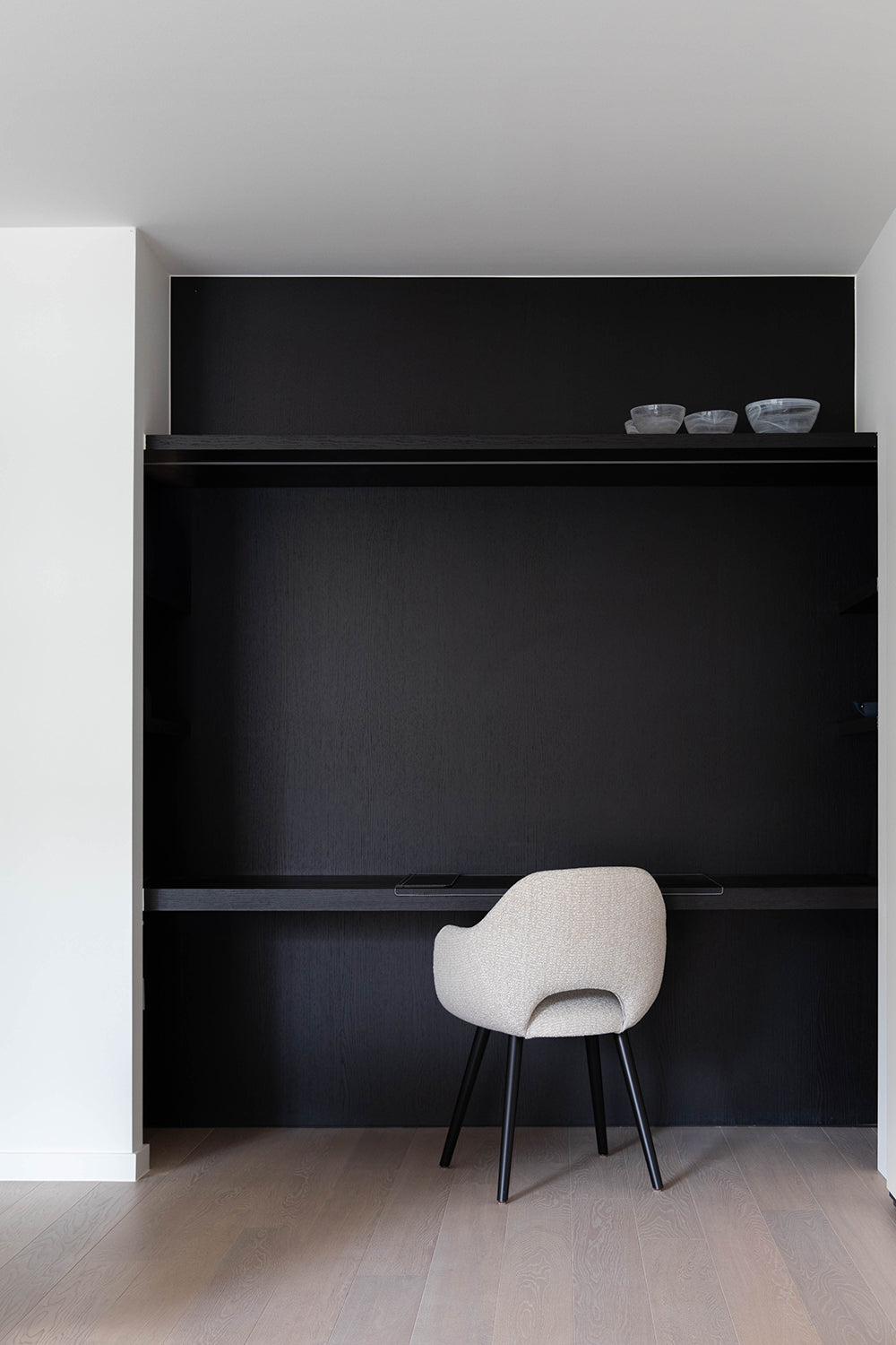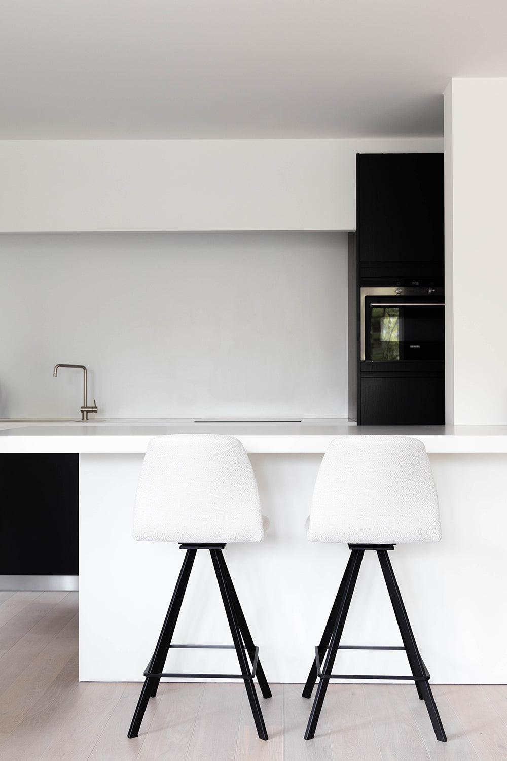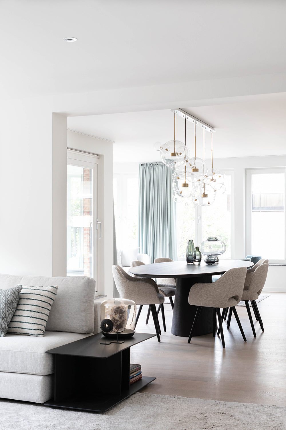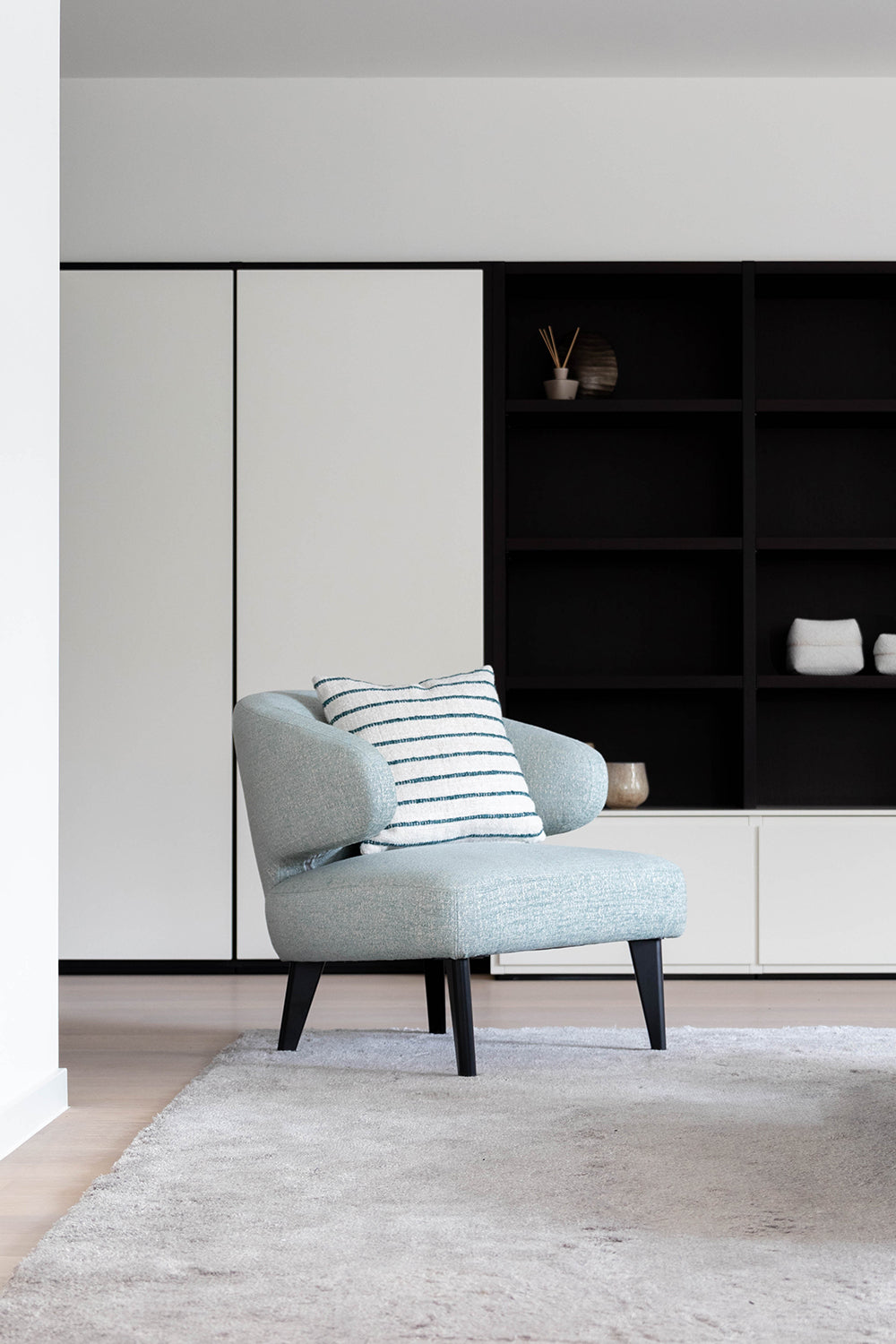 Het concept van een appartement in Knokke met blauwe accenten die de nabijheid van de zee weerspiegelen, is een prachtige manier om een rustige en serene sfeer te creëren. De keuze voor een ovale eettafel als centraal punt in de ruimte is een slimme zet die niet alleen de aandacht trekt, maar ook een gevoel van gemeenschap en samenzijn bevordert. De aparte zithoek biedt een perfecte ontsnapping voor die momenten waarop men zich wil terugtrekken met een goed boek, De afgeronde vorm van de zetel Bury vormt een speels contrast met de strakke lijnen van het interieur. Deze ronding die terugkomt in zowel de zetel als de eettafel kelby, draagt bij aan een coherente en doordachte designesthetiek. De grote zetel Citizen, ontworpen om gasten te verwelkomen, versterkt het idee van een gastvrije en warme omgeving waar familie en vrienden samen kunnen komen en genieten van elkaars gezelschap. Het is duidelijk dat elk element in dit ontwerp zorgvuldig is overwogen om zowel functionaliteit als esthetische aantrekkingskracht te bieden, waardoor het appartement niet alleen een tweede verblijf is, maar een thuis weg van huis.
