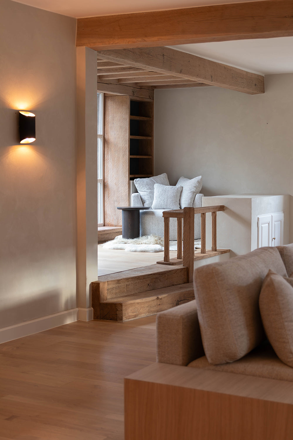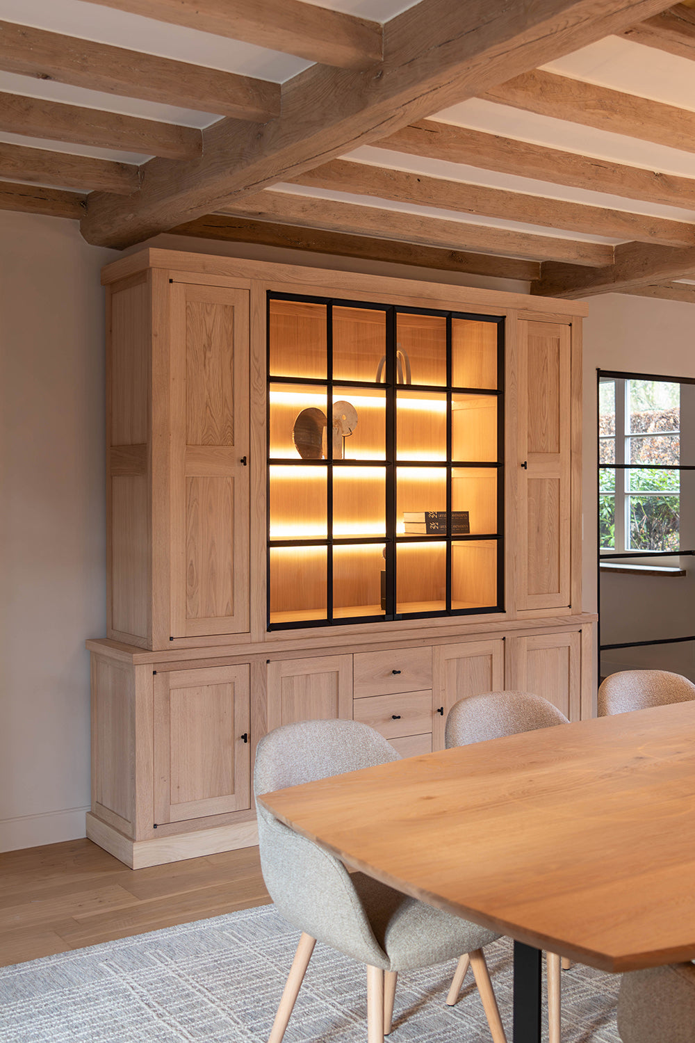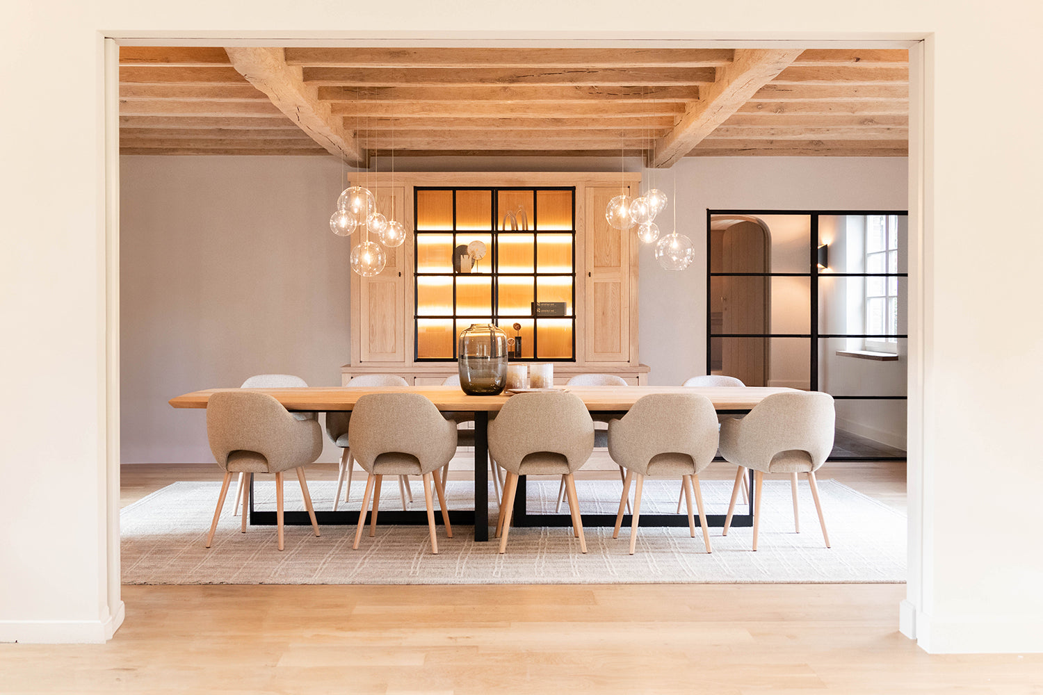 Het transformeren van een klassieke hoeve tot een landelijk moderne, tijdloze woning is een prachtige manier om het verleden te eren terwijl men geniet van hedendaags comfort. De enorme gezinszetel wordt het hart van de woning, een plek waar gezelligheid en warmte samenkomen. De aandacht voor detail is zichtbaar in de afwerking, waarbij sfeervolle wandverlichting een intieme ambiance creëert. De grote houten eettafel nodigt uit tot het houden van feesten en samenkomsten, terwijl de mortex afwerking in de keuken een subtiele moderne twist geeft. Dit alles draagt bij aan een woning die niet alleen een thuis is, maar ook een statement van stijl en gezelligheid.