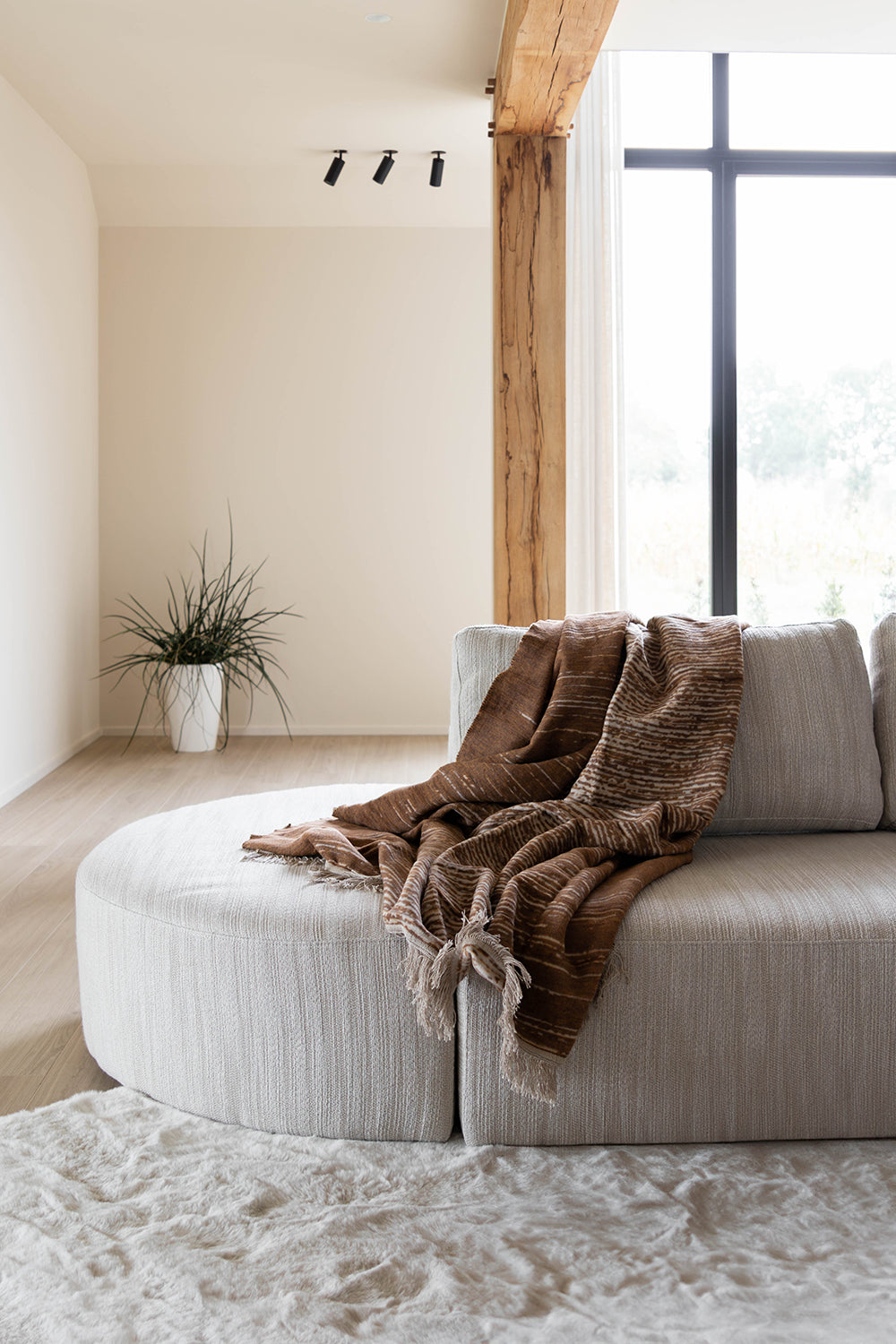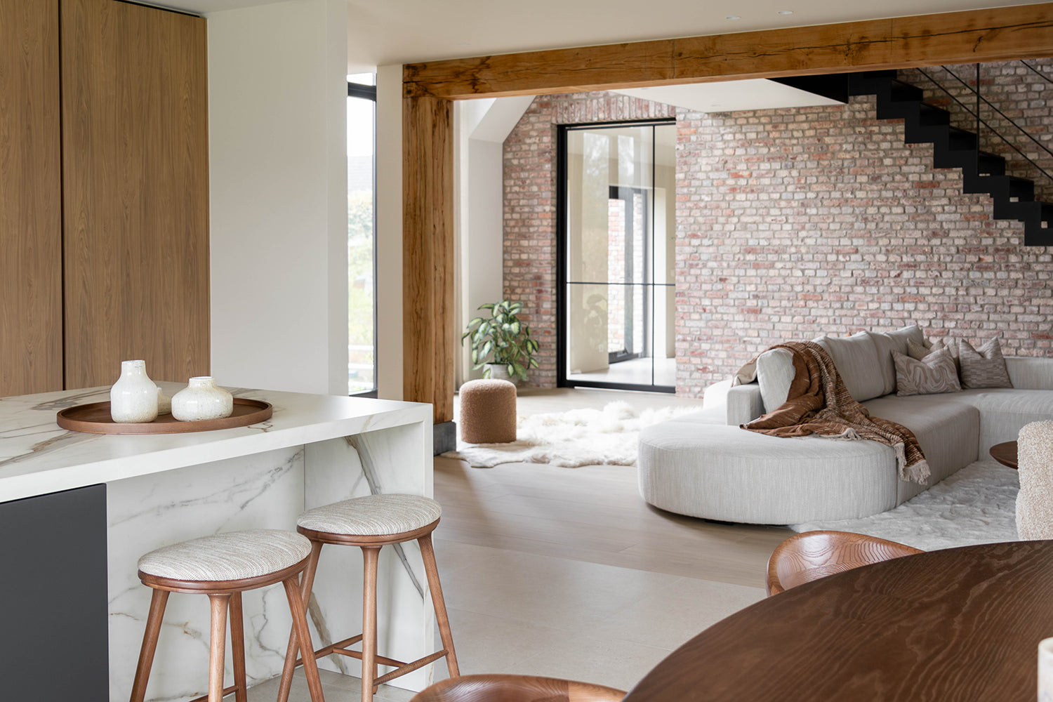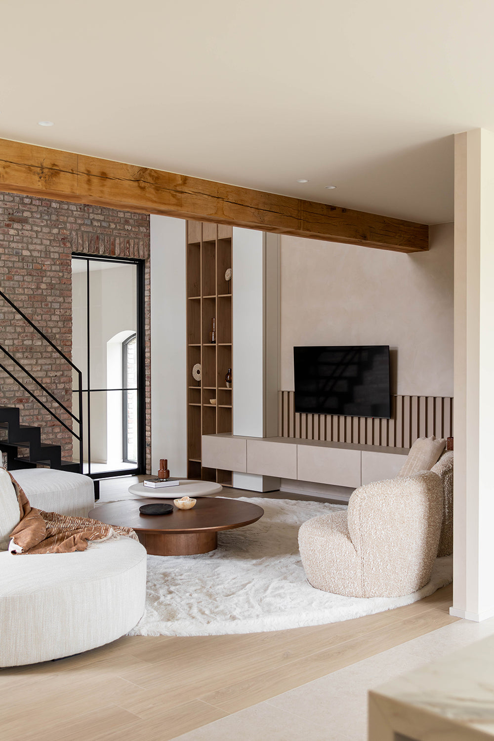Dit interieurproject draait om de volledige renovatie van een oude hoeve, waarbij de rijke geschiedenis van het pand prachtig is gecombineerd met moderne elementen. Tijdens de renovatie zijn de authentieke details van de hoeve zorgvuldig behouden, zoals de houten balken en een oude stenen muur die de karakteristieke sfeer van het pand weerspiegelen. Tegelijkertijd zijn de meubels en materialen met zorg geselecteerd om een harmonieuze verbinding te creëren tussen het oude en het nieuwe. De warme, natuurlijke tinten van de notelaar zorgen voor een tijdloze uitstraling, terwijl de cognac kleurige accenten in de stoffering een verfijnd contrast bieden met het zachte beige. Deze cognac accenten voegen niet alleen kleur toe, maar versterken ook de rustieke charme van het interieur, zonder afbreuk te doen aan de authenticiteit van de ruimte. Het resultaat is een prachtig geheel waarin de klassieke elementen van de hoeve moeiteloos samensmelten met de moderne invloeden. Het interieur straalt een warme, uitnodigende sfeer uit, waarbij de ruimtes zowel gezellig als stijlvol aanvoelen. De combinatie van oude en nieuwe materialen zorgt voor een sfeervolle en comfortabele omgeving, die het verleden eert en tegelijkertijd het gemak en de luxe van het heden biedt.