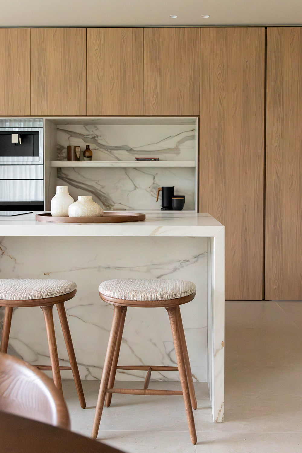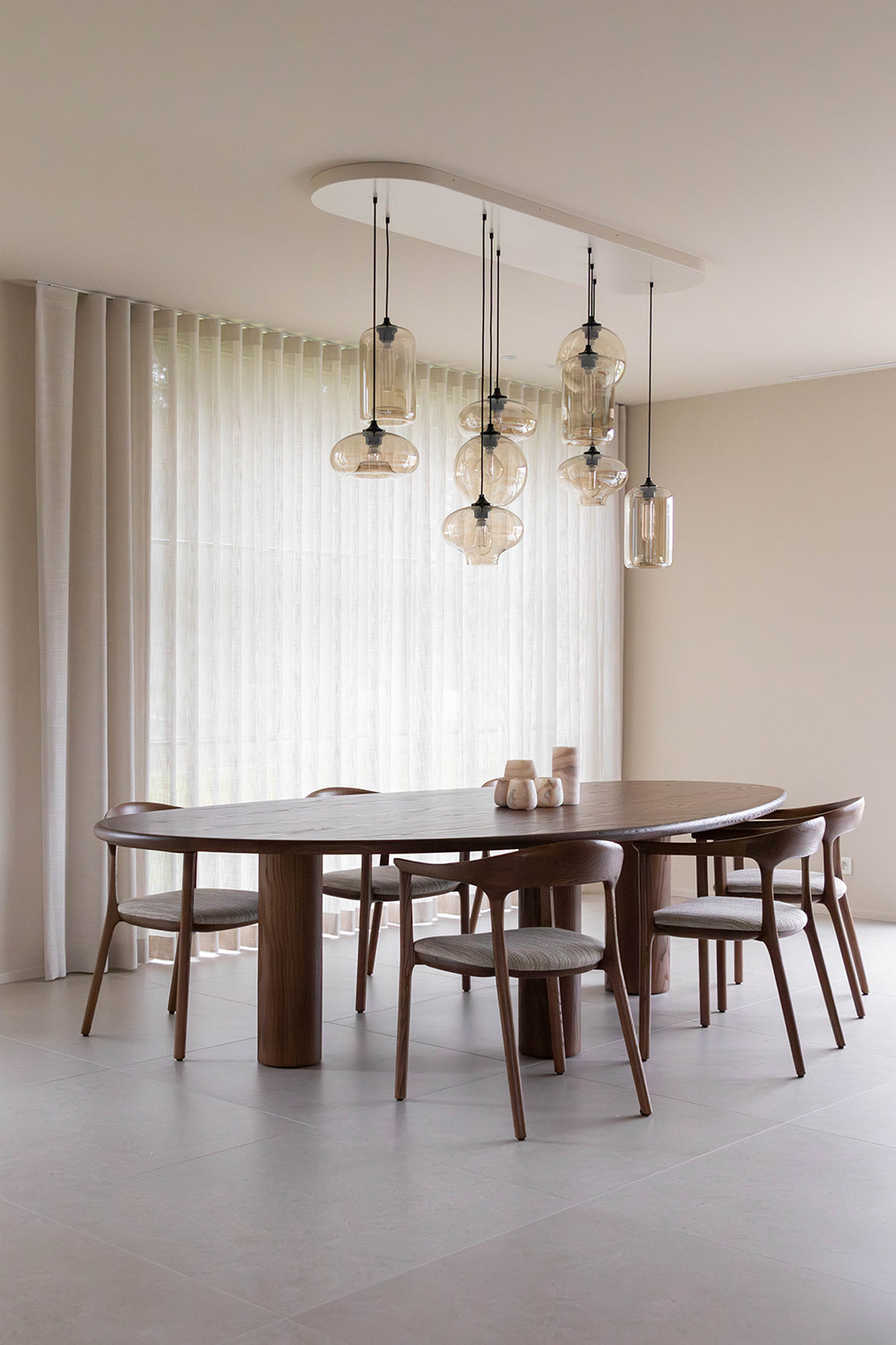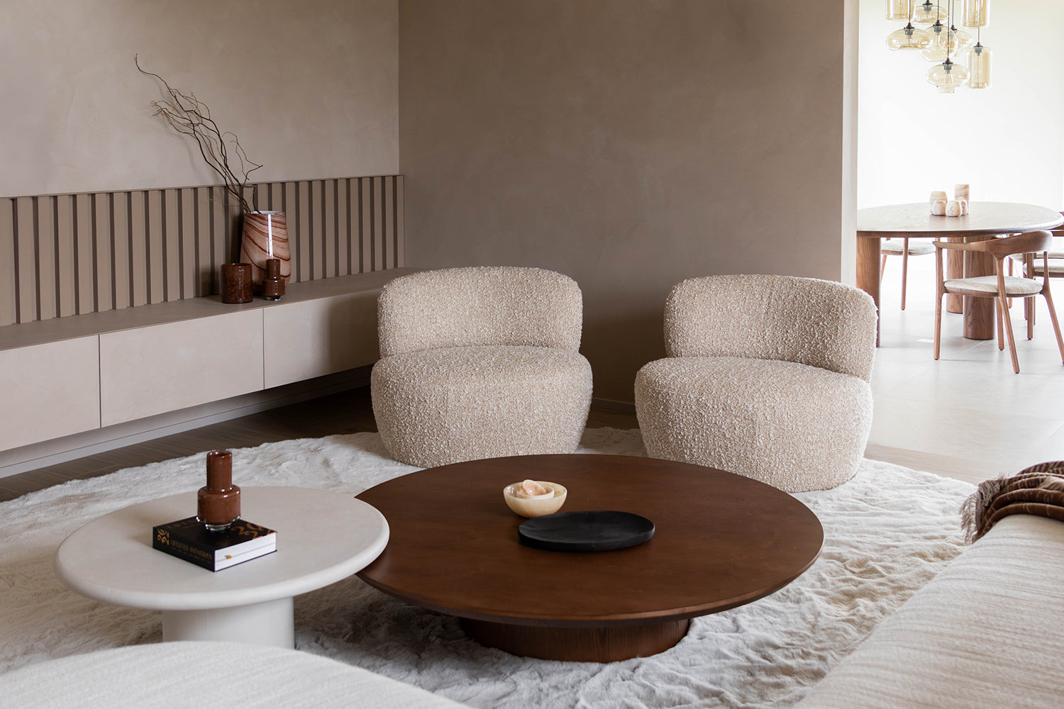 Dit interieurproject draait om de volledige renovatie van een oude hoeve, waarbij de rijke geschiedenis van het pand prachtig is gecombineerd met moderne elementen. Tijdens de renovatie zijn de authentieke details van de hoeve zorgvuldig behouden, zoals de houten balken en een oude stenen muur die de karakteristieke sfeer van het pand weerspiegelen. Tegelijkertijd zijn de meubels en materialen met zorg geselecteerd om een harmonieuze verbinding te creëren tussen het oude en het nieuwe. De warme, natuurlijke tinten van de notelaar zorgen voor een tijdloze uitstraling, terwijl de cognac kleurige accenten in de stoffering een verfijnd contrast bieden met het zachte beige. Deze cognac accenten voegen niet alleen kleur toe, maar versterken ook de rustieke charme van het interieur, zonder afbreuk te doen aan de authenticiteit van de ruimte. Het resultaat is een prachtig geheel waarin de klassieke elementen van de hoeve moeiteloos samensmelten met de moderne invloeden. Het interieur straalt een warme, uitnodigende sfeer uit, waarbij de ruimtes zowel gezellig als stijlvol aanvoelen. De combinatie van oude en nieuwe materialen zorgt voor een sfeervolle en comfortabele omgeving, die het verleden eert en tegelijkertijd het gemak en de luxe van het heden biedt.