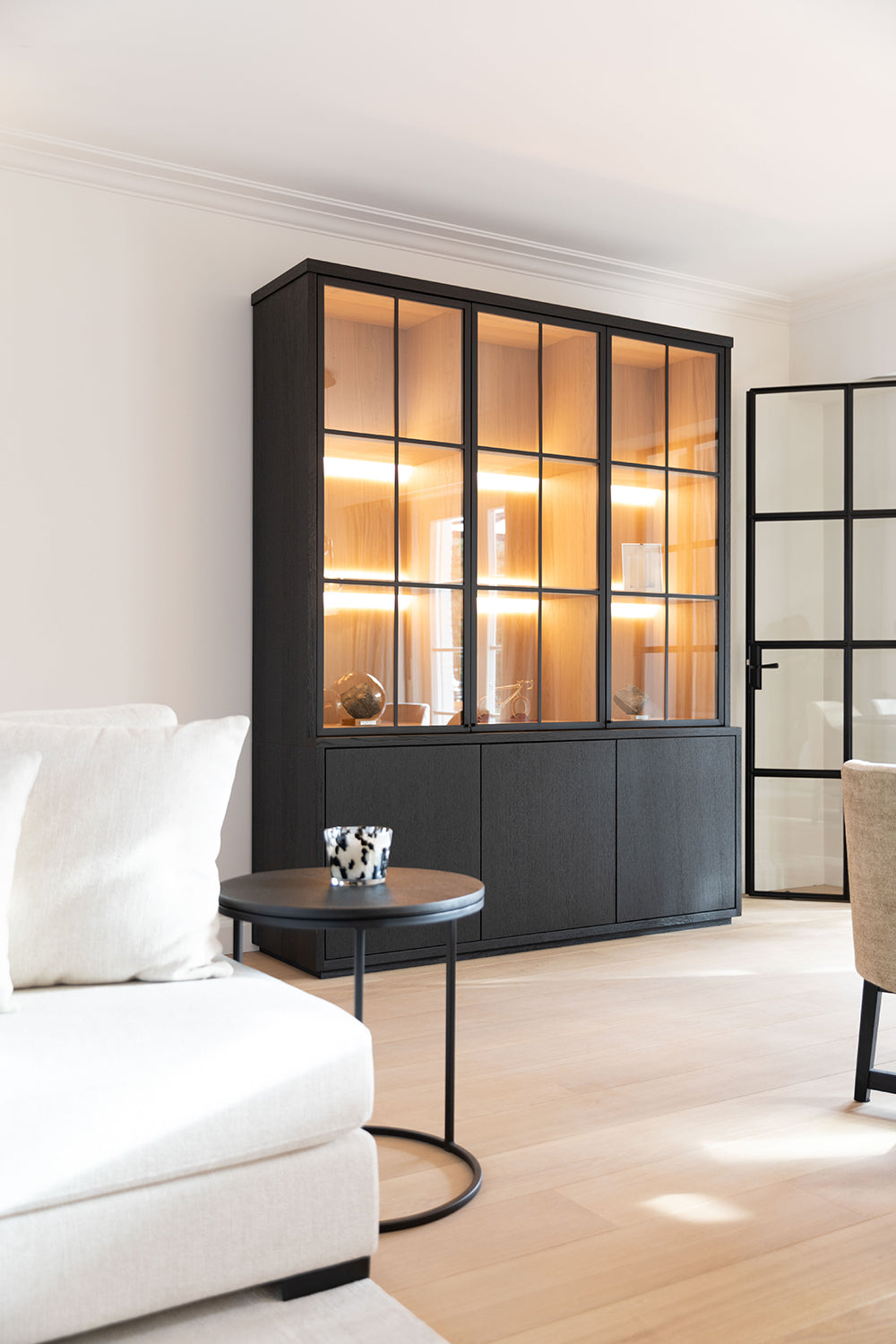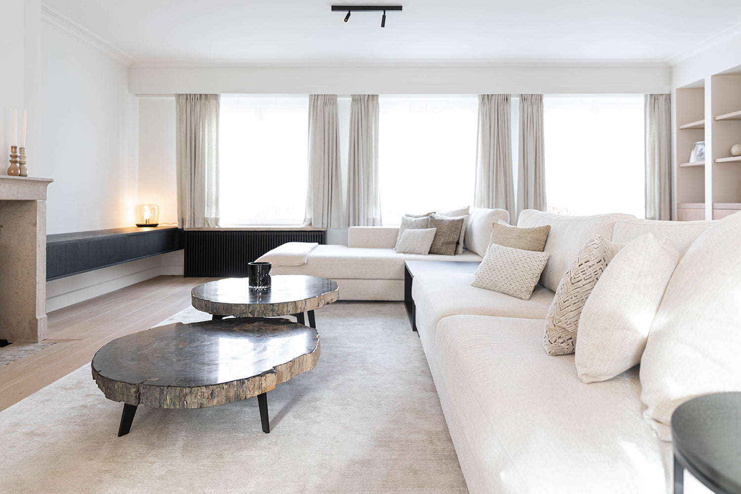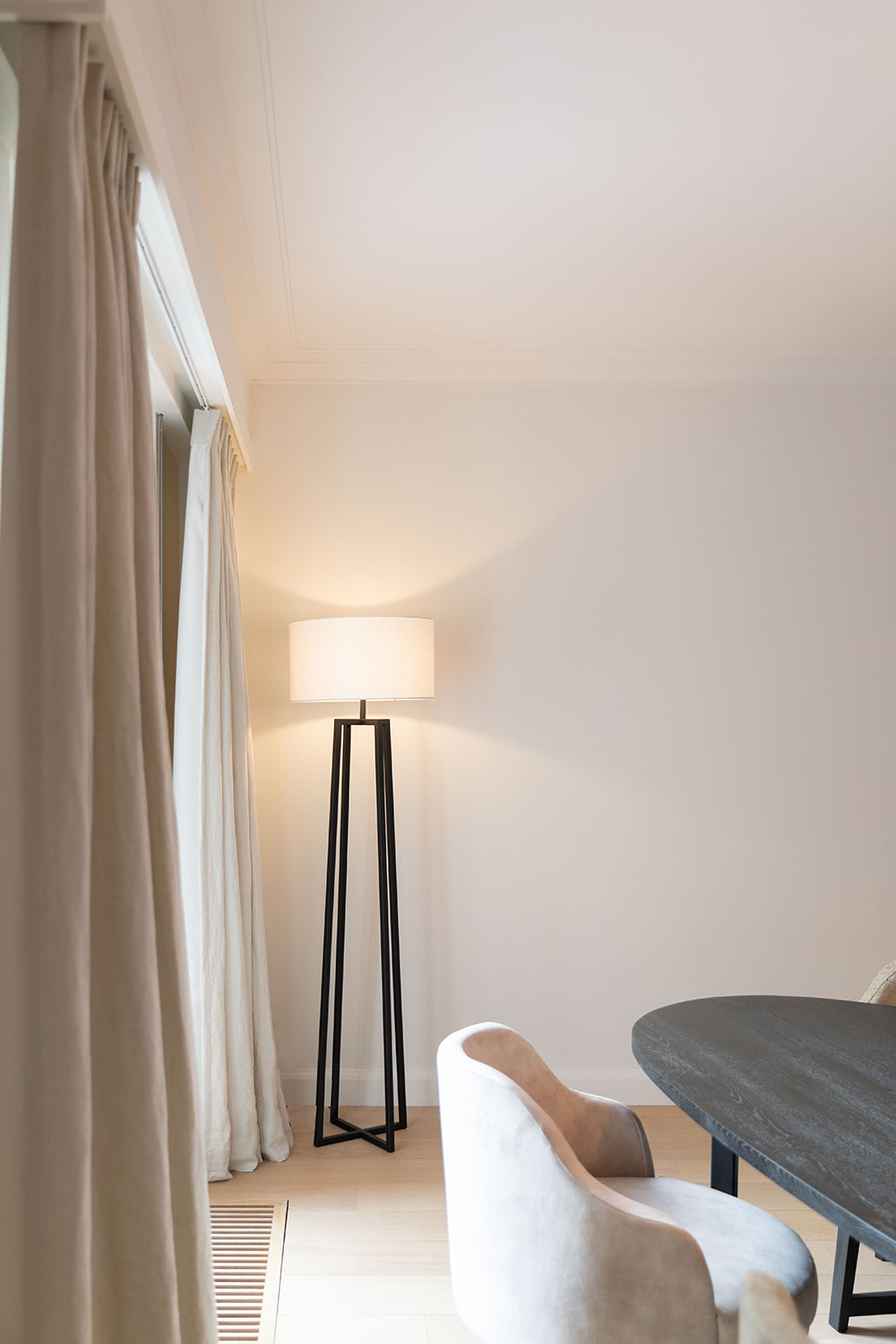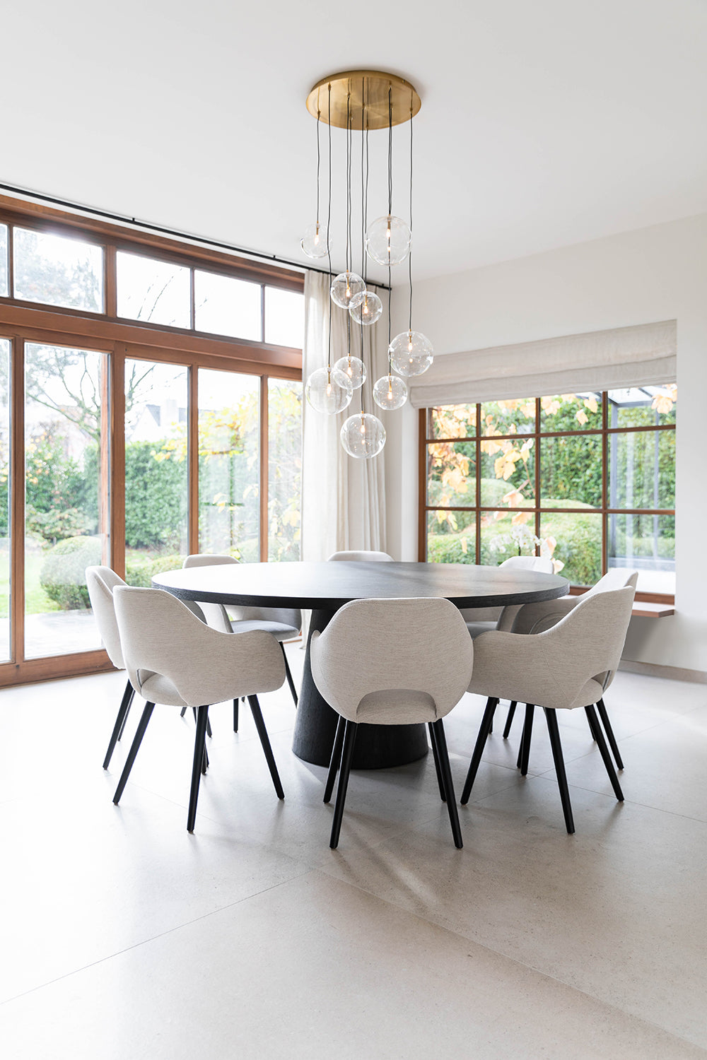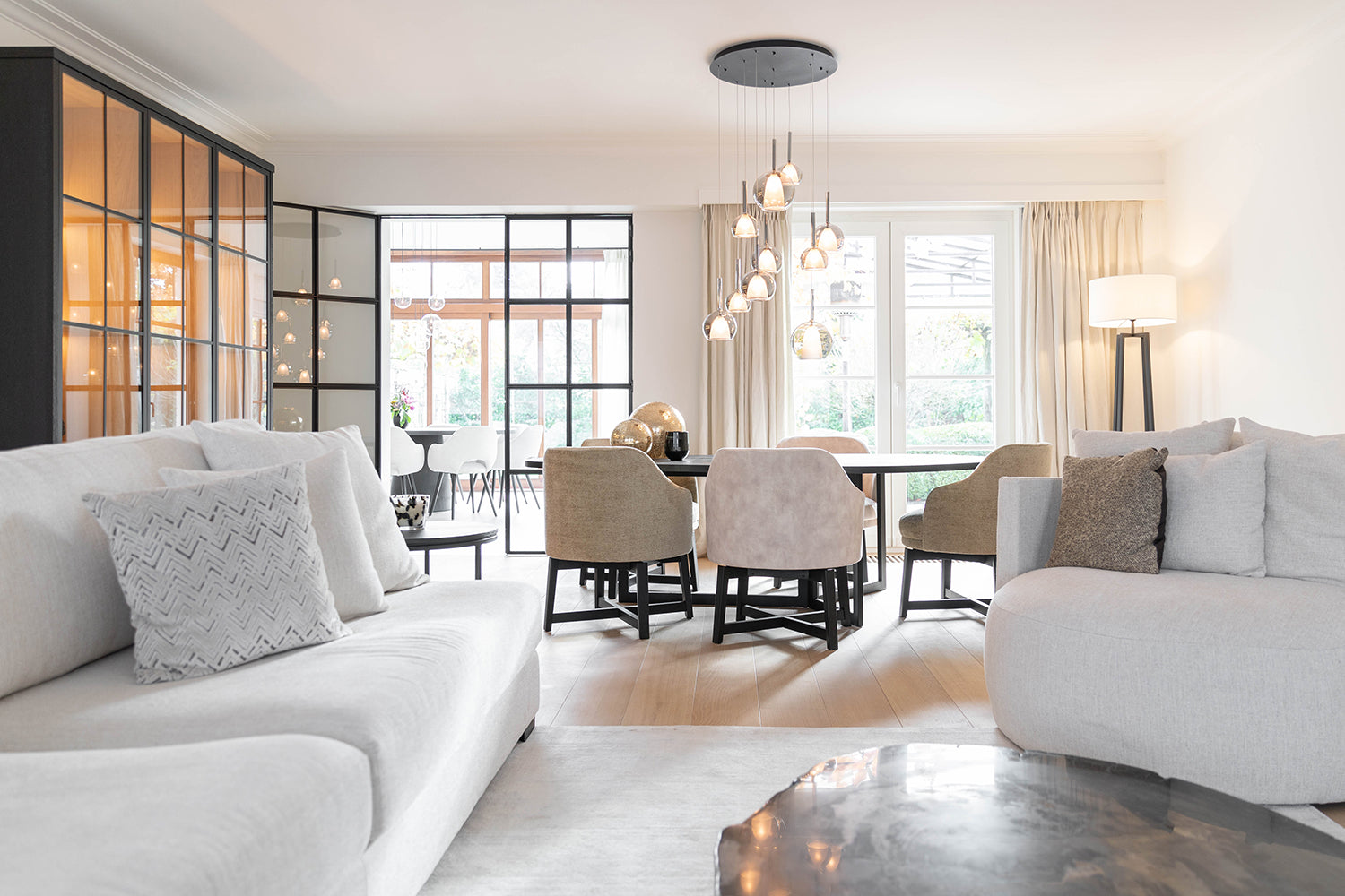 Dit renovatieproject heeft een harmonieuze balans gevonden tussen tijdloze elegantie en moderne landelijke charme. Het gebruik van ton-sur-ton kleuren creëert een subtiele en verfijnde sfeer, terwijl de gouden accenten in de verlichting een vleugje luxe toevoegen zonder overweldigend te zijn. De donkere houtsoorten bieden een prachtig contrast met de lichte meubels, wat diepte en warmte aan de ruimte geeft. De zwarte stalen deuren versterken dit contrast nog verder en zorgen voor een krachtige visuele verbinding tussen de verschillende elementen van het interieur. Dit alles draagt bij aan een strakke, maar landelijke uitstraling die zowel uitnodigend als indrukwekkend is. Het is duidelijk dat er zorgvuldig nagedacht is over elk detail om een coherente en uitnodigende ruimte te creëren.