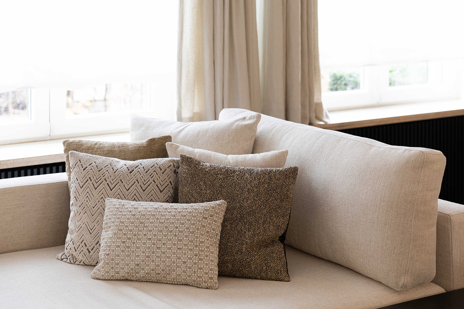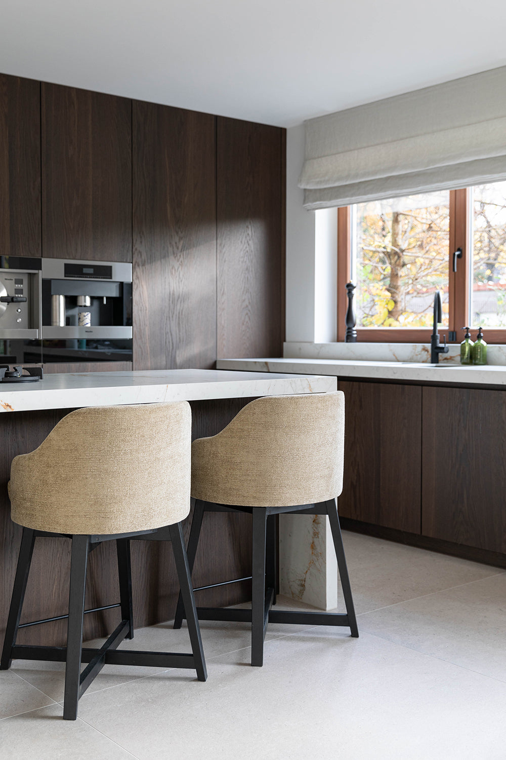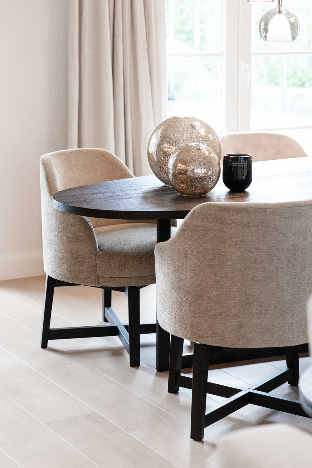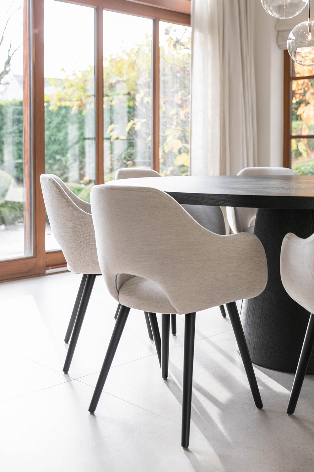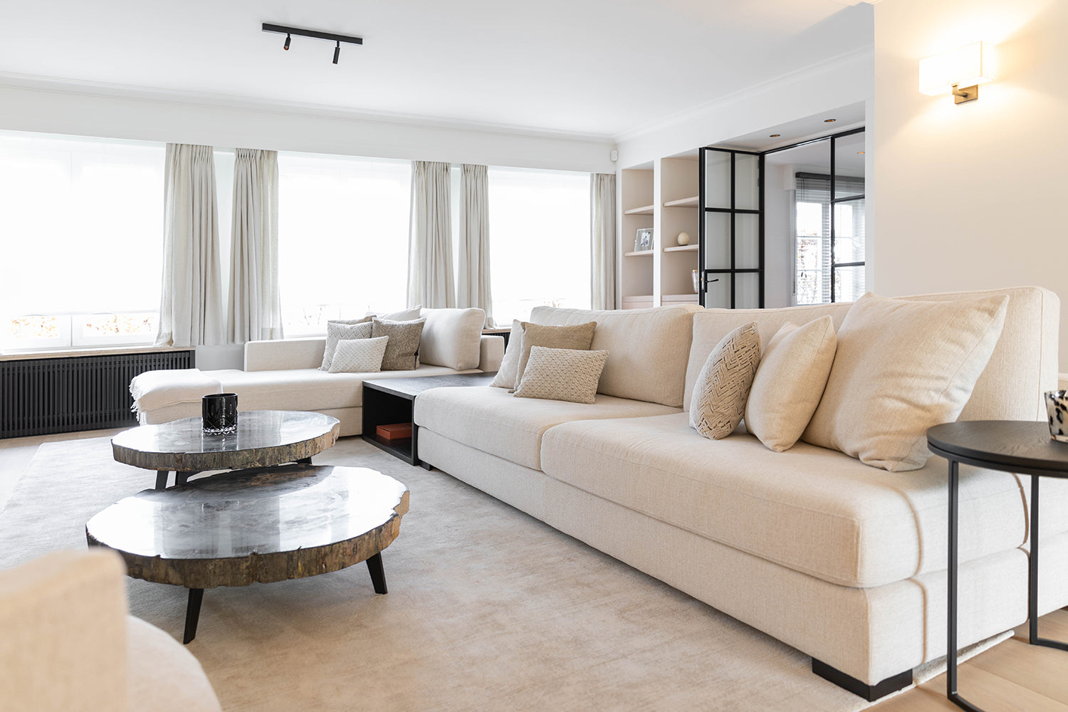 Dit renovatieproject heeft een harmonieuze balans gevonden tussen tijdloze elegantie en moderne landelijke charme. Het gebruik van ton-sur-ton kleuren creëert een subtiele en verfijnde sfeer, terwijl de gouden accenten in de verlichting een vleugje luxe toevoegen zonder overweldigend te zijn. De donkere houtsoorten bieden een prachtig contrast met de lichte meubels, wat diepte en warmte aan de ruimte geeft. De zwarte stalen deuren versterken dit contrast nog verder en zorgen voor een krachtige visuele verbinding tussen de verschillende elementen van het interieur. Dit alles draagt bij aan een strakke, maar landelijke uitstraling die zowel uitnodigend als indrukwekkend is. Het is duidelijk dat er zorgvuldig nagedacht is over elk detail om een coherente en uitnodigende ruimte te creëren.