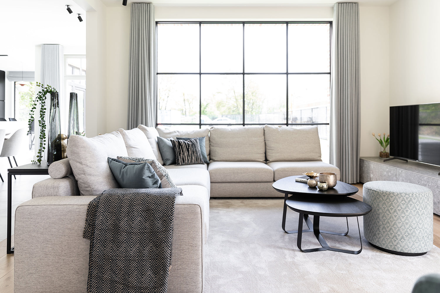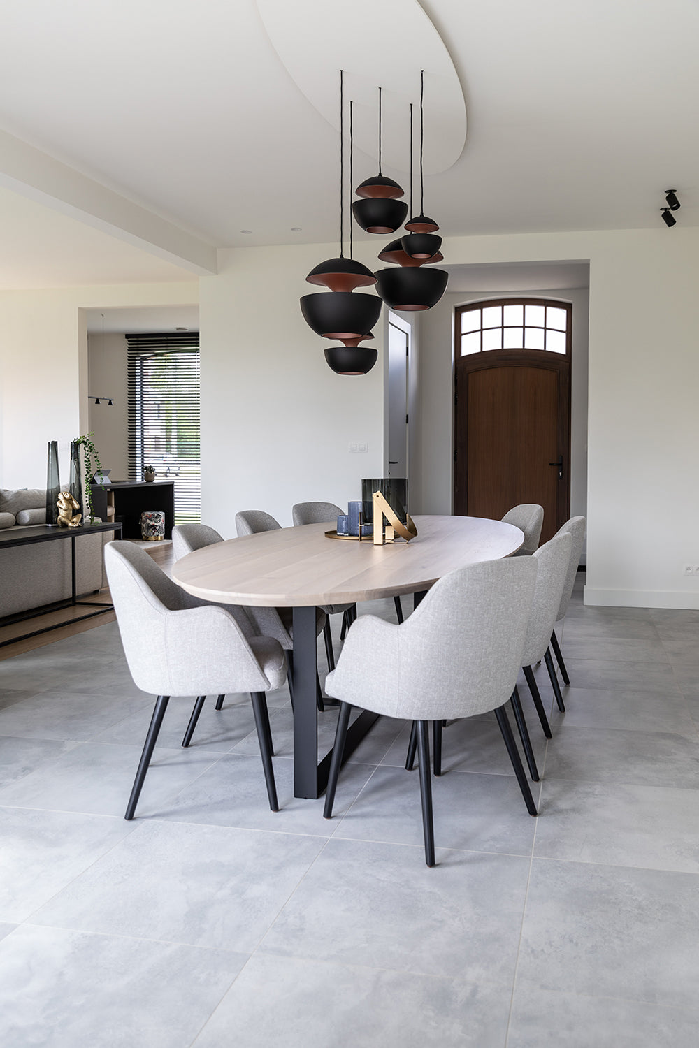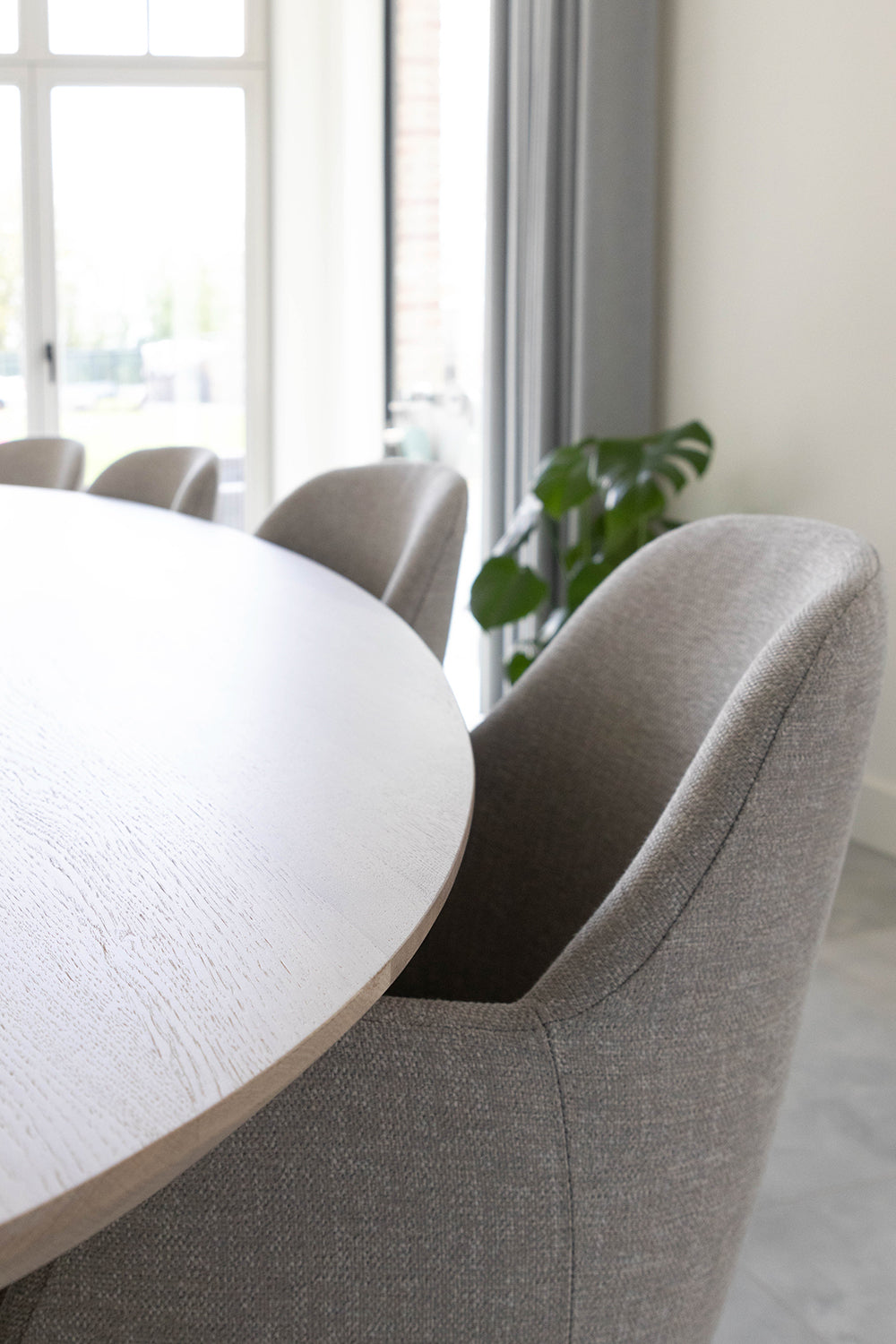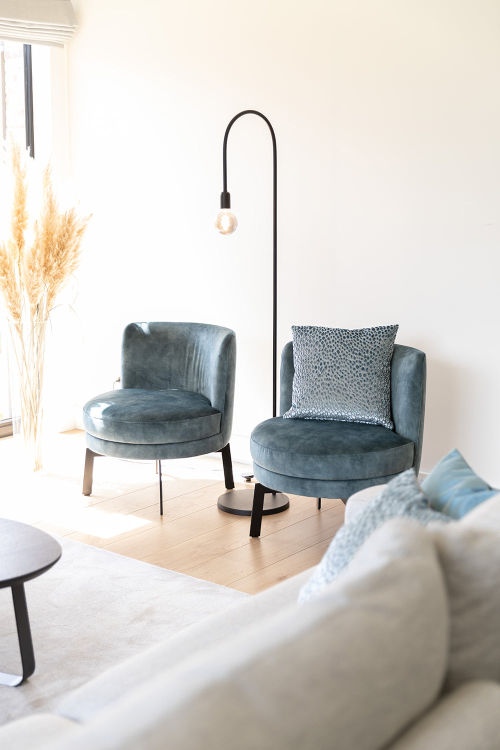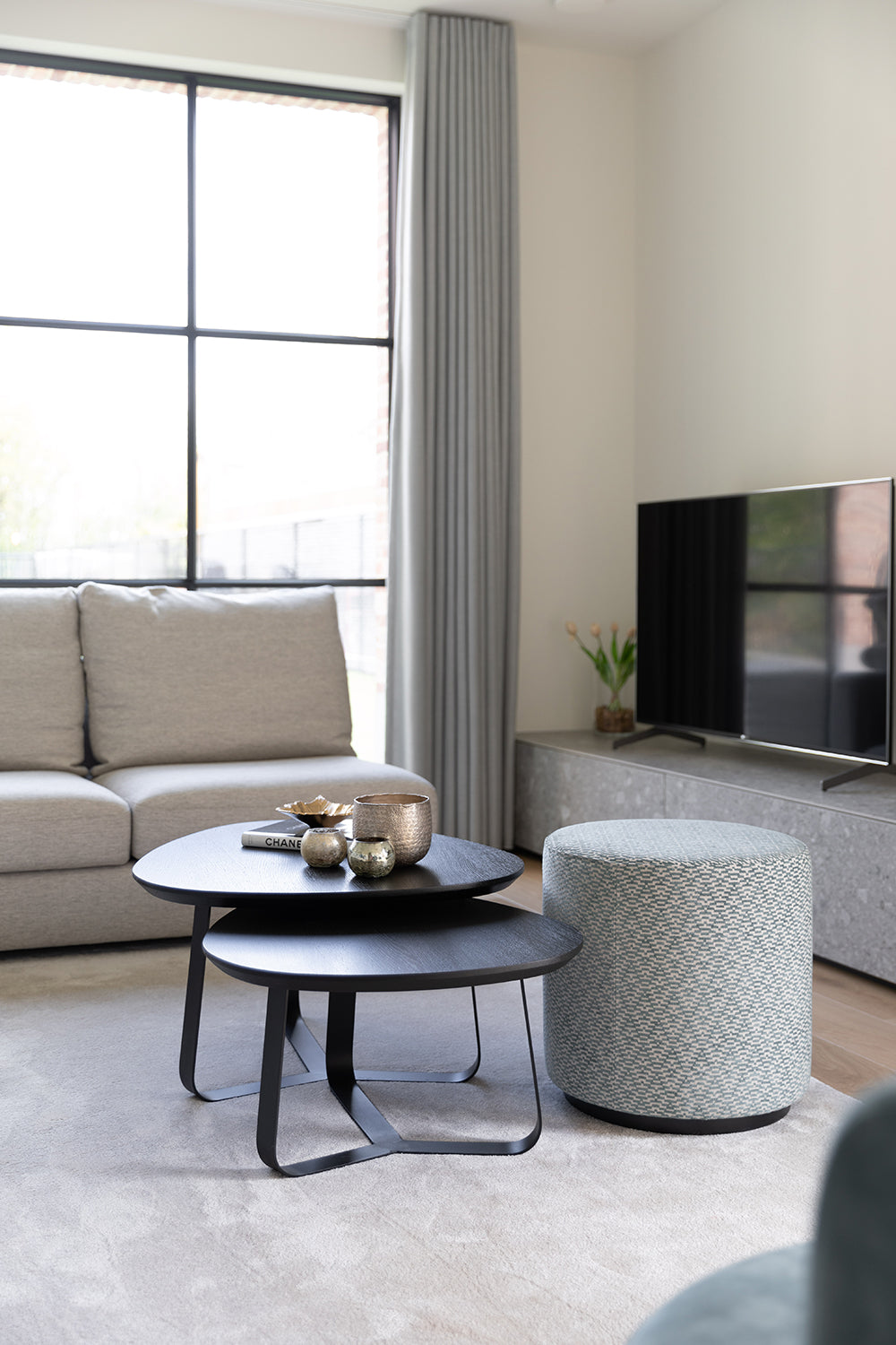 Het concept van een interieur dat rust uitstraalt door het gebruik van neutrale kleuren is een populaire trend in hedendaags design. Het creëren van een harmonieus geheel waarbij ruimtes naadloos in elkaar overlopen, vereist een zorgvuldige selectie van materialen en kleuren. Grijsblauwe accenten kunnen een kalmerende invloed hebben en tegelijkertijd een verfijnde touch geven aan de ruimte. De toevoeging van speelse elementen, zoals organische salontafels Zina, introduceert een element van natuurlijke schoonheid en kan een dynamisch contrast bieden met de meer gestructureerde aspecten van het ontwerp. Afgeronde vormen zijn een slimme keuze om zachtheid en continuïteit in het interieur te brengen, wat bijdraagt aan het gevoel van rust en eenheid.