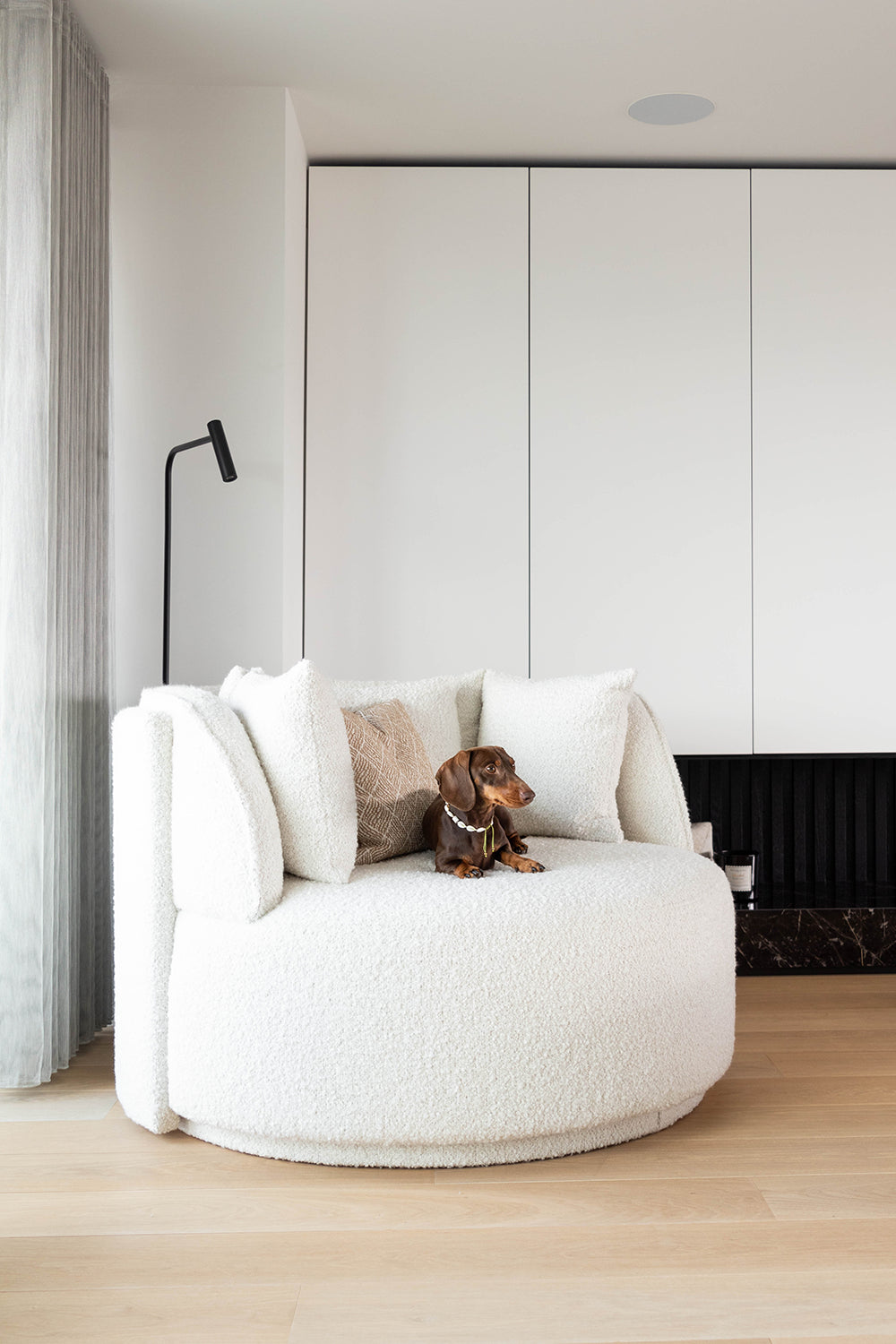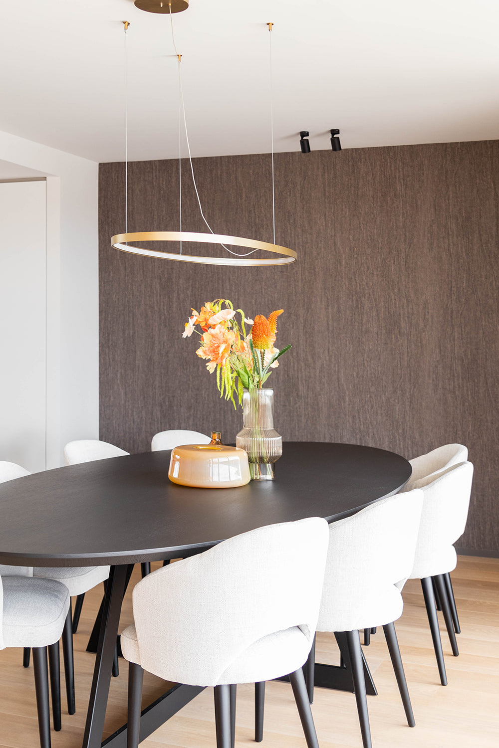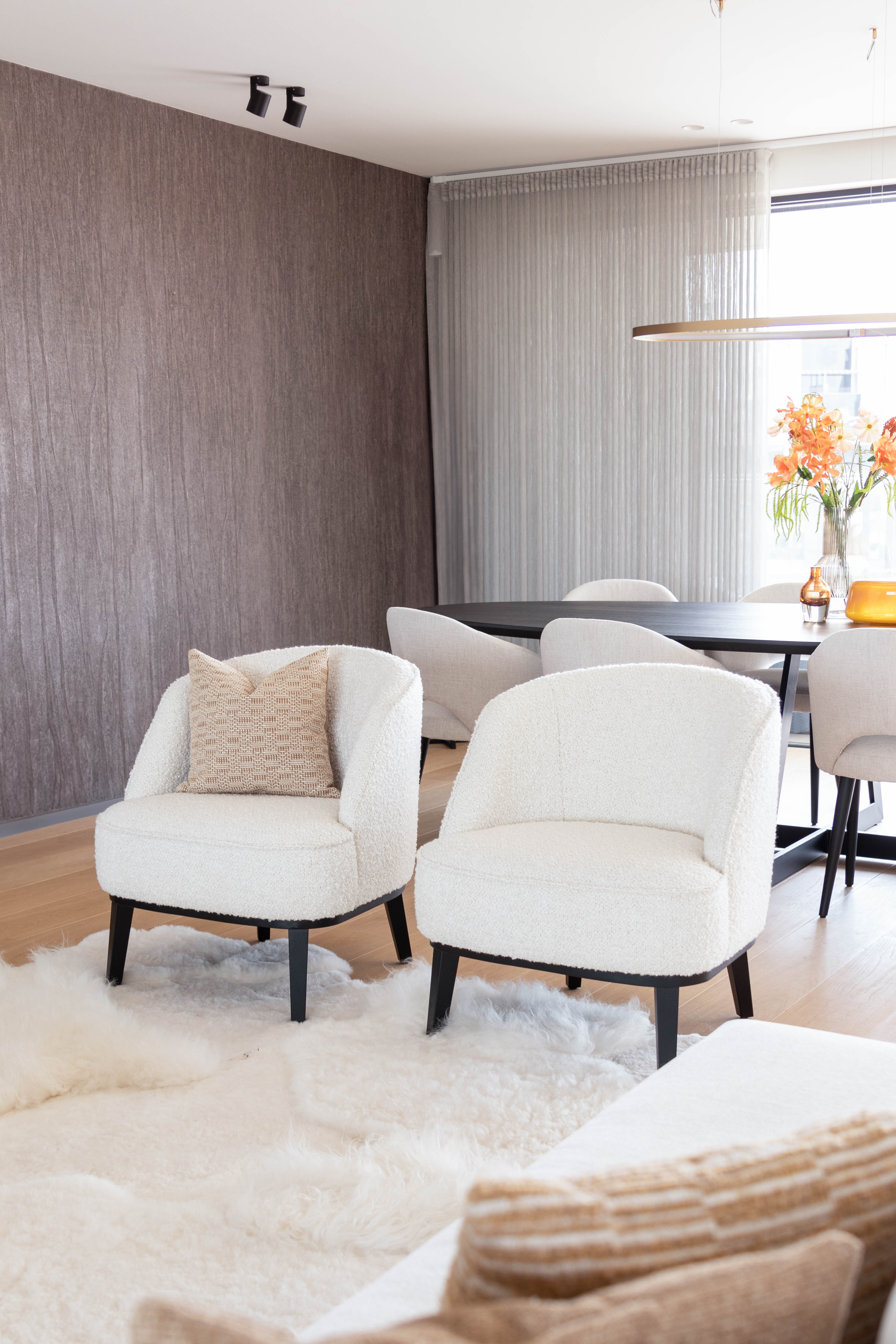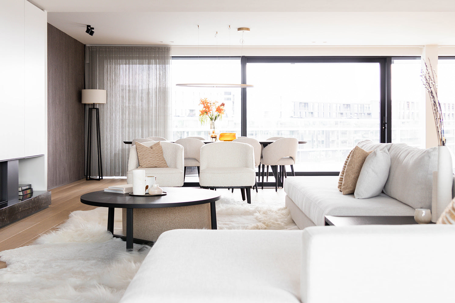 Een penthouse dat volledig is ingericht naar de wensen van de klant, met een harmonieuze balans tussen rechte en ronde vormen, is een toonbeeld van modern woondesign. De keuze voor beige en zachte tinten, gecomplementeerd met stijlvolle cognac accenten, creëert een rustgevende en elegante sfeer die naadloos aansluit bij de warmte van een parketvloer. Het uitzicht op het water voegt een extra dimensie toe aan de woonervaring. Dit alles vormt een woonruimte die niet alleen esthetisch aangenaam is, maar ook een oase van rust biedt in het drukke stadsleven.
