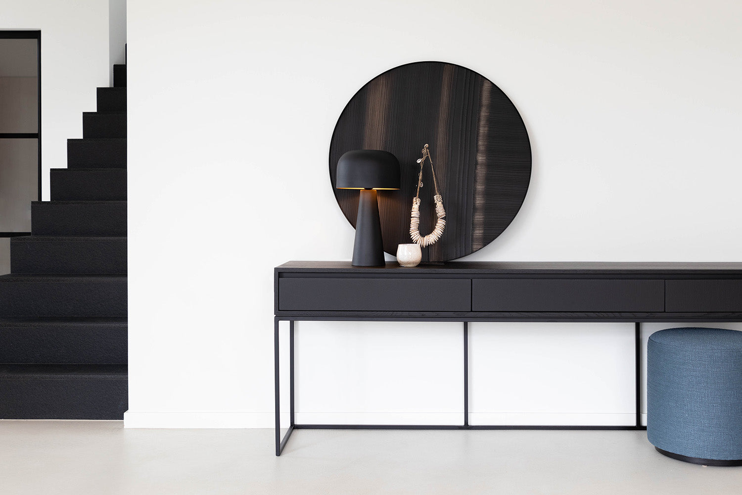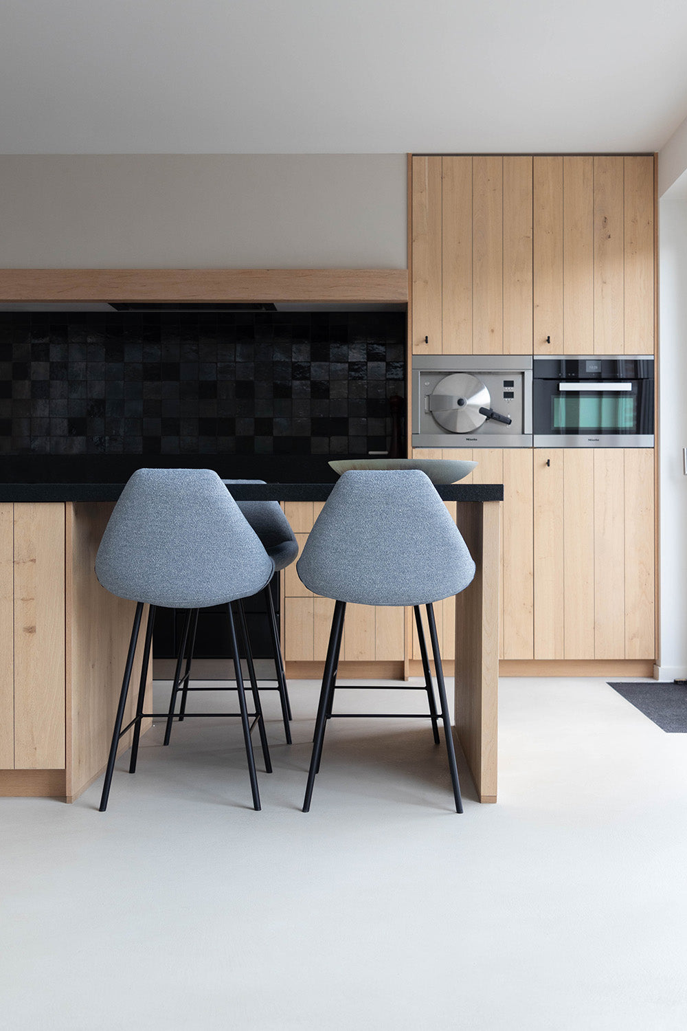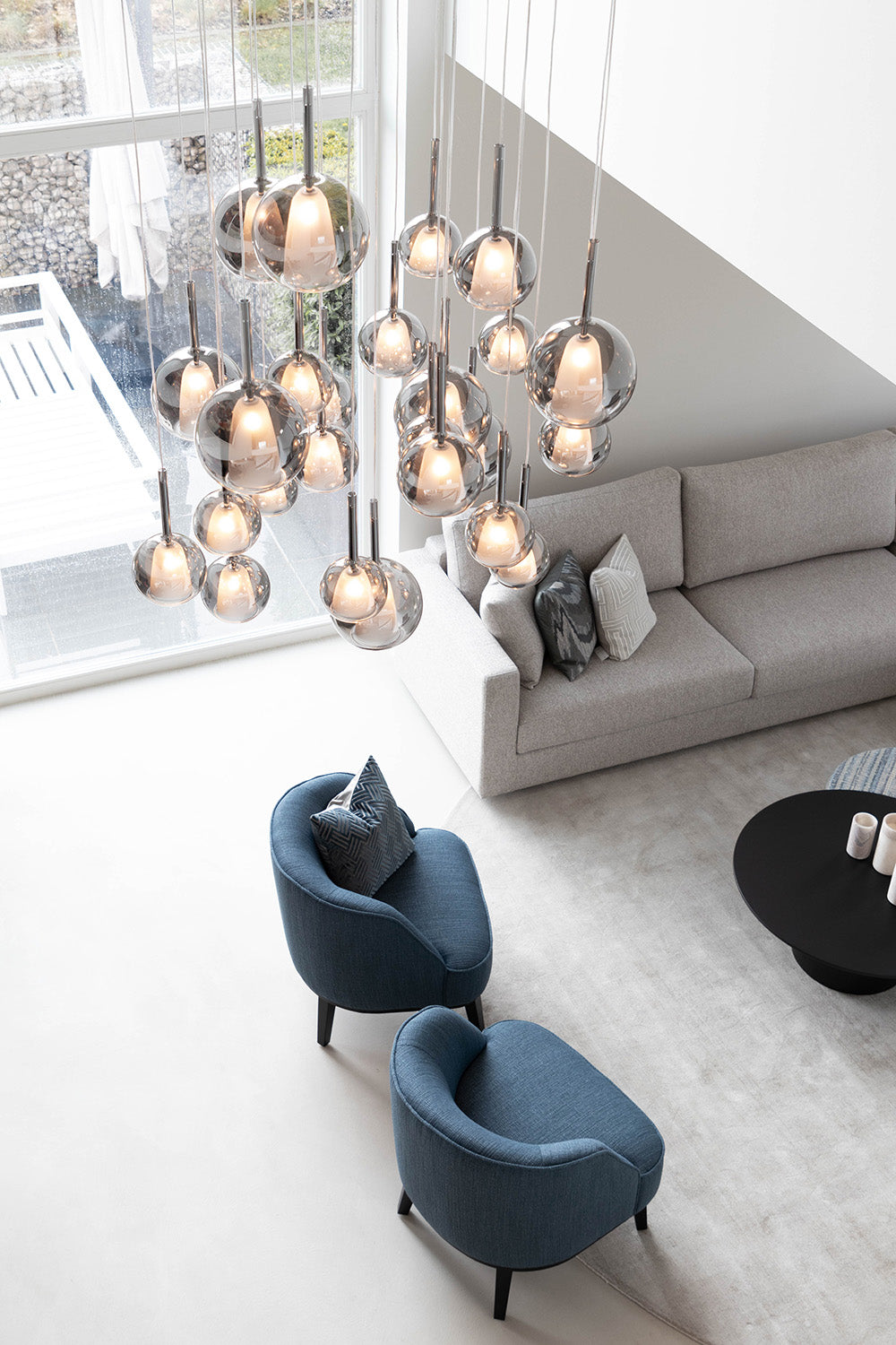 Een landelijk modern interieur project dat zich kenmerkt door een ruimtelijke openheid en een indrukwekkende vide, is een toonbeeld van hedendaagse designprincipes. De volledige inrichting, met op maat gemaakte meubels, zorgt voor een naadloze en functionele invulling van de ruimte. Het kleurenpalet, bestaande uit warme grijstinten en een zacht blauw, creëert een serene atmosfeer die uitnodigt tot ontspanning. Centraal in de bijbouw staat de organische keramische tafel Madrid die de aandacht trekt en dient als een natuurlijk middelpunt. Het echte pronkstuk is echter de hanglamp Saigon, die vanaf de tweede verdieping naar beneden zweeft en een visuele verbinding vormt tussen de twee niveaus. Dit element versterkt niet alleen de verticale dynamiek van de ruimte, maar dient ook als een subtiele gids voor het oog, die de harmonieuze overgang tussen de verdiepingen accentueert.