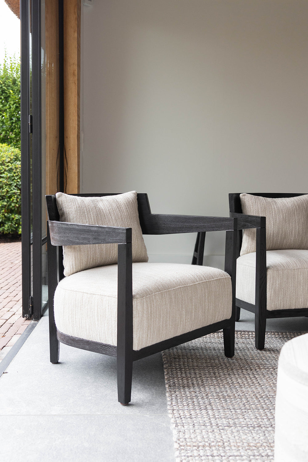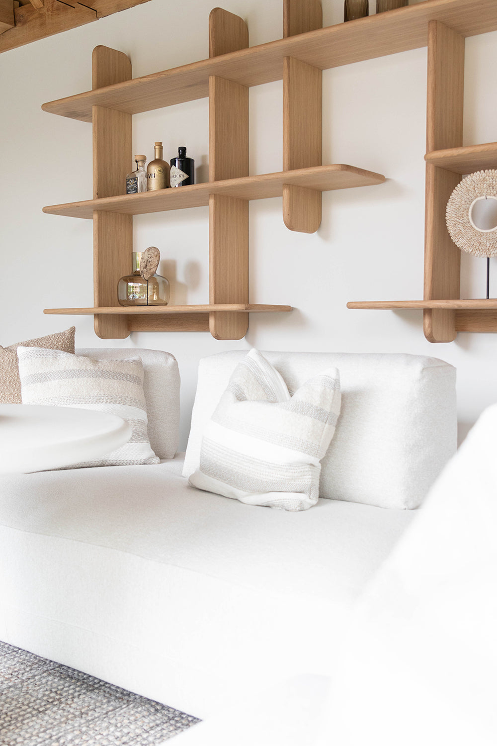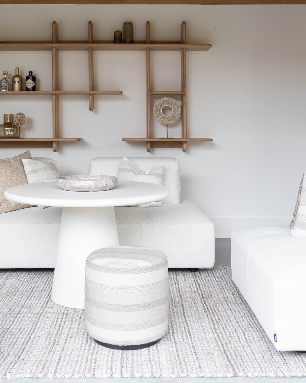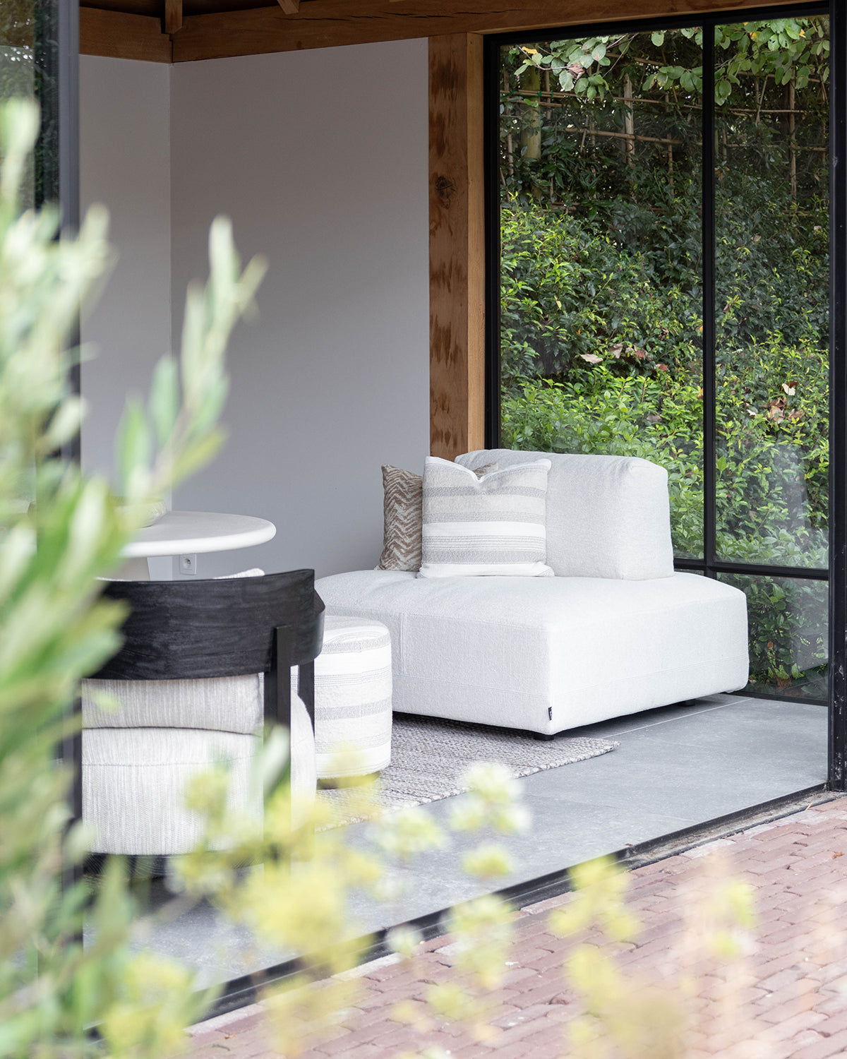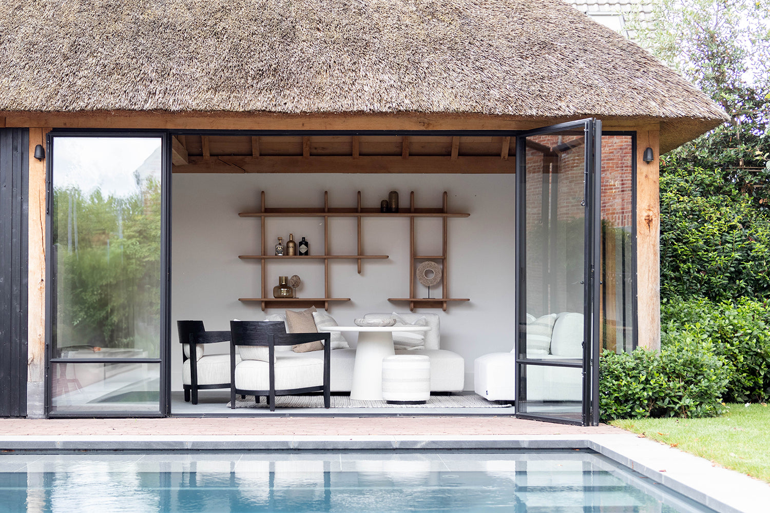 Dit poolhouse met een 'Indian Summer' sfeer is een uitstekende keuze voor wie een warme, uitnodigende ruimte wil creëren. Het gebruik van natuurlijk hout voor het opvallende rek Alberta draagt bij aan de organische en serene uitstraling, terwijl de ronde low dining tafel een centraal punt biedt dat zowel functioneel als esthetisch is. De Alanis sofa, met zijn losse rugsteunen, voegt een element van veelzijdigheid toe, perfect voor een ontspannen of sociale setting. De high-performance stoffen zijn een slimme keuze voor meubilair in een poolhouse, omdat ze duurzaamheid en gemakkelijk onderhoud bieden. De zorgvuldige afstemming van materialen en kleuren versterkt het gevoel van eenheid en rust in de ruimte, wat essentieel is voor een plek bedoeld voor ontspanning en vrije tijd.