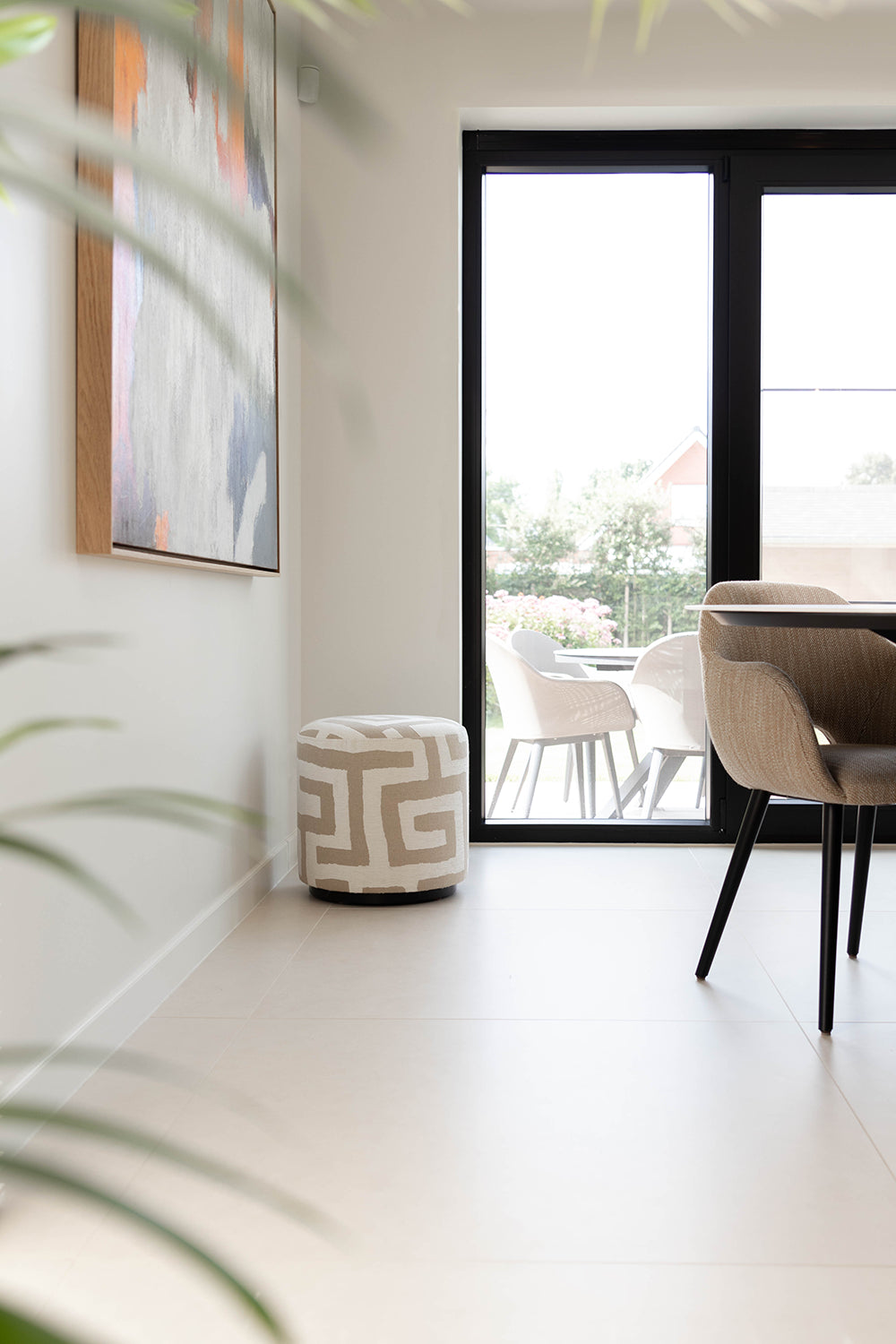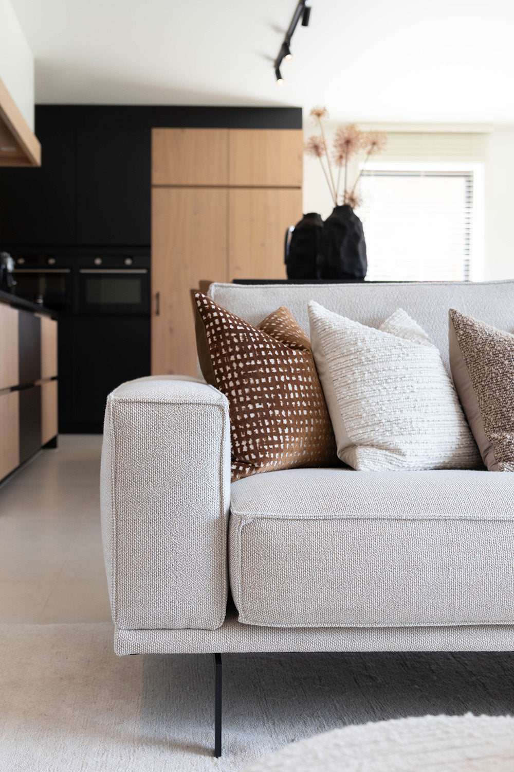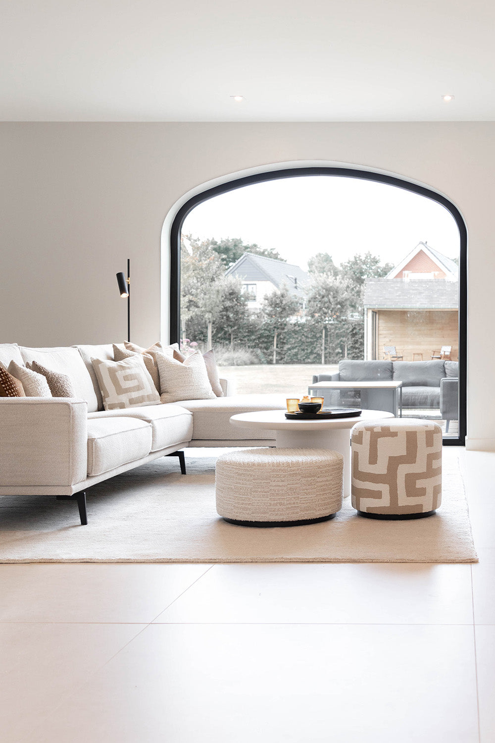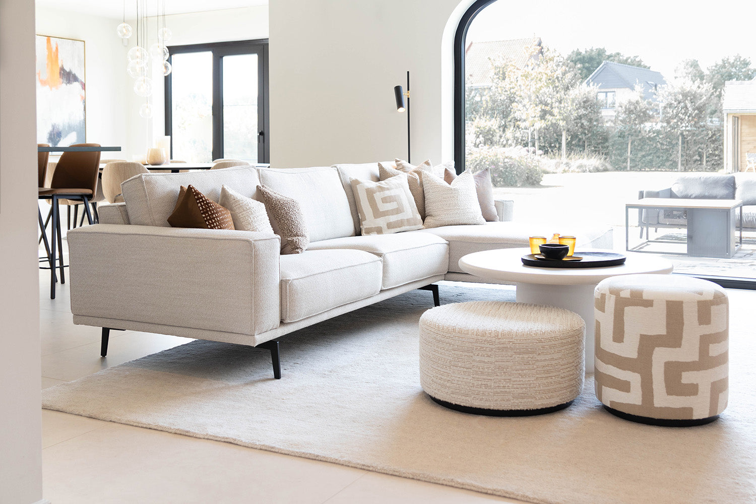 Het concept van 'slow living' in interieurdesign benadrukt een rustige en doordachte levensstijl, waarbij elk element zorgvuldig wordt gekozen om harmonie en rust te bevorderen. Een warm kleurenpalet met ton-sur-ton kleuren draagt bij aan een gezellige en uitnodigende sfeer. De keuze voor de sofa Abby op pootjes draagt bij aan een gevoel van ruimtelijkheid en luchtigheid, terwijl een keramische eettafel Madrid met een organische vorm de natuurlijke schoonheid van het materiaal benadrukt. Het toevoegen van planten in elke hoek van de ruimte brengt leven en frisheid, wat de filosofie van slow living verder onderstreept: het waarderen van de eenvoud en het vinden van schoonheid in het alledaagse.