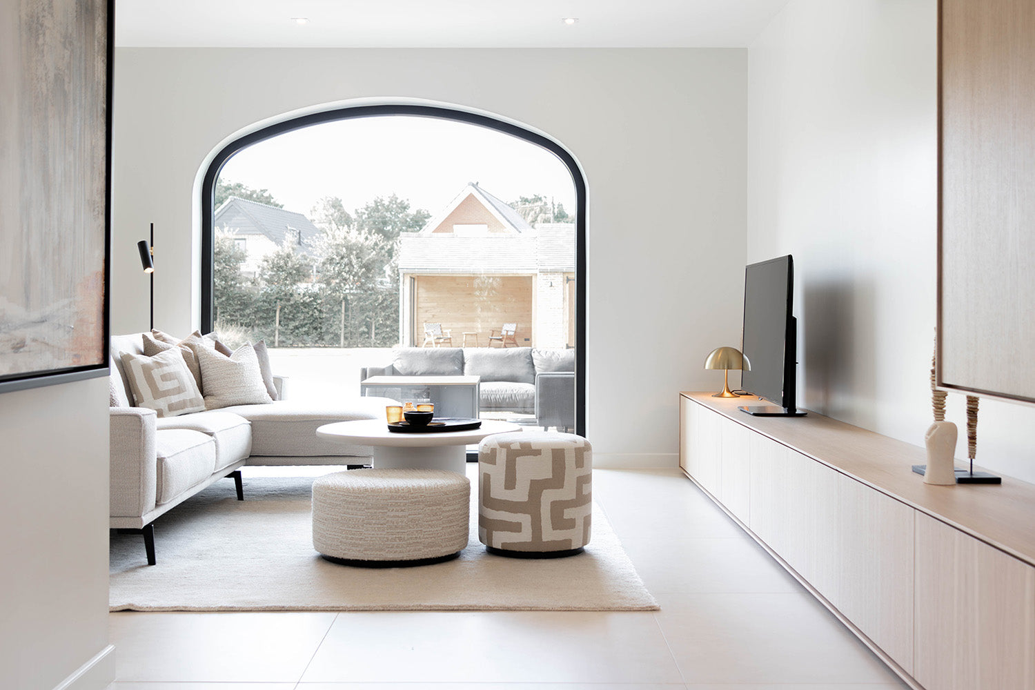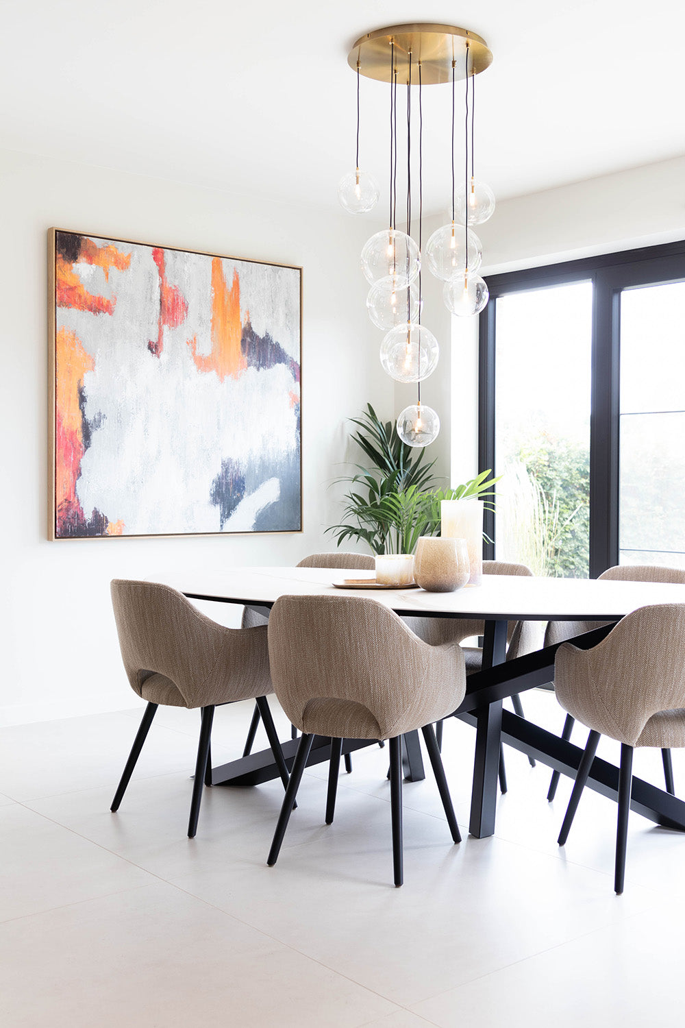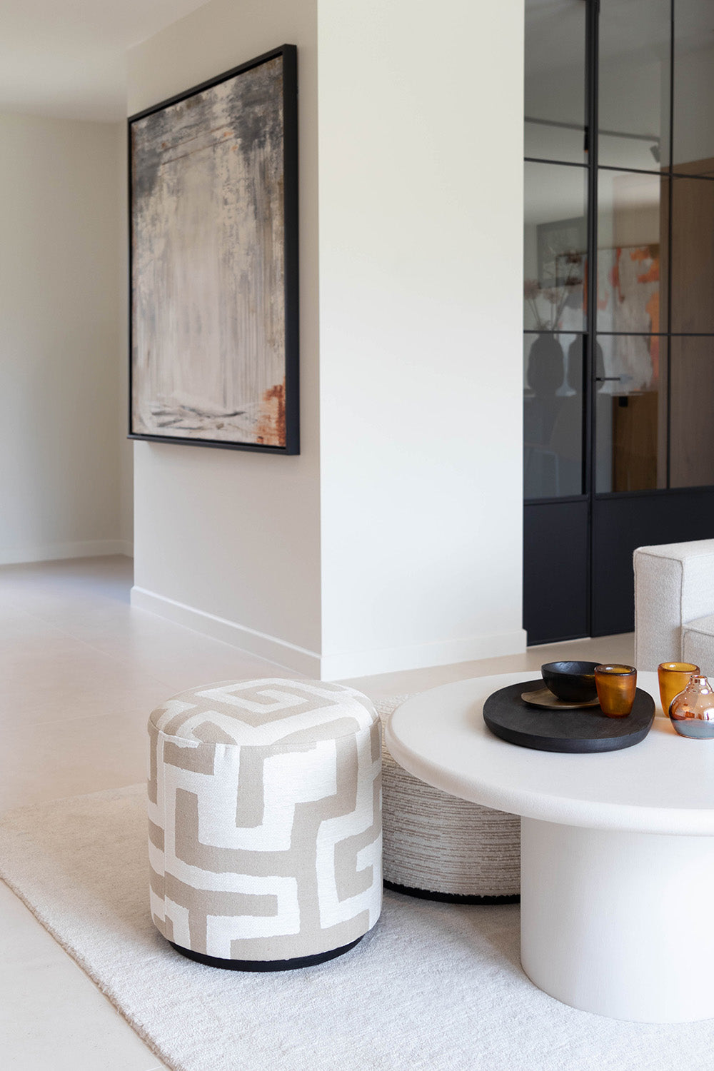 Het concept van 'slow living' in interieurdesign benadrukt een rustige en doordachte levensstijl, waarbij elk element zorgvuldig wordt gekozen om harmonie en rust te bevorderen. Een warm kleurenpalet met ton-sur-ton kleuren draagt bij aan een gezellige en uitnodigende sfeer. De keuze voor de sofa Abby op pootjes draagt bij aan een gevoel van ruimtelijkheid en luchtigheid, terwijl een keramische eettafel Madrid met een organische vorm de natuurlijke schoonheid van het materiaal benadrukt. Het toevoegen van planten in elke hoek van de ruimte brengt leven en frisheid, wat de filosofie van slow living verder onderstreept: het waarderen van de eenvoud en het vinden van schoonheid in het alledaagse.