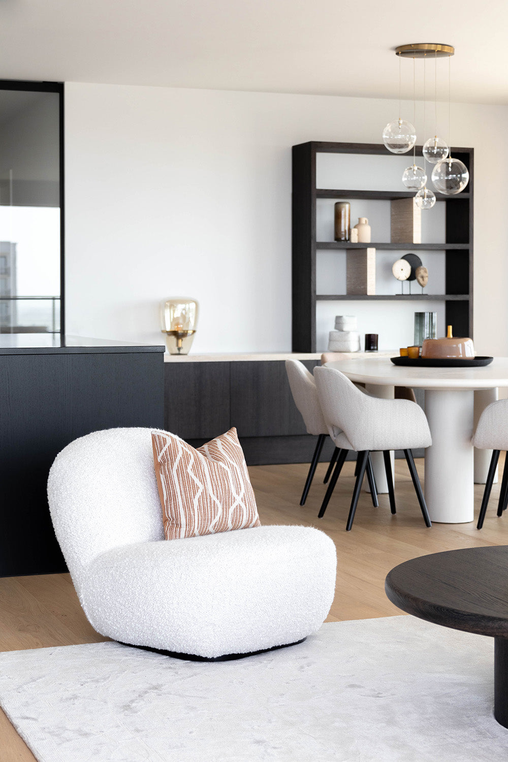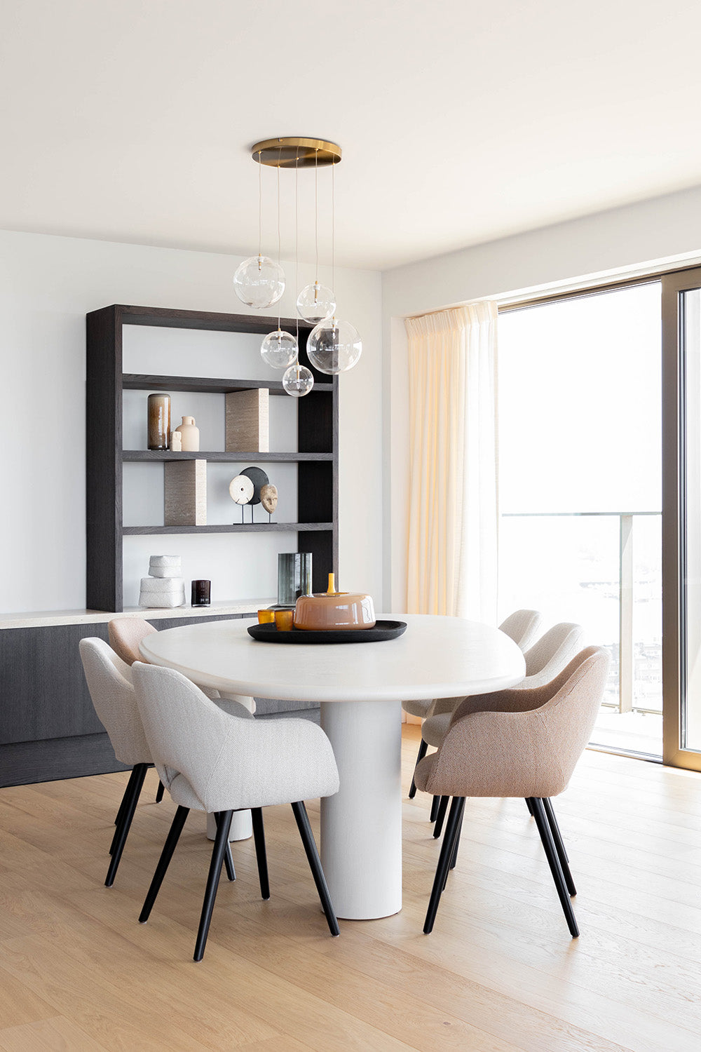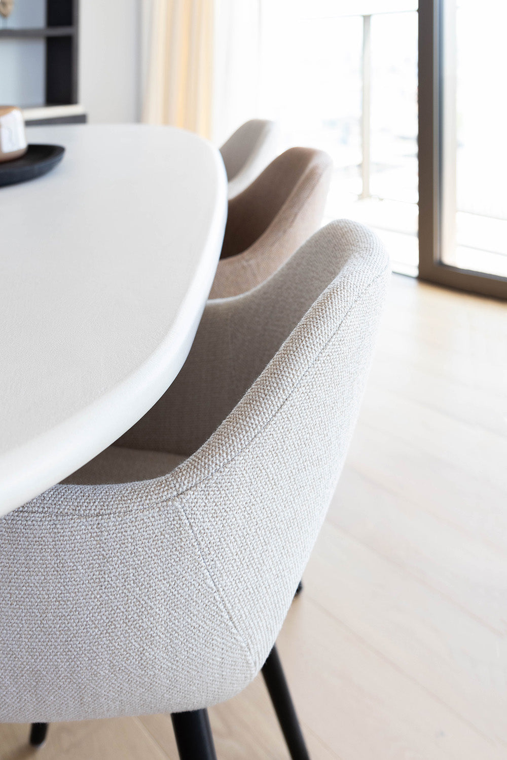 Het concept van een tweede verblijf in Oostende, met een nieuwbouw appartement dat een prachtig uitzicht op het water biedt, klinkt als een droom die uitkomt. De keuze voor een mortex tafel Soul, in combinatie met de donker warm houten kasten, creëert een luxe en uitnodigende sfeer. Het gebruik van warme kleuraccenten in de accessoires voegt een persoonlijke en gezellige touch toe aan het interieur, terwijl het frisse totaalbeeld zorgt voor een moderne uitstraling. Dit ontwerp benadrukt de schoonheid van natuurlijke materialen en kleuren, en maakt optimaal gebruik van het natuurlijke licht en het uitzicht, waardoor het appartement een perfecte plek is om te ontspannen en te genieten van de omgeving.