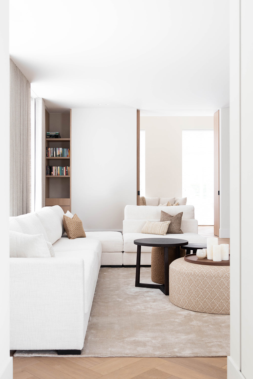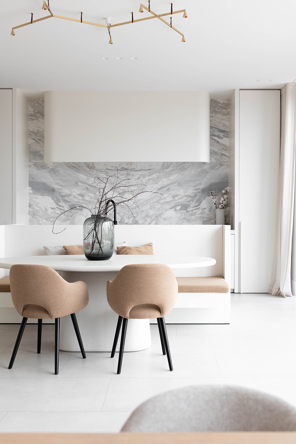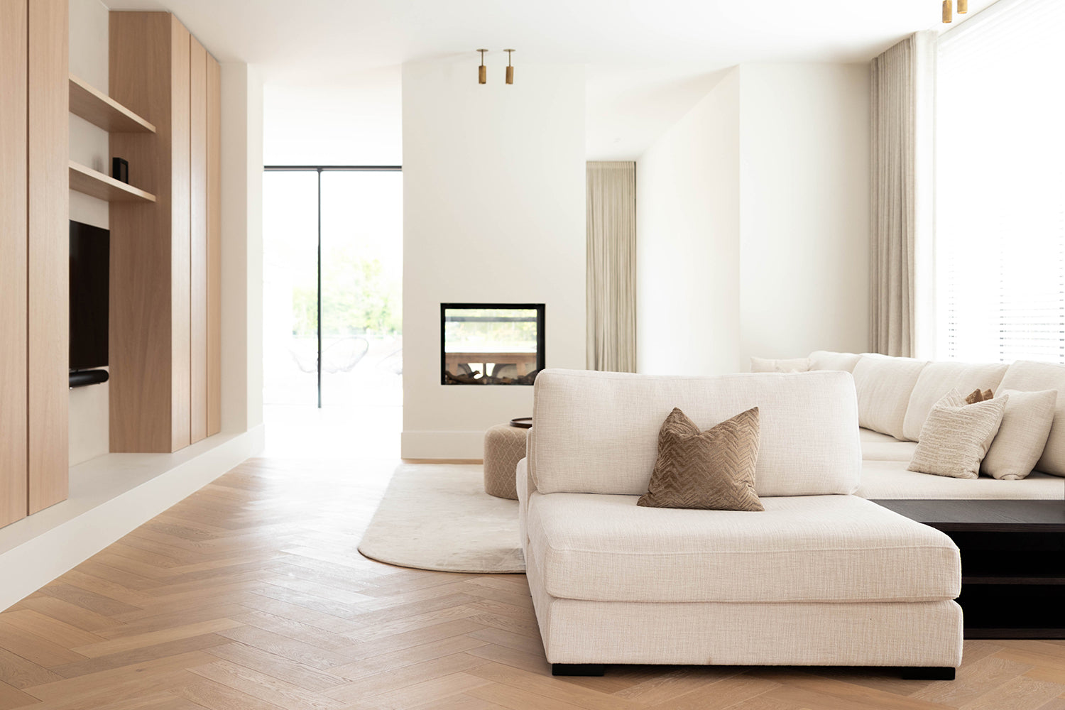 Een prachtig huis met hoge plafonds biedt een unieke kans om een interieur te creëren dat zowel groots als uitnodigend is. De sleutel tot het bereiken van een gezellige sfeer ligt in de selectie van meubels die de ruimte complementeren zonder deze te overweldigen. Door te kiezen voor stukken die de visuele ruimte respecteren, kan men een gevoel van openheid behouden terwijl de kamer toch warm en uitnodigend aanvoelt. Het gebruik van zorgvuldig gekozen kleuren en materialen die door de verschillende ruimtes heen consistent zijn, draagt bij aan een harmonieuze flow. De afwisseling tussen ronde en rechte vormen voegt een dynamisch element toe, waarbij de ronde vormen een zachte, speelse touch geven die de strakke lijnen van de rechte vormen verzachten. Dit zorgt voor een evenwichtige en aantrekkelijke esthetiek die zowel modern als tijdloos is. Het resultaat is een interieur dat de architecturale schoonheid van het huis versterkt en een omgeving creëert die zowel esthetisch als functioneel is.