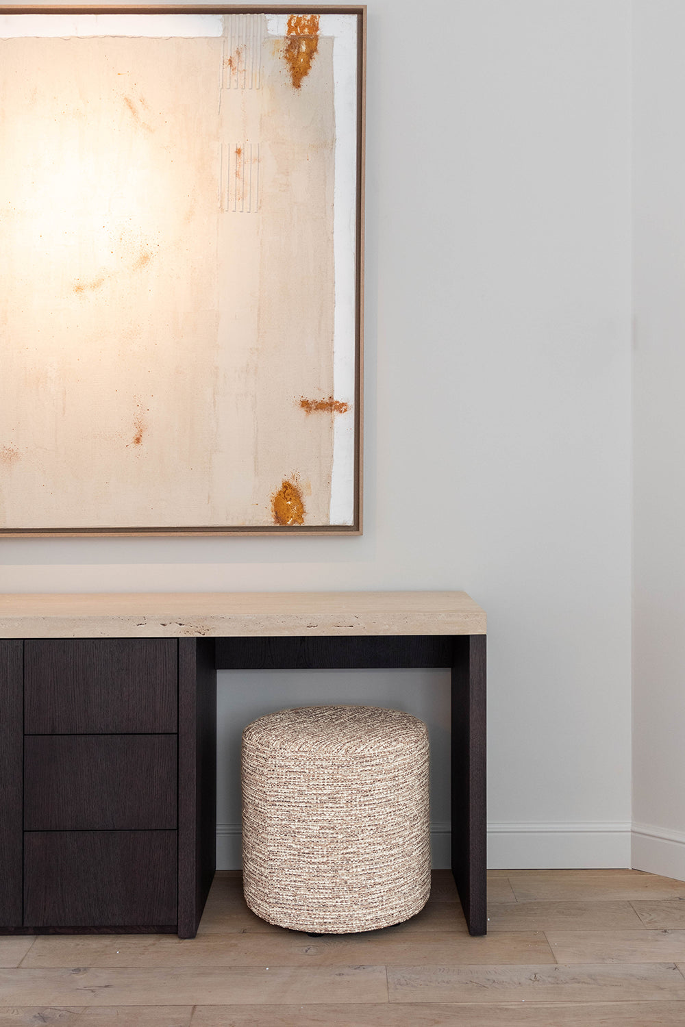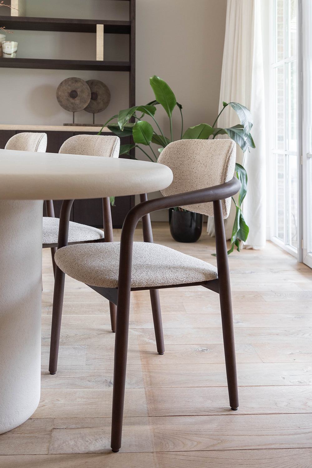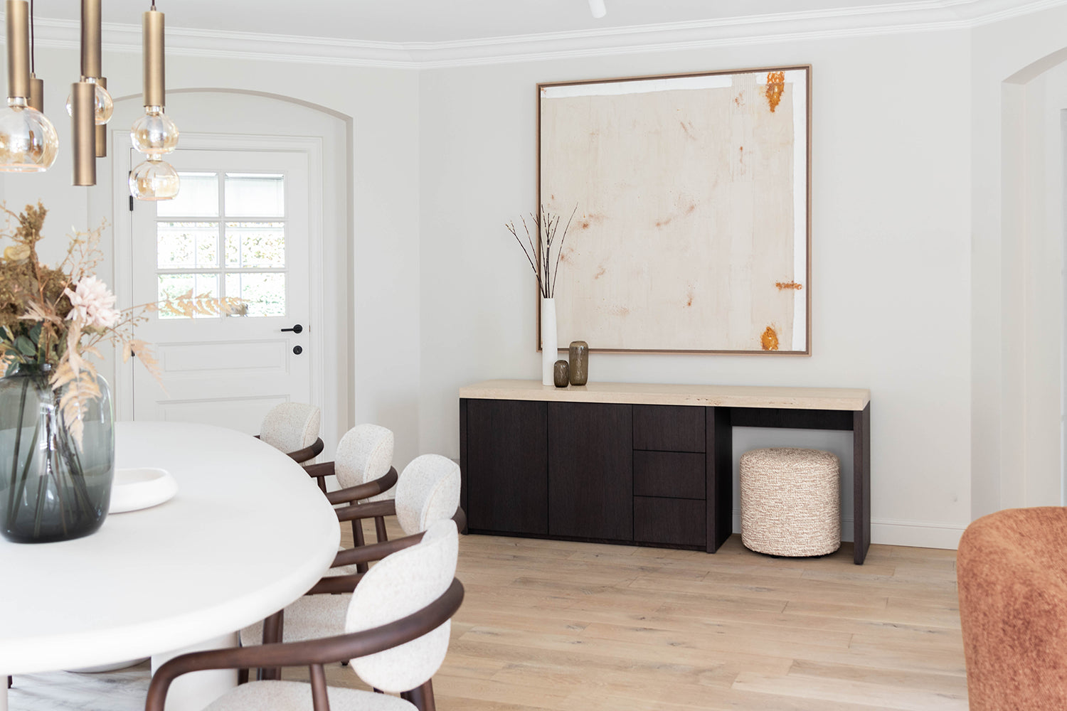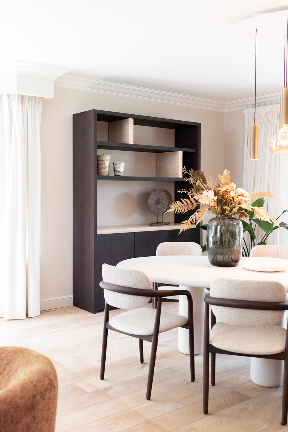 In dit interieurproject is er met zorg en oog voor detail gewerkt om een harmonieuze ruimte te creëren waar materialen en functionaliteit perfect samenkomen. De basis van het ontwerp ligt in het gebruik van natuurlijke en tijdloze materialen die elkaar versterken, zoals de combinatie van Mortex voor de tafel en houten kasten met een elegant travertijn blad. Slimme oplossingen zijn hier een belangrijk aspect. zoals te zien is in de dressoir kast ingericht als een subtiel bureau. Dit maakt thuiswerken niet alleen praktisch, maar ook gezellig. De keuze voor natuurlijke materialen en ingetogen kleuren maakt dat het werkgebied niet voelt als een aparte werkruimte, maar juist als een verlengstuk van de woonkamer, wat zorgt voor een prettige werksfeer zonder afstand van het huiselijke comfort. Een gezellige zetel voor de hele familie maakt het plaatje compleet. De ruime bank is een uitnodiging om samen tijd door te brengen, te relaxen en te genieten van de warme, comfortabele sfeer die de ruimte biedt.