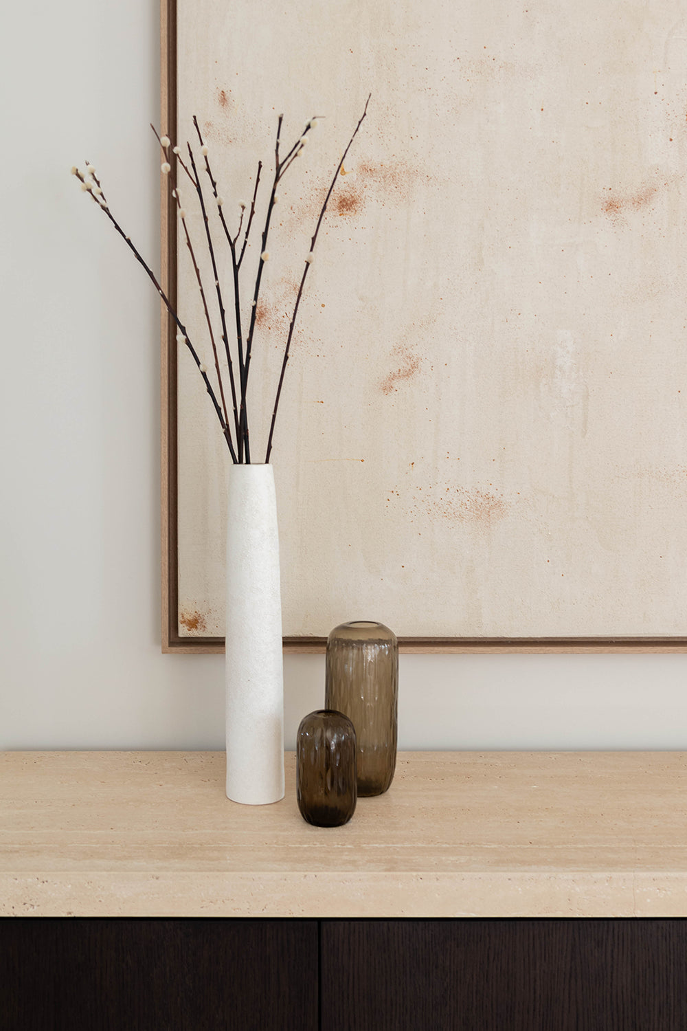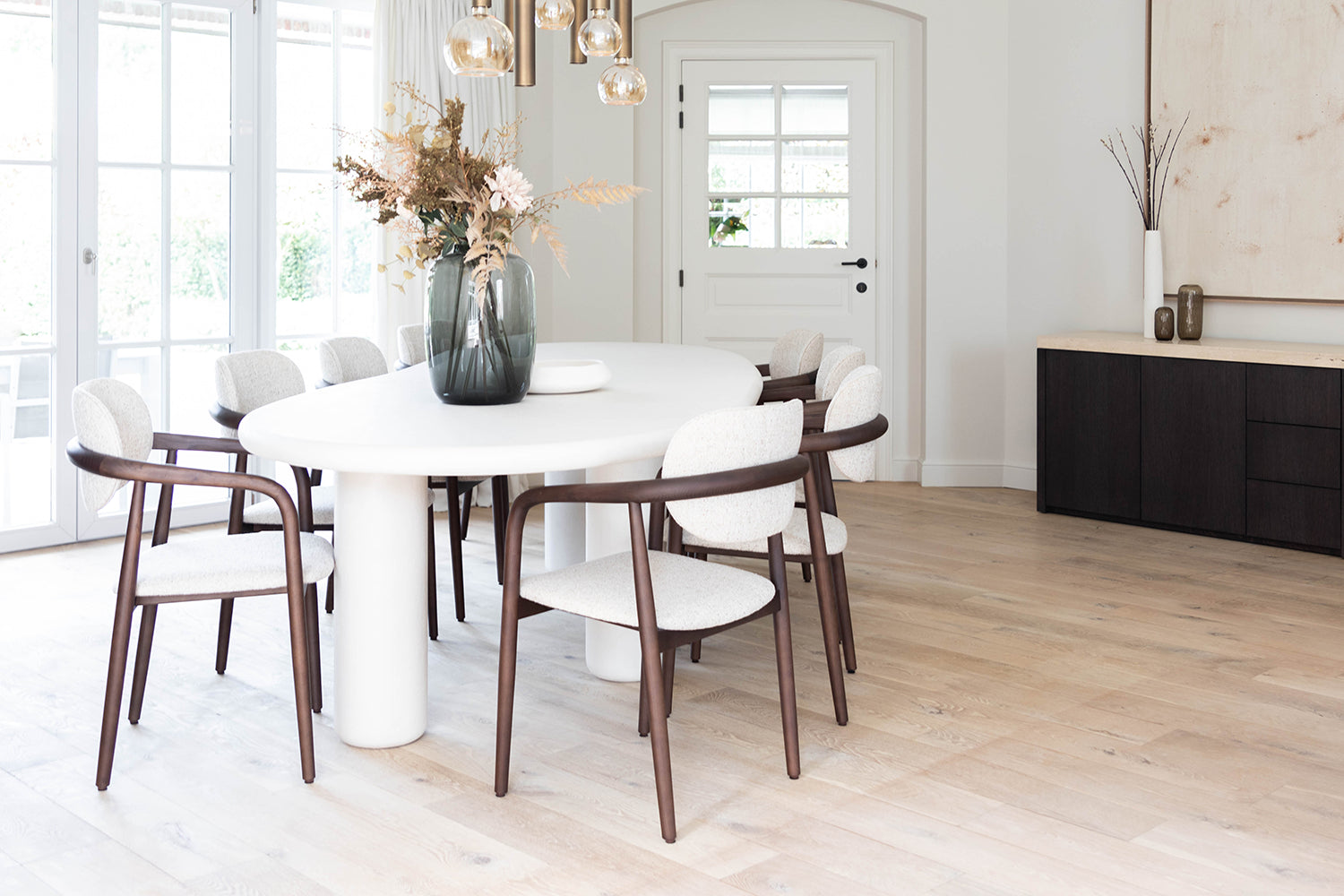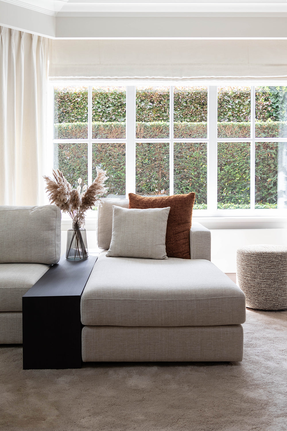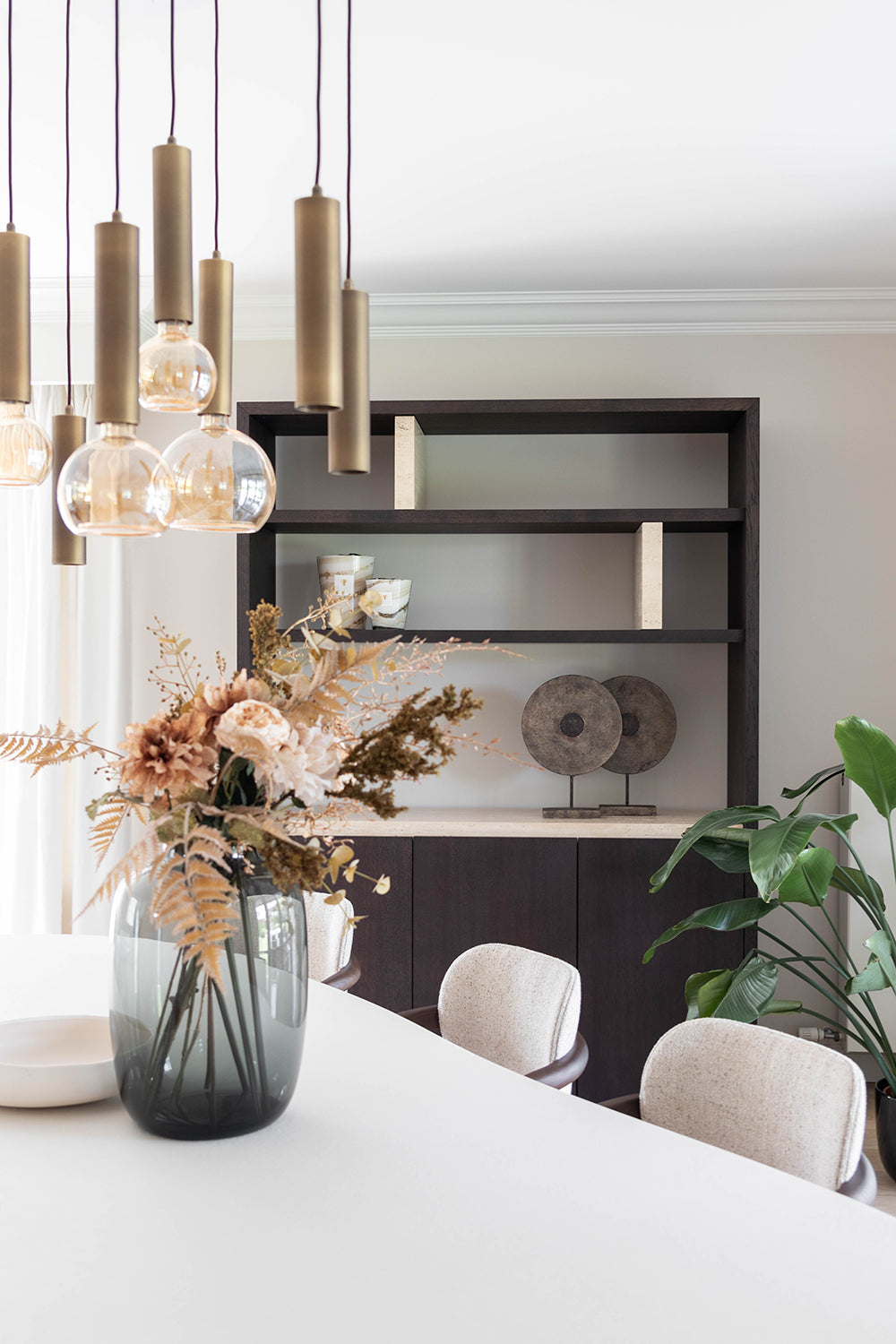In dit interieurproject is er met zorg en oog voor detail gewerkt om een harmonieuze ruimte te creëren waar materialen en functionaliteit perfect samenkomen. De basis van het ontwerp ligt in het gebruik van natuurlijke en tijdloze materialen die elkaar versterken, zoals de combinatie van Mortex voor de tafel en houten kasten met een elegant travertijn blad. Slimme oplossingen zijn hier een belangrijk aspect. zoals te zien is in de dressoir kast ingericht als een subtiel bureau. Dit maakt thuiswerken niet alleen praktisch, maar ook gezellig. De keuze voor natuurlijke materialen en ingetogen kleuren maakt dat het werkgebied niet voelt als een aparte werkruimte, maar juist als een verlengstuk van de woonkamer, wat zorgt voor een prettige werksfeer zonder afstand van het huiselijke comfort. Een gezellige zetel voor de hele familie maakt het plaatje compleet. De ruime bank is een uitnodiging om samen tijd door te brengen, te relaxen en te genieten van de warme, comfortabele sfeer die de ruimte biedt.