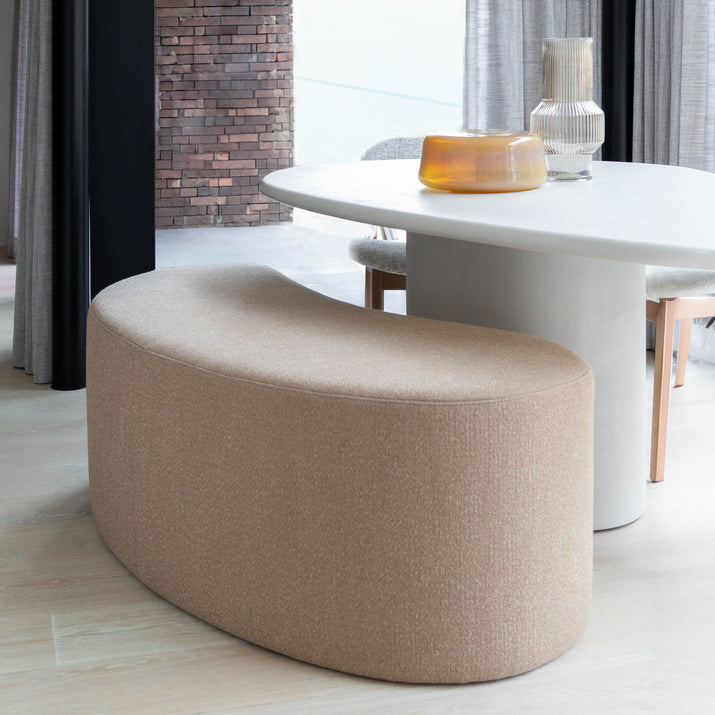 De Riverside halfronde zitbank poef is een veelzijdig meubelstuk dat perfect past bij organische of ovale tafels, waardoor het een ideale keuze is voor wie op zoek is naar comfort en stijl in één. Met zijn zachte rondingen en elegante design, biedt deze zitbank een speelse uitstraling en een uitnodigende sfeer in elke ruimte. Het is niet alleen een praktische toevoeging aan uw woonkamer, maar ook een stijlvol statement dat de aandacht trekt en een vleugje sierlijkheid toevoegt aan uw interieur. De Bank Riverside is online verkrijgbaar in 5 kleuren van de vlekwerende Aquaclean stof Camila. Voor andere stoffen of maatwerk kan je terecht in onze Concept Store.