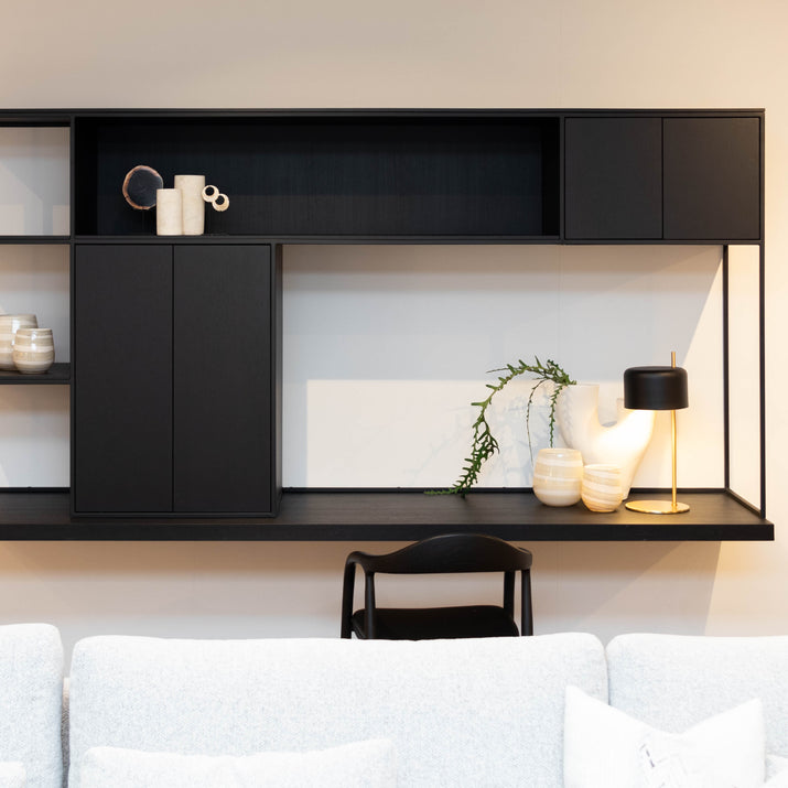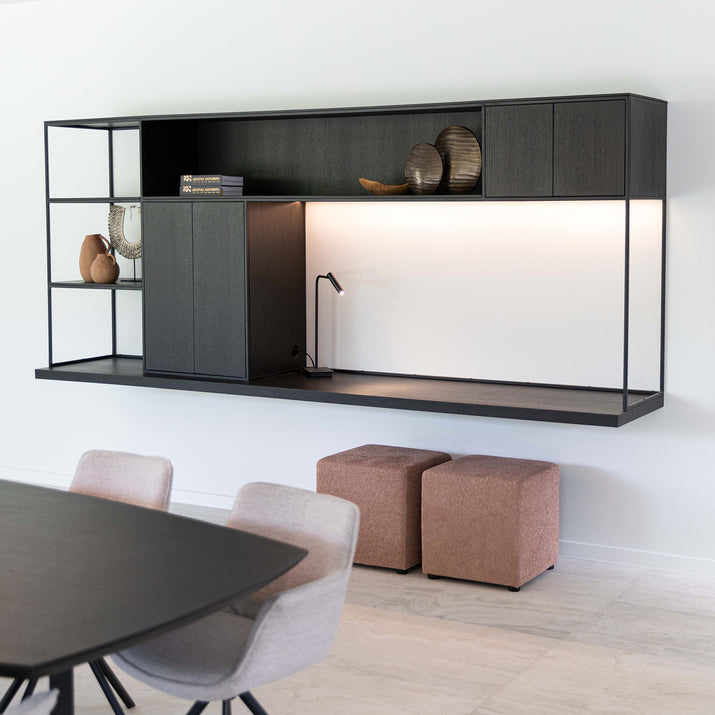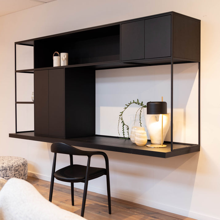De hangende bureau Plaza combineert elegantie en functionaliteit met een verfijnde samenwerking van metaal en hout. Dit stijlvolle meubelstuk beschikt over open legplankjes voor gemakkelijke toegang en gesloten push-to-open kastjes voor een opgeruimde uitstraling. Het dikke werkblad biedt een stevige en stabiele werkruimte, ideaal voor zowel thuiswerken als studeren. De Plaza is niet alleen een praktische oplossing, maar ook een decoratieve toevoeging aan je interieur, die een moderne en georganiseerde sfeer creëert. Voeg een vleugje verfijning toe aan je werkruimte met de veelzijdige en elegante hangende bureau Plaza. Hangende bureau Plaza is volledig op maat te voorzien, voor meer informatie kan je terecht in onze Concept Store.