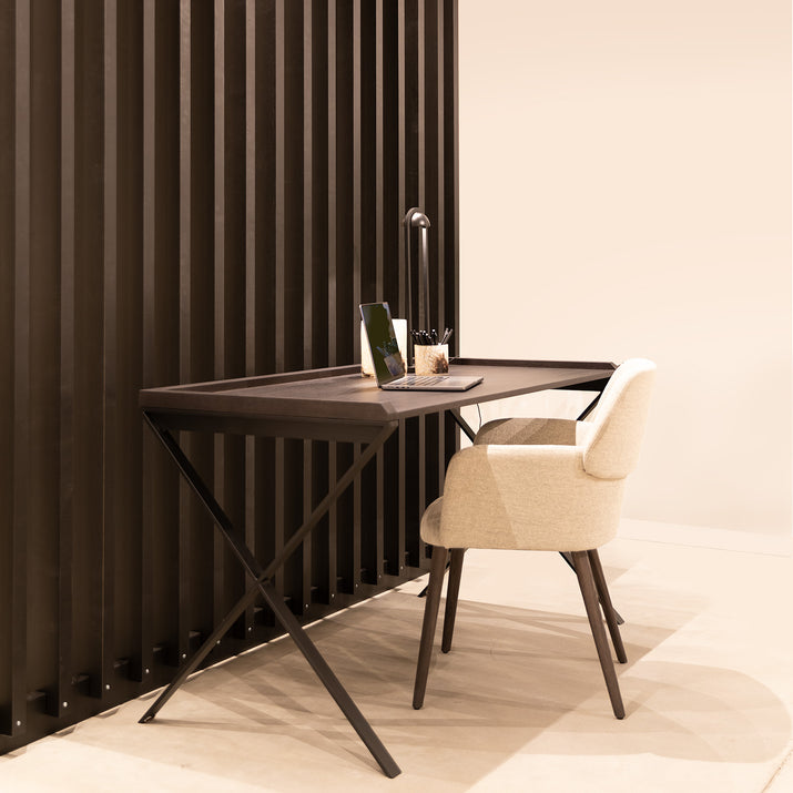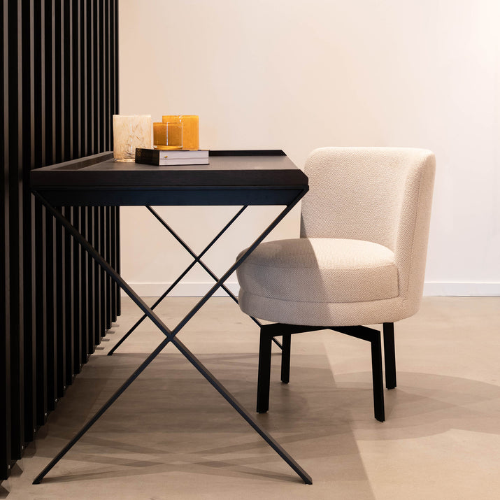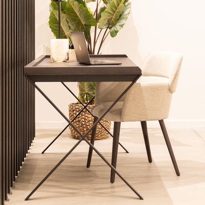 Het Bureau Camy belichaamt een slank en stijlvol ontwerp dat zowel fijn als tijdloos is. Het subtiele opstaande randje voegt een verfijnd detail toe, terwijl de kruispoot een uniek uiterlijk biedt dat het bureau onderscheidt van andere meubelstukken. Dit bureau is niet alleen een functionele werkplek, maar ook een statement van smaak die naadloos aansluit bij diverse interieurstijlen.Er zijn verschillende kleuren en maten mogelijk. Voor maatwerk of meer informatie kan u terecht in onze Concept Store.