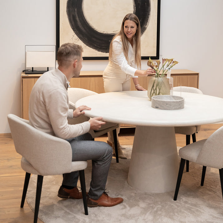 De eettafel Cordoba is een stijlvolle designtafel die past bij de populaire trend van mortex. Mortex is een materiaal dat onderhoudsvriendelijk, krasvast en waterdicht is. Het geeft een natuurlijke look aan jouw interieur, met een subtiele glans en een zachte textuur. De ronde eettafel Cordoba heeft afgeronde zijkanten die zorgen voor een elegante uitstraling. De centrale conische tafelpoot geeft de tafel een luchtig en ruimtelijk gevoel. De eettafel Cordoba is in verschillende kleuren en afmetingen verkrijgbaar, zodat u de tafel kunt afstemmen op uw smaak en stijl. We kunnen deze volledig op maat afwerken, voor meer informatie kan u terecht in onze Concept Store