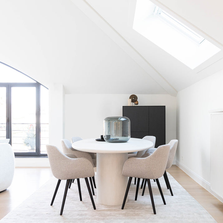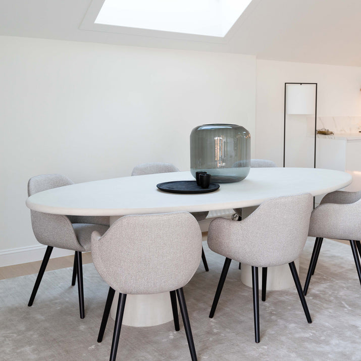 De eettafel Marley is een moderne tafel met een ovalen tafelblad. Het tafelblad is gemaakt van mortex, een combinatie van cement en kalk. Mortex is een onderhoudsvriendelijk, krasvast en waterdicht materiaal met een natuurlijke look. De afgeronde zijkanten van het tafelblad geven de tafel een zachte uitstraling. De eettafel Marley heeft twee ronde tafelpoten, die zorgen voor een stabiele en stevige basis. De eettafel Marley is een ideale keuze voor wie houdt van een strak en eigentijds design. Verkrijgbaar in verschillende kleuren en afmetingen om aan jouw wensen te voldoen, voor meer informatie kan u terecht in onze Concept Store.
