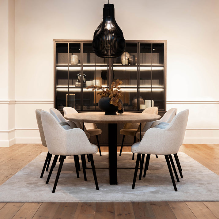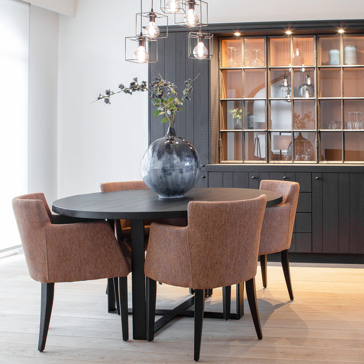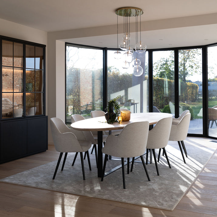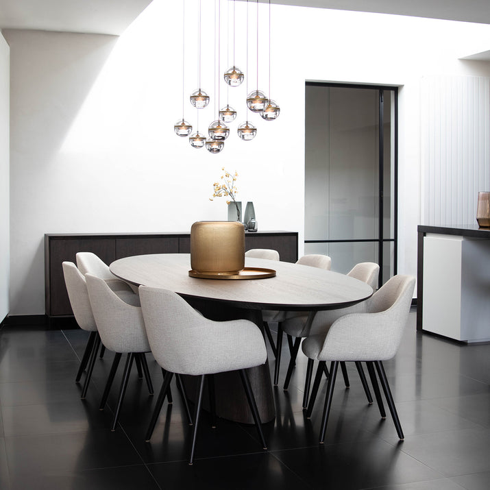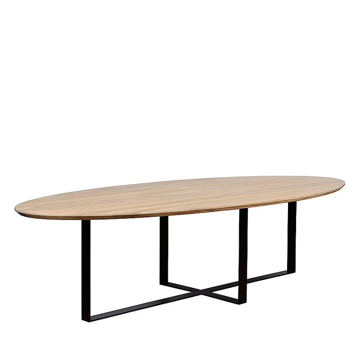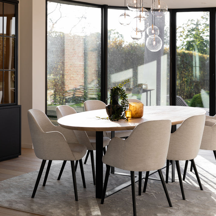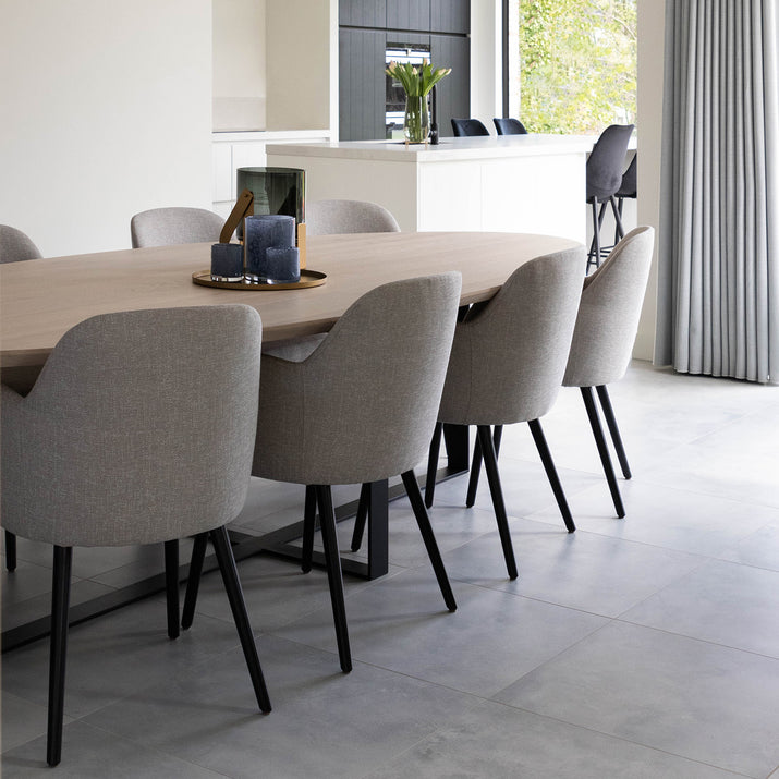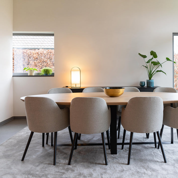 De eettafel Spencer is een stijlvolle en moderne tafel die perfect past in elk interieur. Het ovaal tafelblad is gemaakt van eikenhout en is verkrijgbaar in verschillende afmetingen. Het tafelblad heeft een dikte van 4 cm en is schuin afgewerkt voor een elegant effect. De metalen rechthoekige poten geven de tafel een stoere uitstraling. Vanuit de voorkant gezien zijn de poten dik, maar vanuit de zijkant zijn ze dun, wat zorgt voor een interessant contrast. De eettafel Spencer kan ook op maat gemaakt worden om aan uw wensen te voldoen, voor meer informatie kan je terecht in de Concept Store.