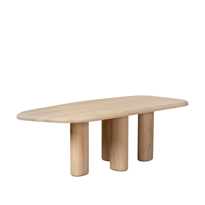De Eettafel Syrus is een echte blikvanger dankzij zijn unieke vorm en onderscheidende design. Het blad is voorzien van een schuine randafwerking, wat zorgt voor een verfijnd, maar toch stoer karakter. De grove afwerking van het hout benadrukt de natuurlijke charme en geeft de tafel een robuuste uitstraling. Wat deze tafel extra bijzonder maakt, zijn de verschillende pootopties, waarmee je de stijl perfect kunt afstemmen op jouw interieur. Of je nu gaat voor modern, industrieel of landelijk, de Eettafel Syrus brengt karakter en warmte in elke eetruimte en nodigt uit tot lange, gezellige momenten aan tafel. Beschikbaar in verschillende houtkleuren.