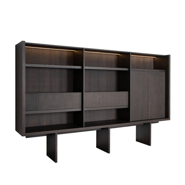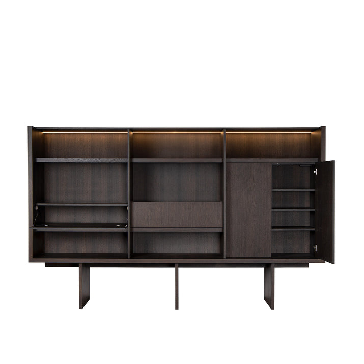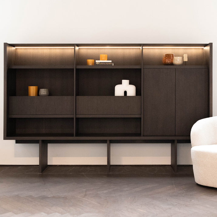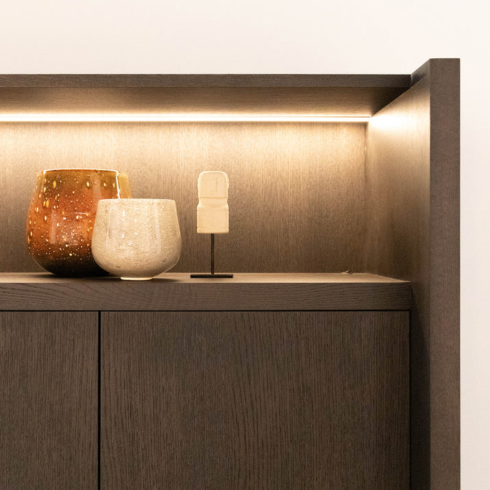 Cabinet Marris is een echte retro kast en daarbij ook meteen een opvallend stuk. Bij dit model komen functionaliteit en esthetiek samen in een harmonieuze compositie. Met een combinatie van traditionele deuren, moderne valdeuren en strategisch geplaatste open ruimtes, biedt dit meubelstuk zowel opbergruimte als een platform voor decoratieve displays. Rustend op een stevige houten voet, straalt het een tijdloze charme uit. De toevoeging van LED-verlichting, met de mogelijkheid om te schakelen tussen verschillende kleuren en indelingen, voegt een eigentijds tintje toe aan deze klassieke kast, waardoor het een veelzijdig en sfeervol element wordt in elk interieur. Om zelf je kast te ontwerpen kan je terecht in onze Concept Store.