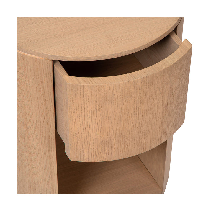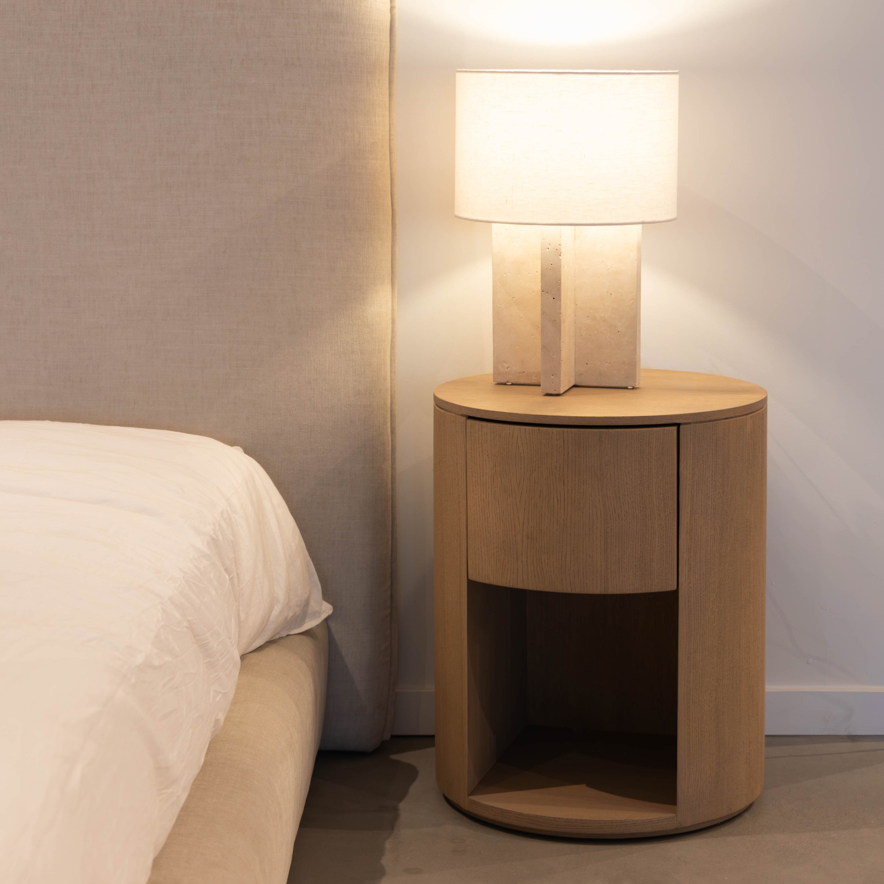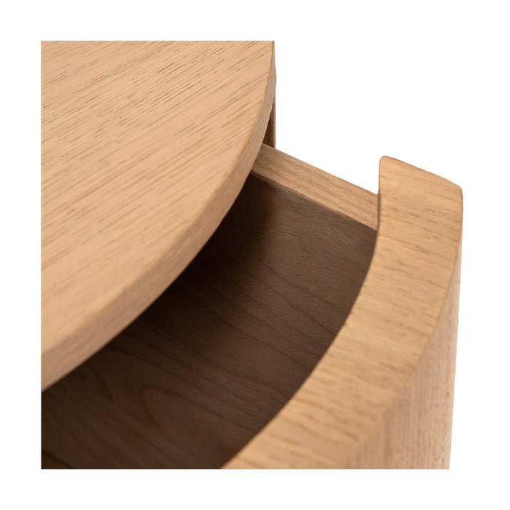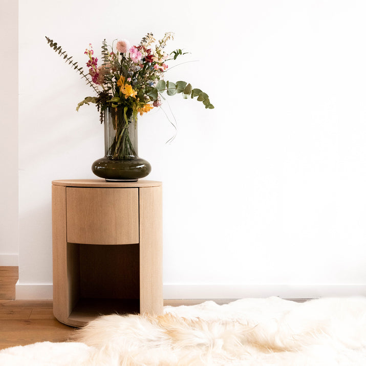 De Nachttafel Martha in eik is een stijlvolle toevoeging aan de slaapkamer met zijn sokkelvormige ontwerp en subtiele designlook. Het schuifje is slim weggewerkt, wat bijdraagt aan de strakke en moderne uitstraling. Dit nachtkastje combineert functionaliteit met esthetiek en biedt een unieke look die in elke slaapkamer past. Het is een prachtig voorbeeld van hoe design en praktische opbergruimte hand in hand kunnen gaan.Voor meer informatie kan je terecht in onze Concept Store.